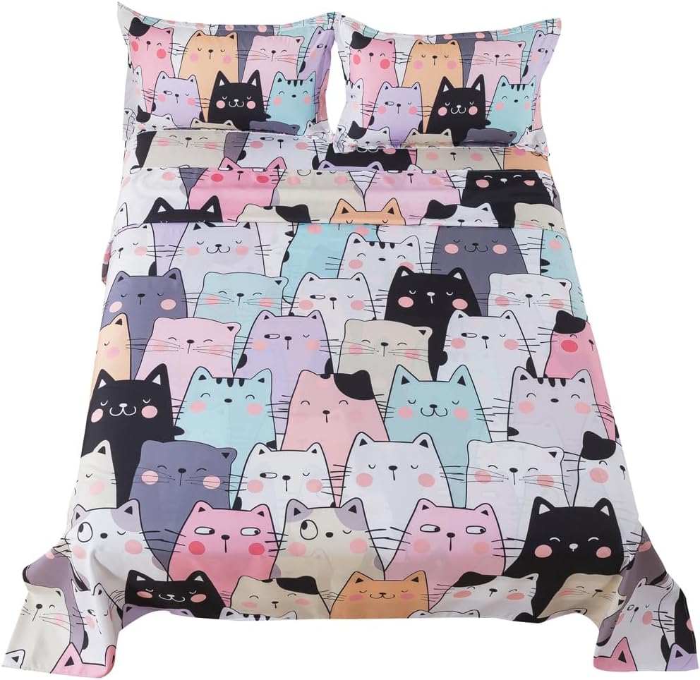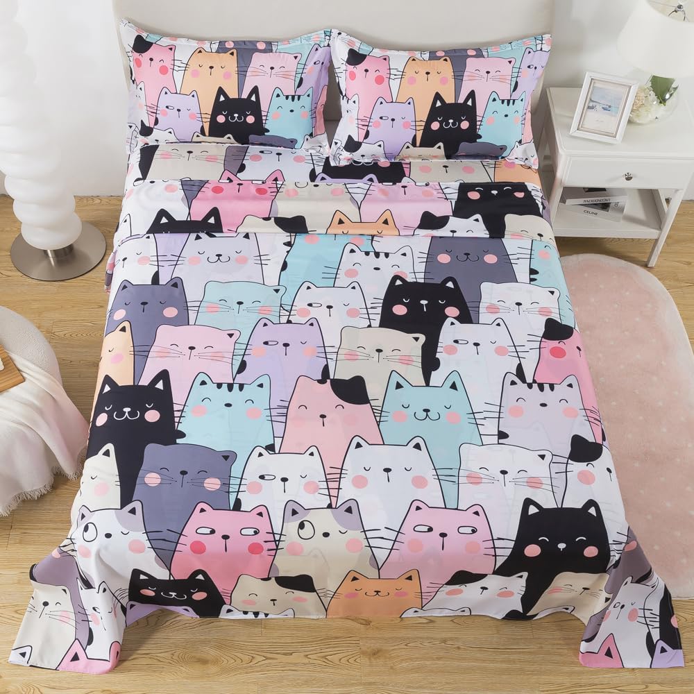 Transform your child's bedroom into a cozy and playful haven with this charming 4-piece cat bedding set. Perfect for little ones who love all things feline, it includes a 81" x 96" flat sheet, a 54" x 75" fitted sheet with a 14" deep pocket, and two 20" x 30" pillowcases. Designed with comfort and style in mind, it adds a whimsical touch to any sleeping area â whether it's a bedroom, guest room, or even a vacation home.