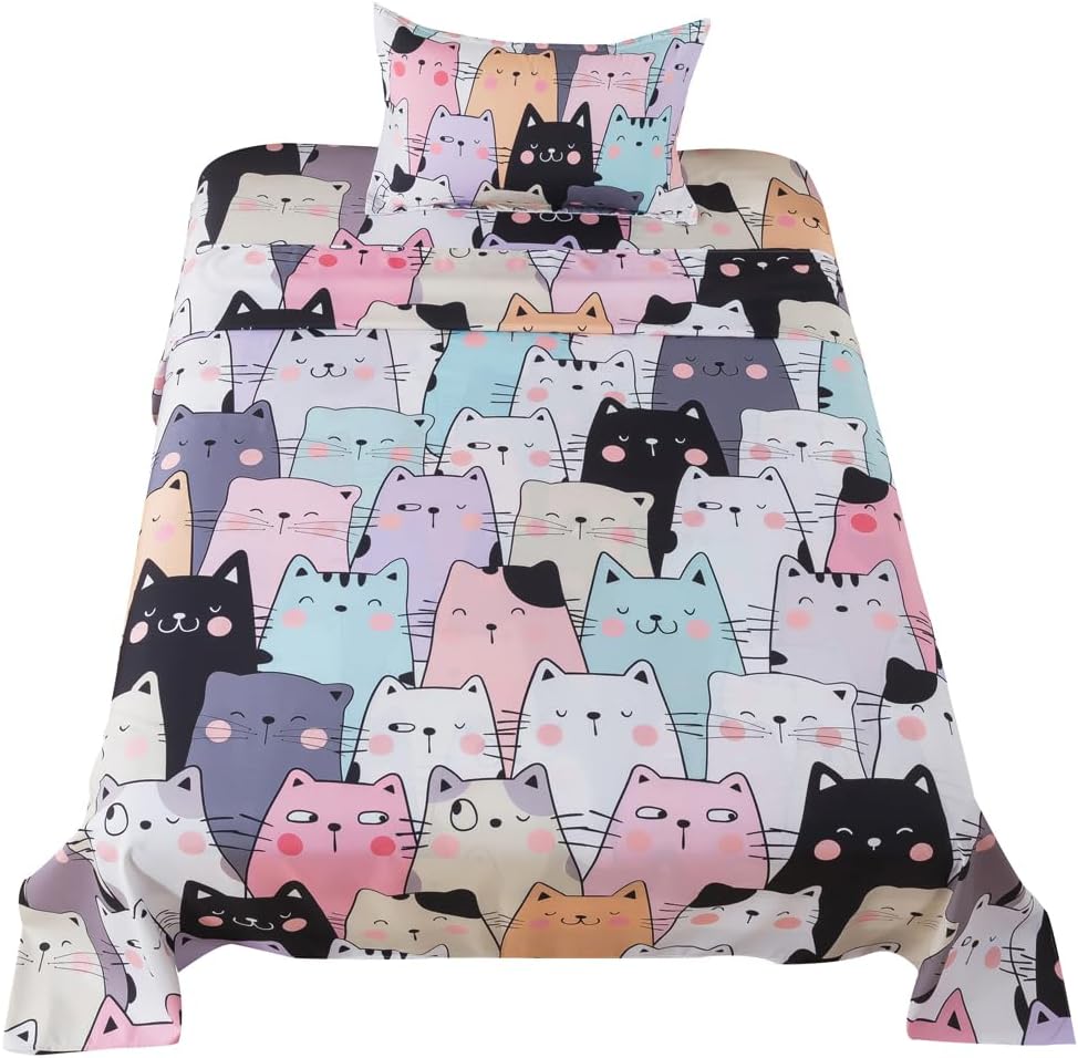 Featuring vibrant cartoon cat designs that come to life with 3D reactive printing, these sheets are sure to delight young ones and add a sense of wonder to every night. The twin-sized set includes a flat sheet, fitted sheet, and pillowcase, all crafted from 100% soft microfiber for unmatched comfort and durability.