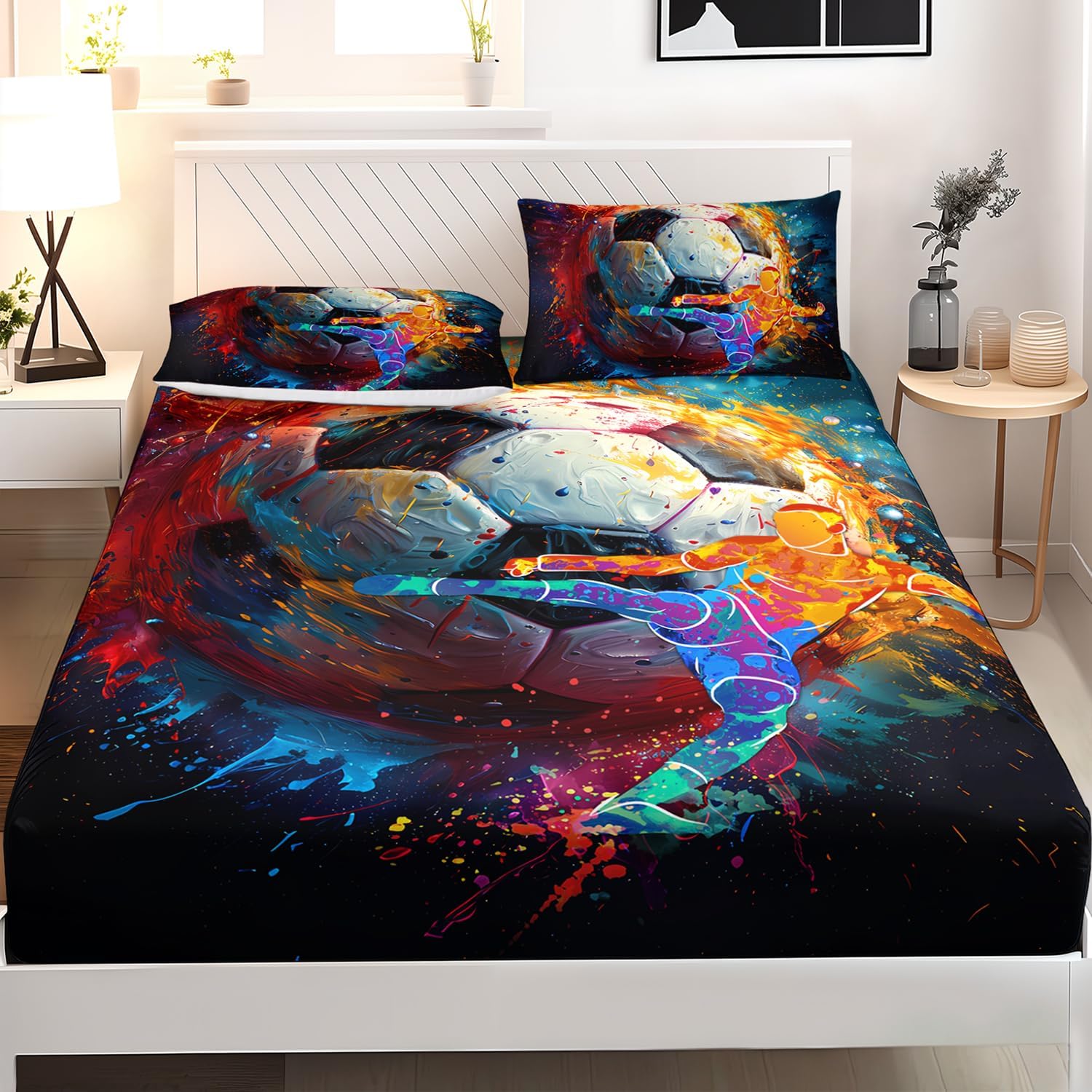 Bring a bold new look to your childâs room with the AILONEN Boys Soccer Fitted Sheet Set. Featuring a vibrant 3D oil painting football design, these bed sheets add a dynamic and artistic flair to any sleeping space. The soft, breathable microfiber fabric ensures your little one enjoys maximum comfort while staying cool throughout the night. Designed specifically for twin beds, the set includes a fitted sheet (39" W x 75" L x 16" H) and two matching pillowcases (20" x 30"), creating a cohesive and stylish setup that's both functional and fun.