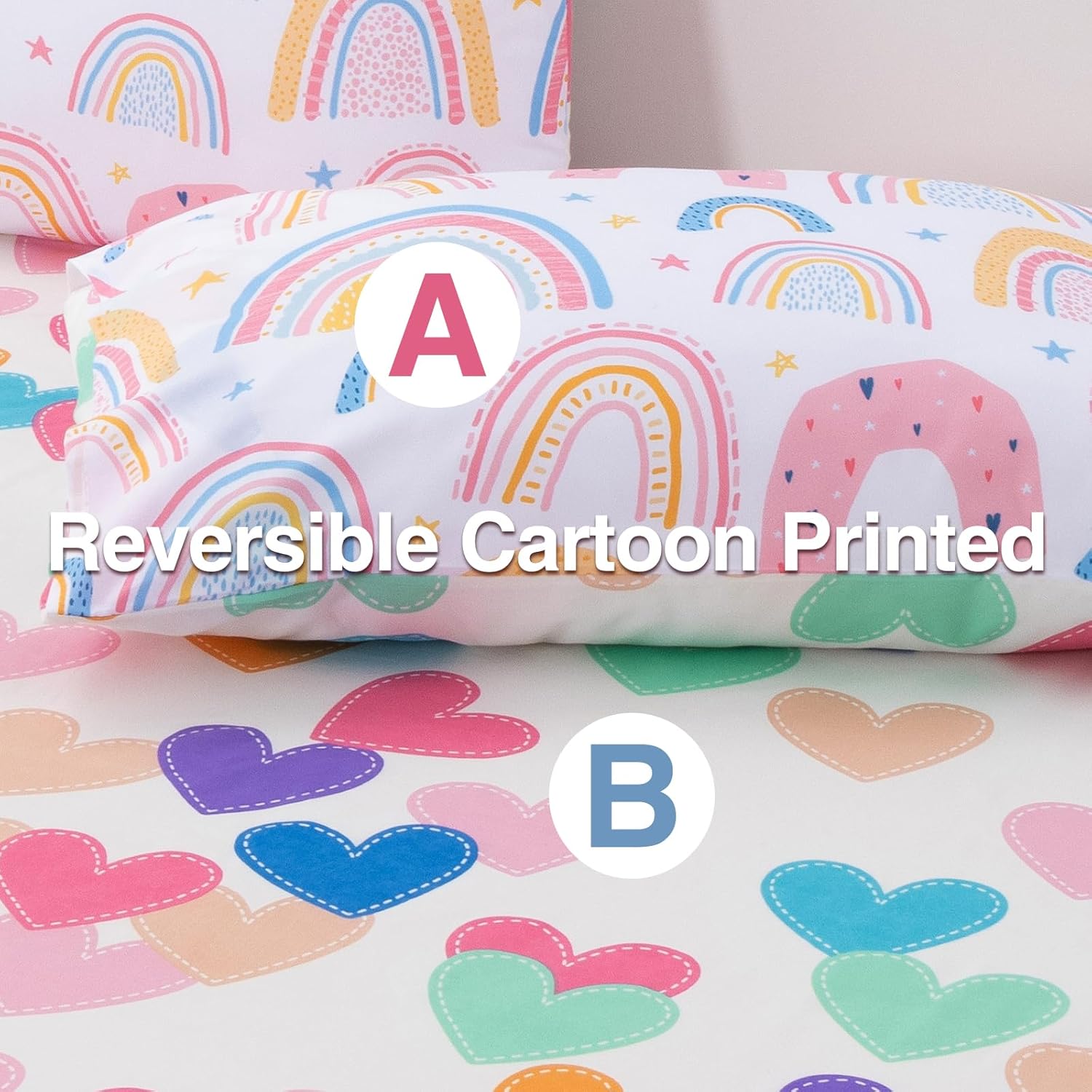 With a unique love hearts rainbow pattern, this set brings joy and creativity to your child's daily routine. It's an ideal choice for parents who want stylish and affordable bedding solutions that provide both comfort and visual appeal. Easy to care for, it can be machine washed and tumble dried at low heat for hassle-free maintenance.