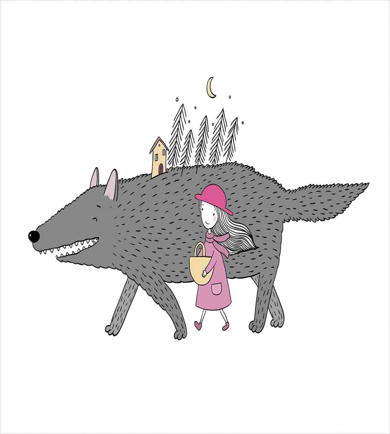 Add a touch of enchantment to your bedroom with this whimsical duvet cover set. Inspired by a magical tale, the design depicts a charming girl in a pink dress walking beside a giant wolf through a serene fir forest past a cozy little house. This set brings storytelling warmth to your bed, transforming your space into a dreamy haven.