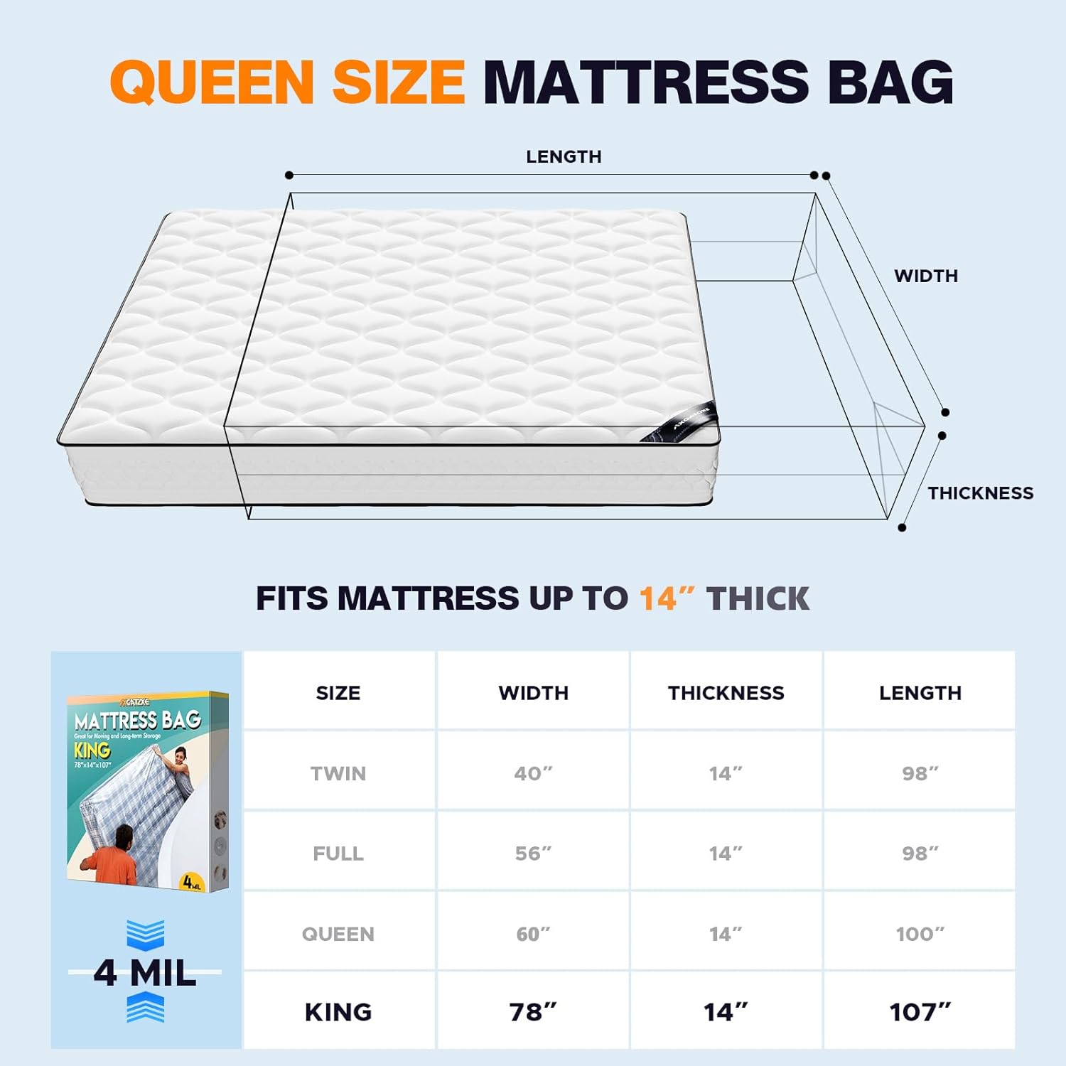 The king size mattress bag is engineered to fit Full size mattresses (107" x 78" x 14") with precision, offering a snug seal to prevent dust, moisture, and debris from entering. Its clear and odorless construction allows for easy visual inspection of the mattress without the need to open the bag, giving you peace of mind before and after storage.