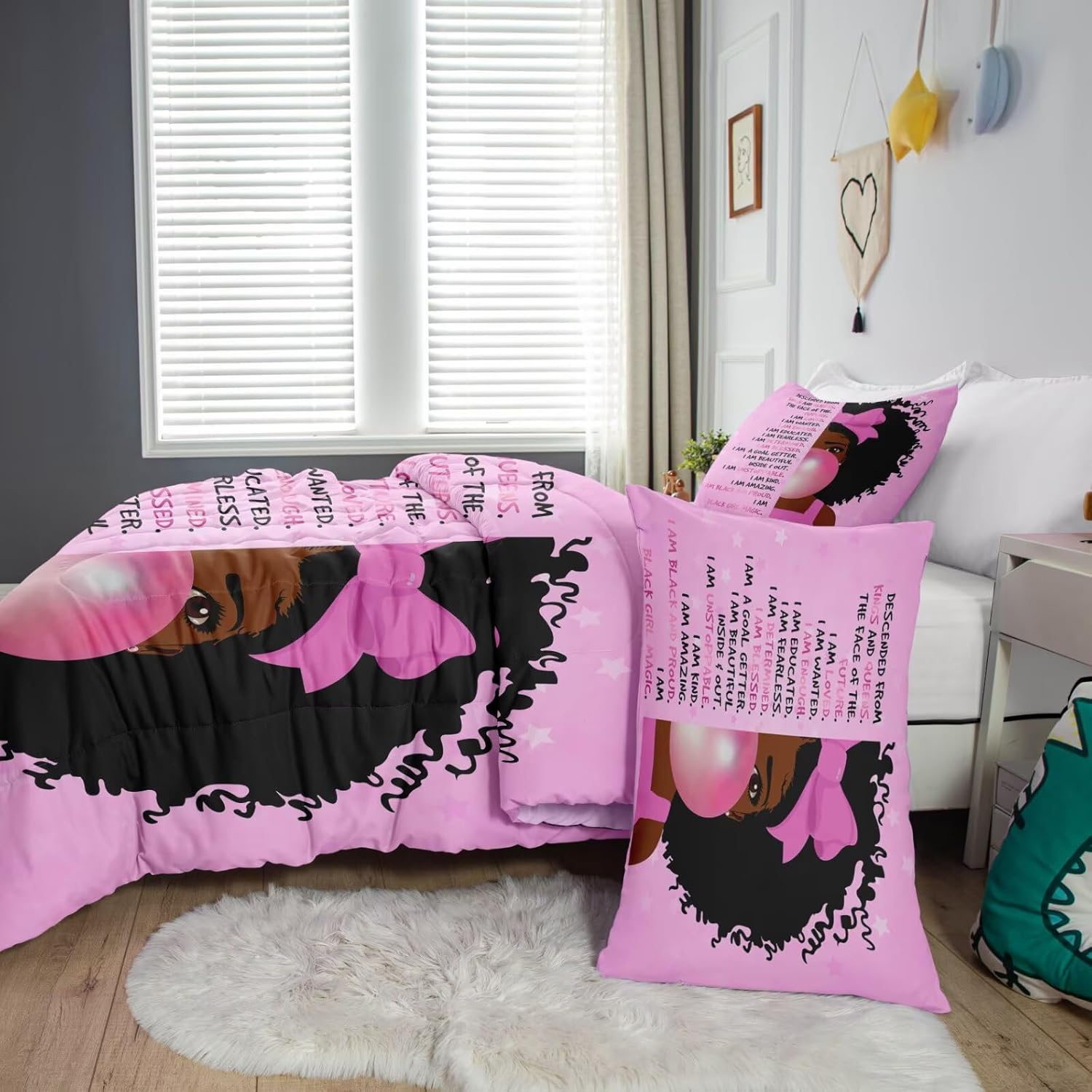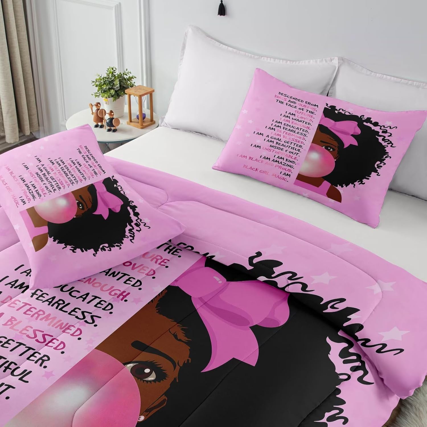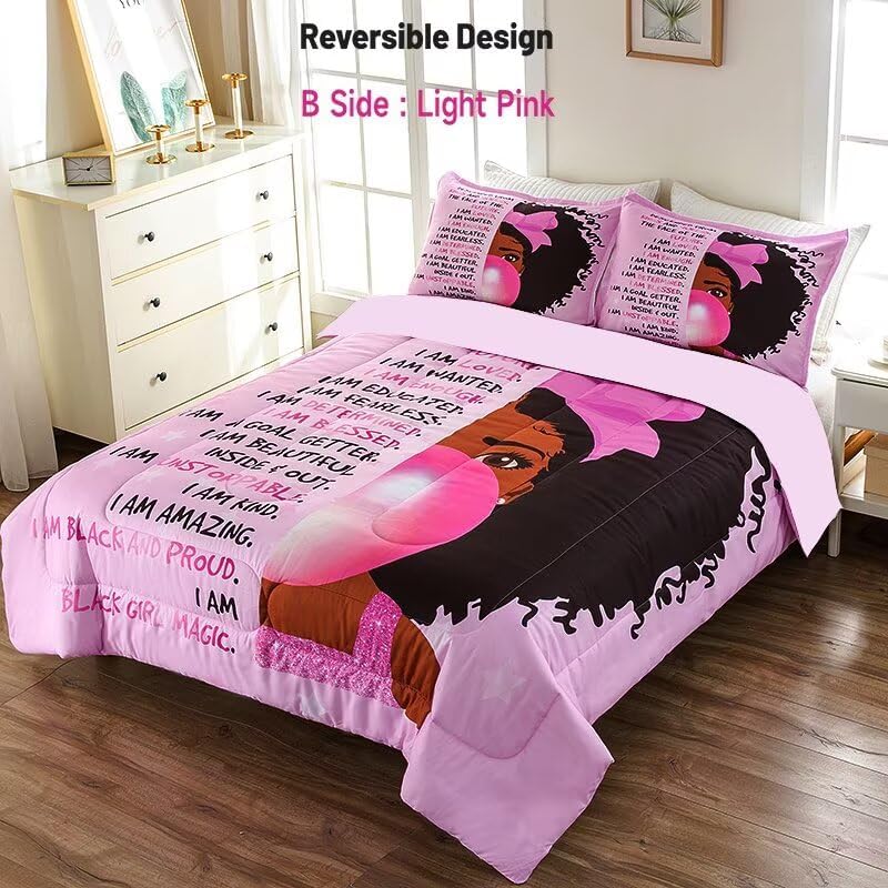 Bring warmth, comfort, and a touch of positivity to your child's room with this 3-piece Black girl comforter set. Designed with motivational quotes that inspire confidence and uplift young minds, it's the perfect addition to a playful or princess-themed bedroom, transforming the space into a magical and personal retreat.