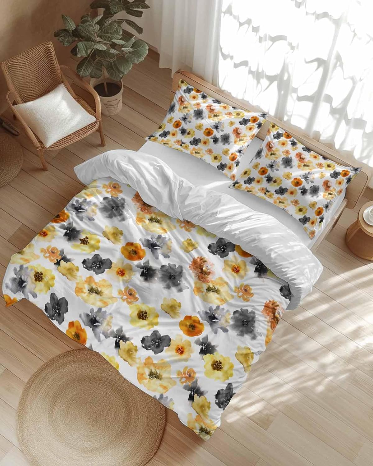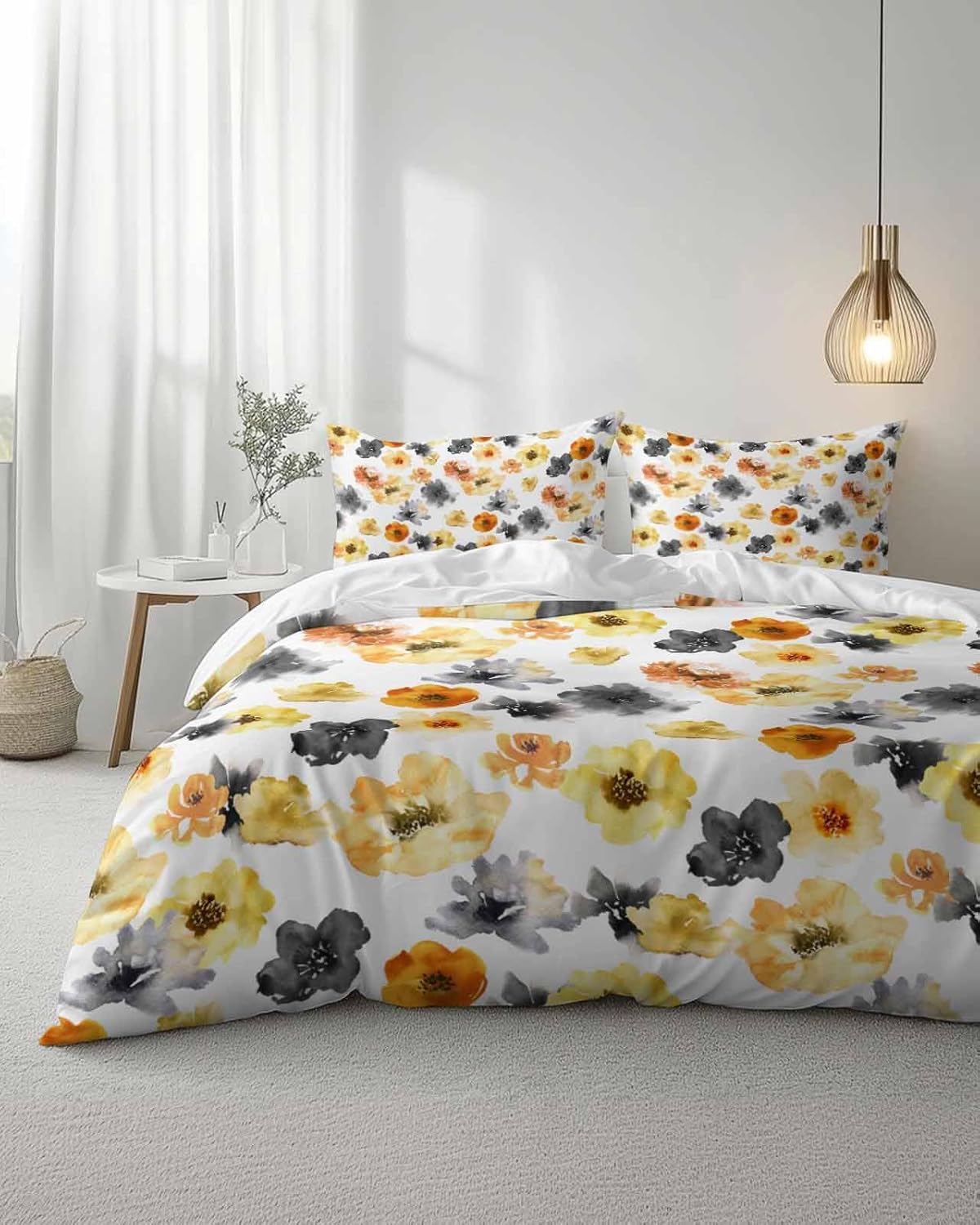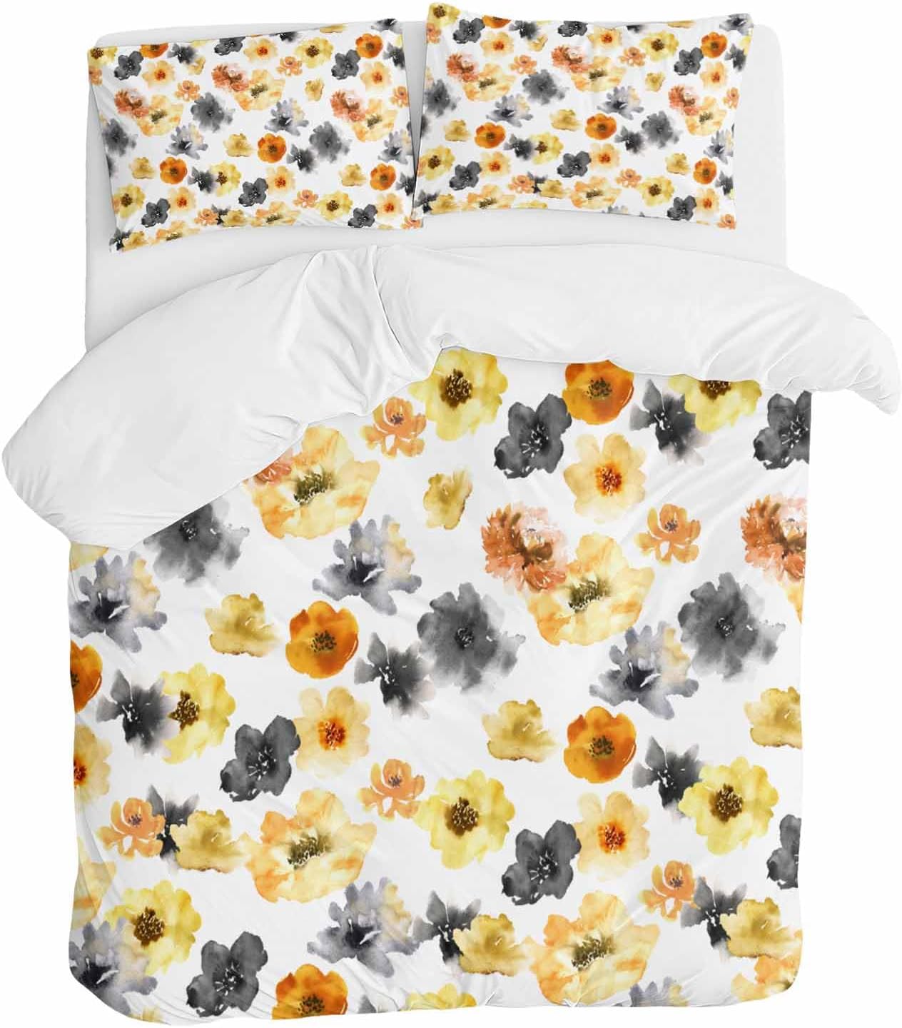 Transform your bedroom with this elegant and stylish bedding set. The vibrant watercolor floral pattern in yellow, orange, and black adds a beautiful touch to your decor, blending effortlessly with any room style. This 3-piece set includes one queen-sized duvet cover and two matching pillow cases, making it a versatile and complete addition to your bedding collection.