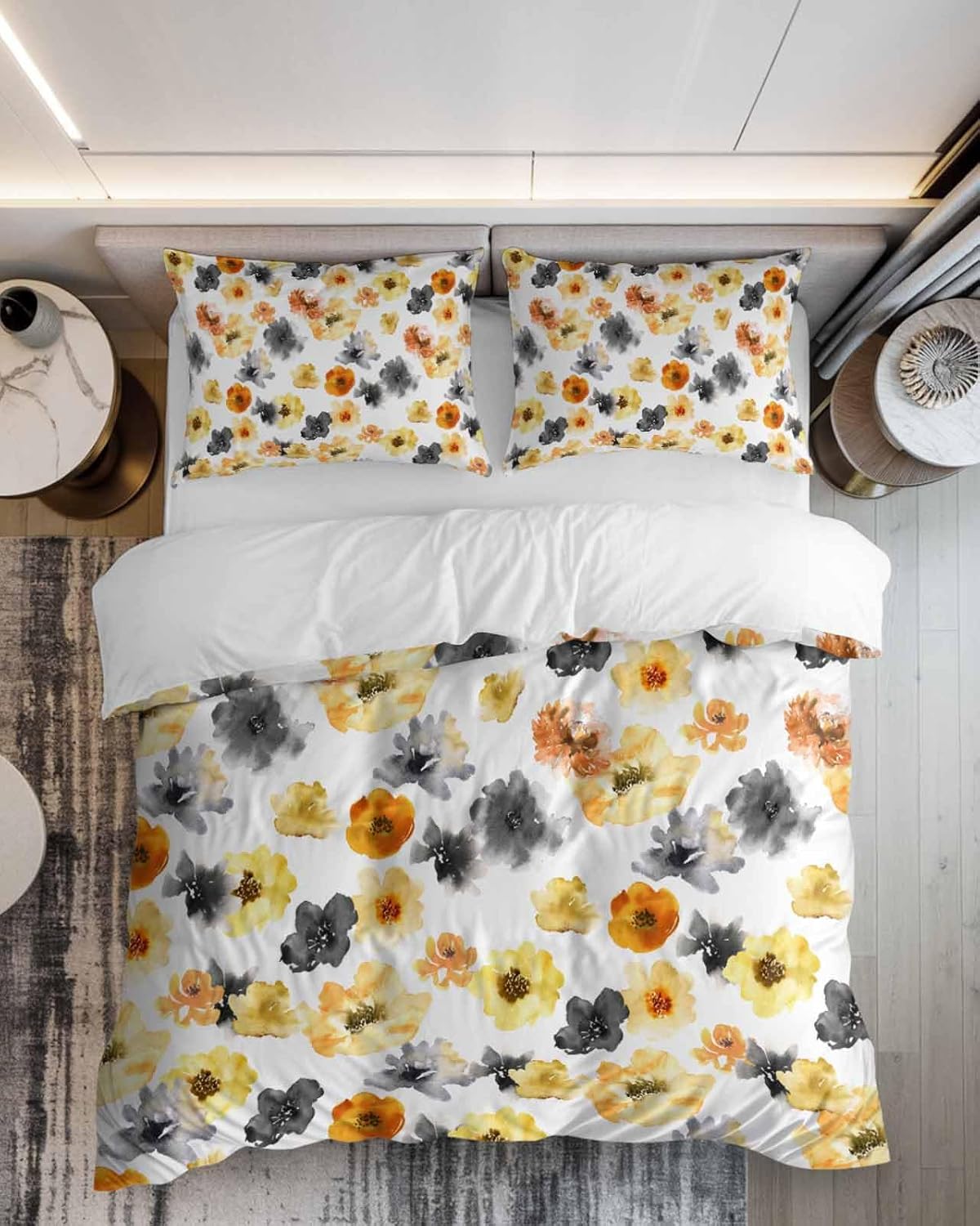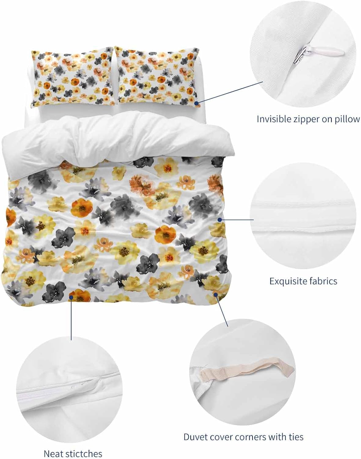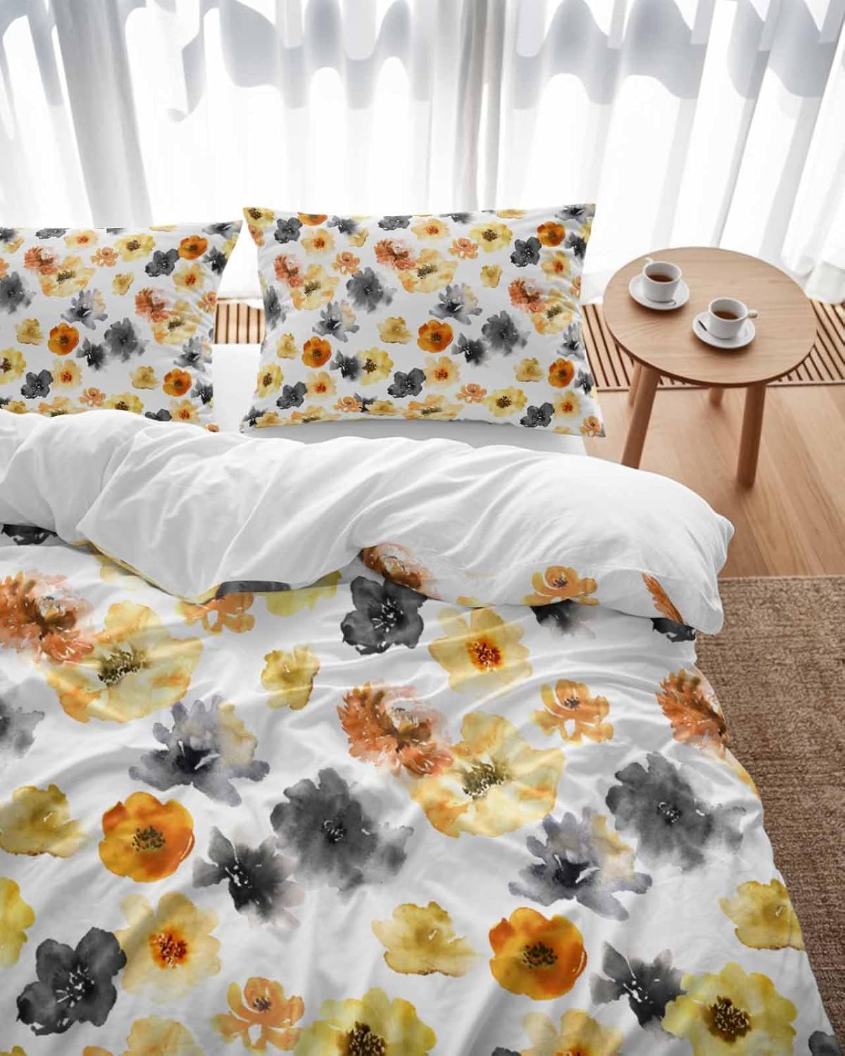 Transform your bedroom with this elegant and stylish bedding set. The vibrant watercolor floral pattern in yellow, orange, and black adds a beautiful touch to your decor, blending effortlessly with any room style. This 3-piece set includes one queen-sized duvet cover and two matching pillow cases, making it a versatile and complete addition to your bedding collection.