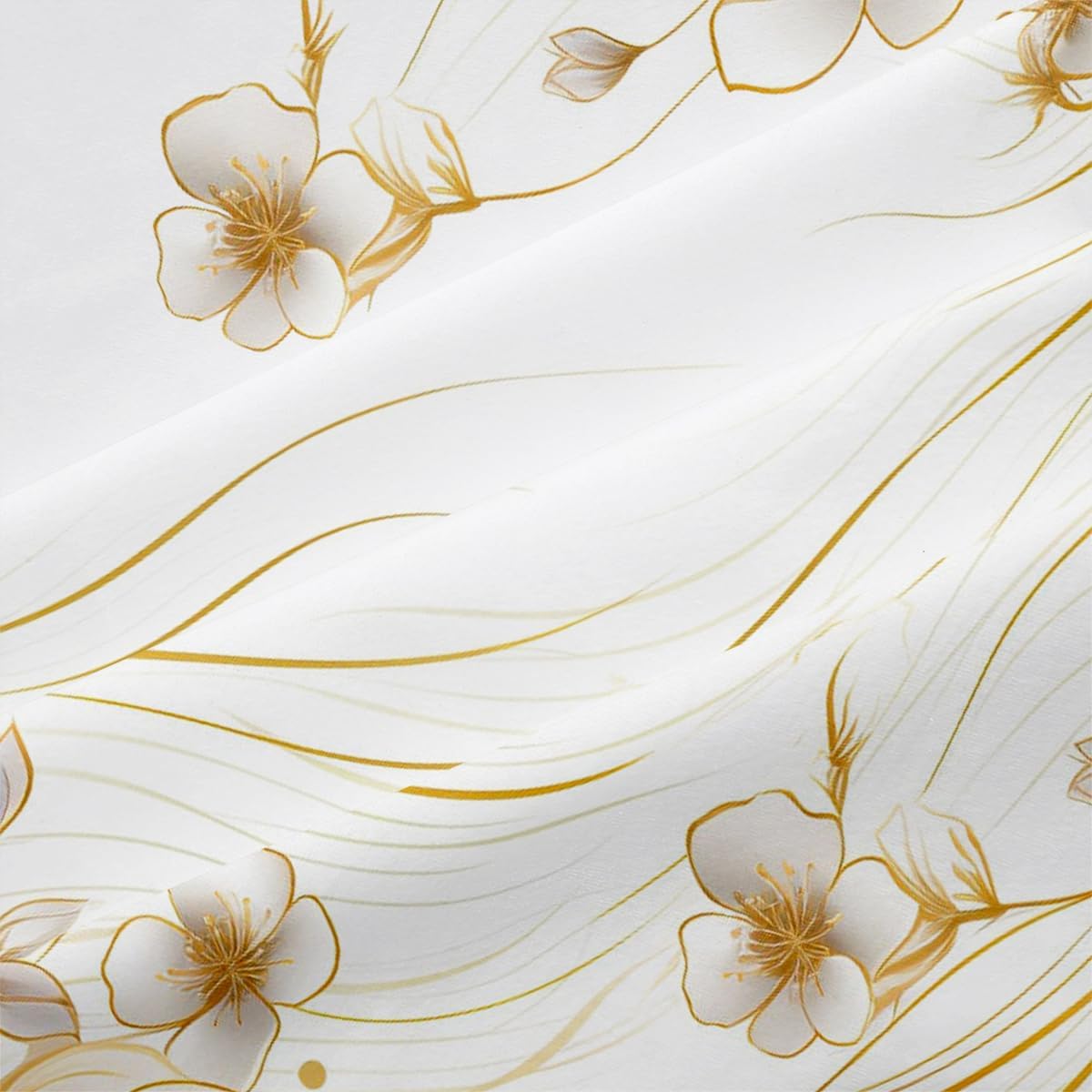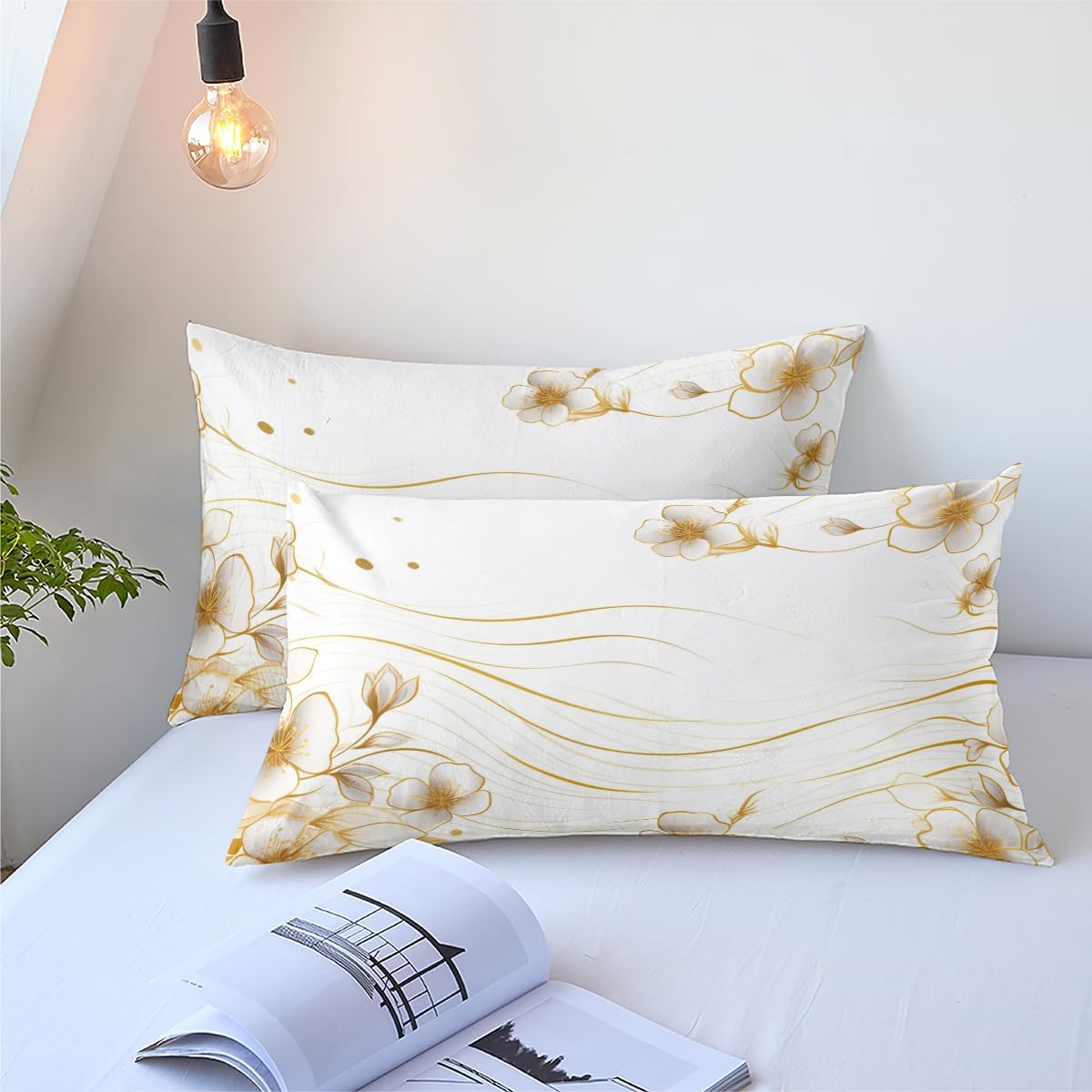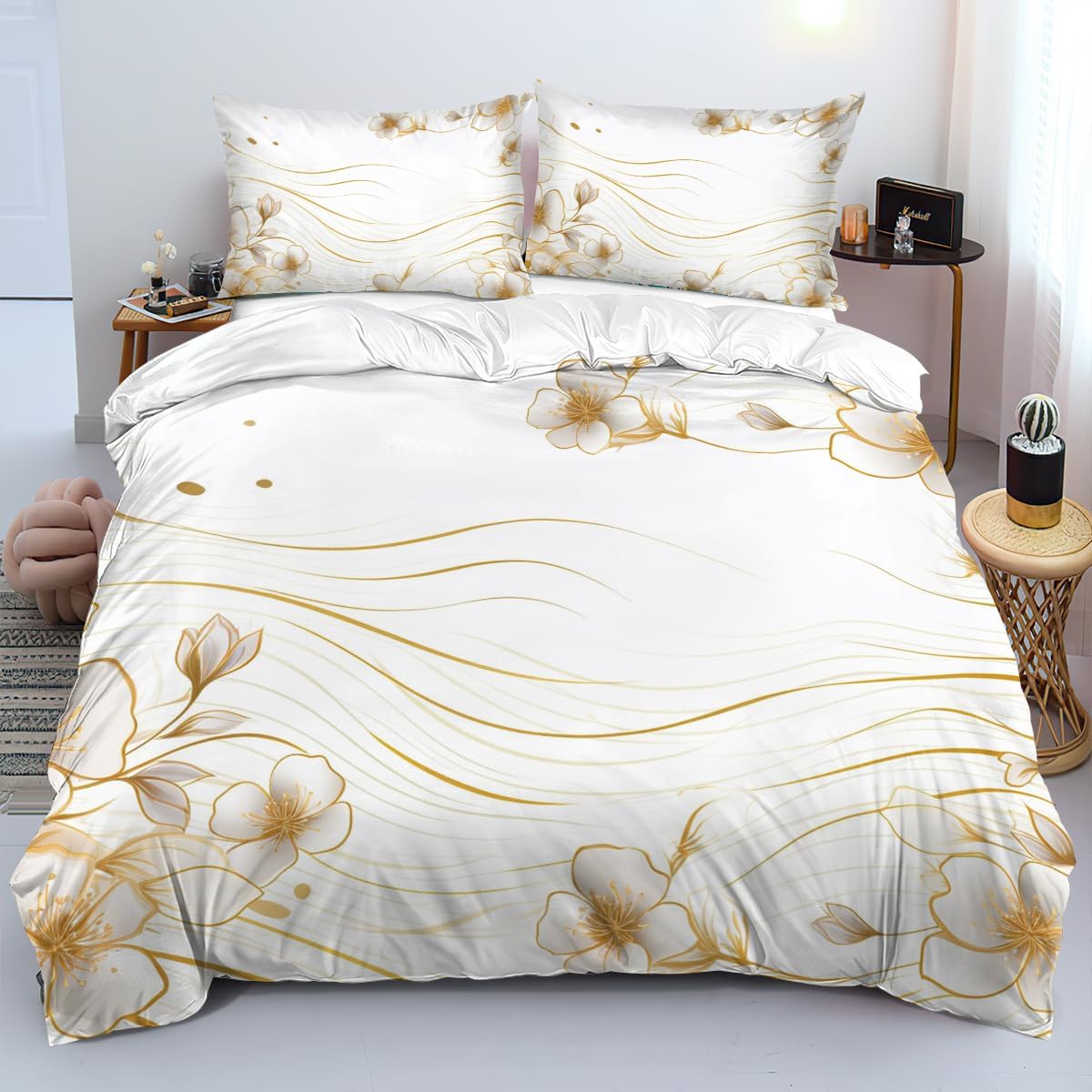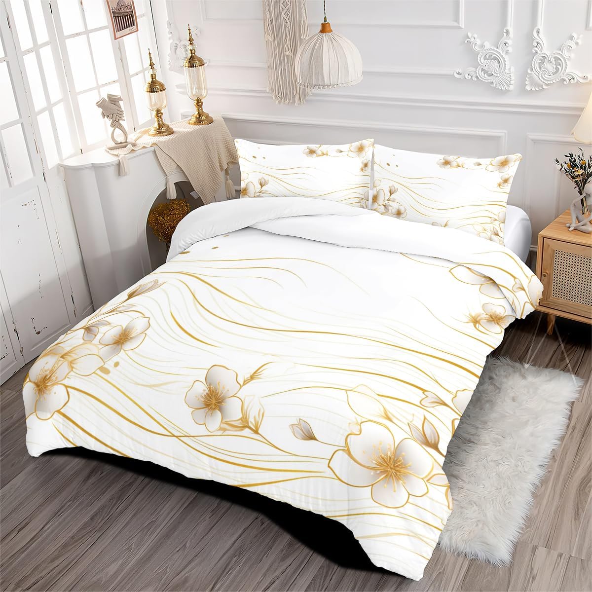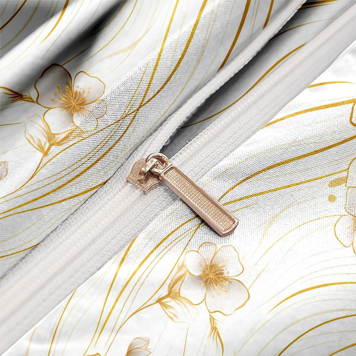 Dive into a world of refined elegance with the White Gold Flowers Duvet Cover Set. This Japanese-inspired set features a queen size duvet cover with zipper closure and two matching pillowcases, creating a stylish and functional addition to any bedroom. It's made from eco-friendly, skin-friendly materials that ensure a healthy and luxurious sleep experience. The color fixing treatment guarantees long-lasting vibrancy, while the secure eight corner ties keep it neat and in place for years of comfort.