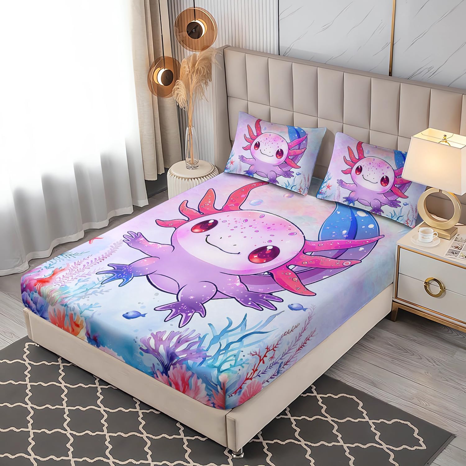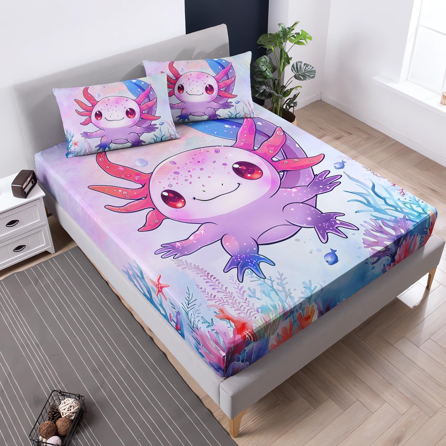 This charming axolotl bed set is a perfect mix of comfort and playful design for your child's bedroom. Made from 100% microfiber, it offers a soft, breathable, and hypoallergenic feel thatâs ideal for sensitive skin. The fitted sheet comes with an extra deep 15-inch pocket and all-around elastic band, making it stay firmly in place throughout the night for a peaceful sleep. The ocean-themed pattern featuring adorable axolotls and waterweed adds a whimsical touch to any room, making it a hit with kids who love the sea. The set includes one fitted sheet and two pillowcases, giving you all the essentials to create a cozy and stylish sleep environment without extra shopping.