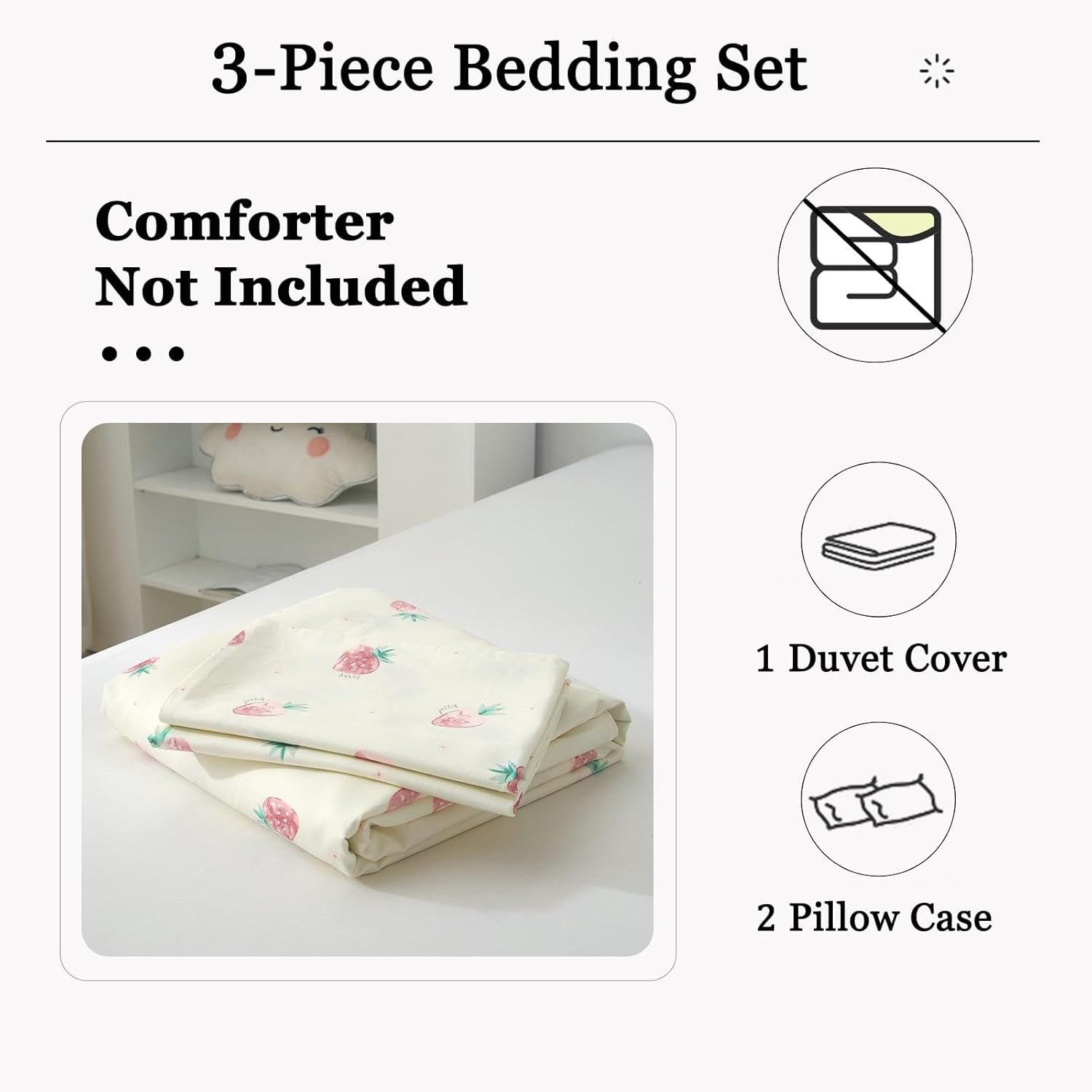 DREAMINGO brings a playful twist to your bedroom with this adorable 3-piece bedding set. Made from 100% natural cotton, it offers a soft and cozy feel that's perfect for children and girls. The lightweight, breathable fabric ensures comfort all year round, whether it's cool summer nights or warm winter days. Each piece is designed with careâfeaturing a hidden zipper for effortless use and two envelope-closure pillow cases that provide full coverage and a clean, kawaii aesthetic. The bright strawberry pattern adds a fun and cheerful touch, making your sleeping space feel like a whimsical retreat.