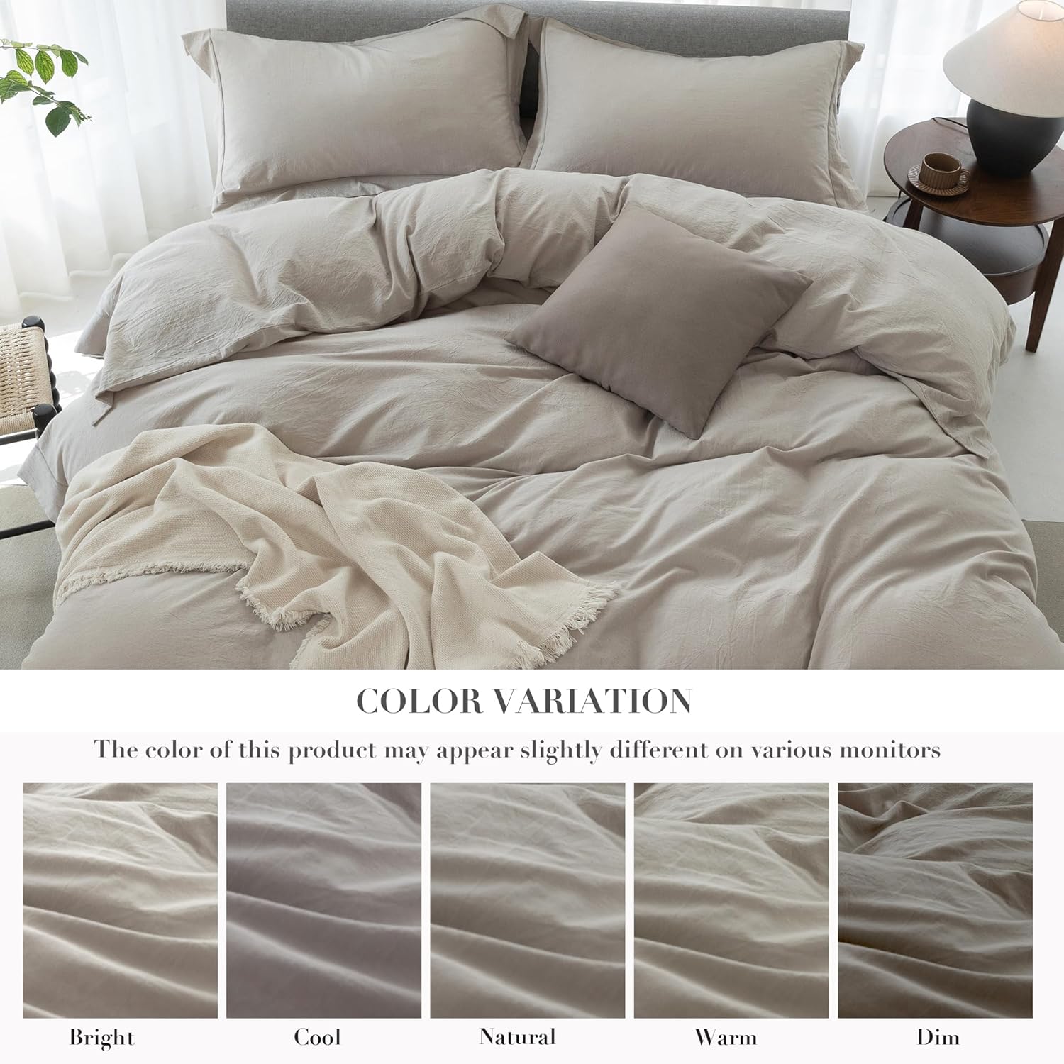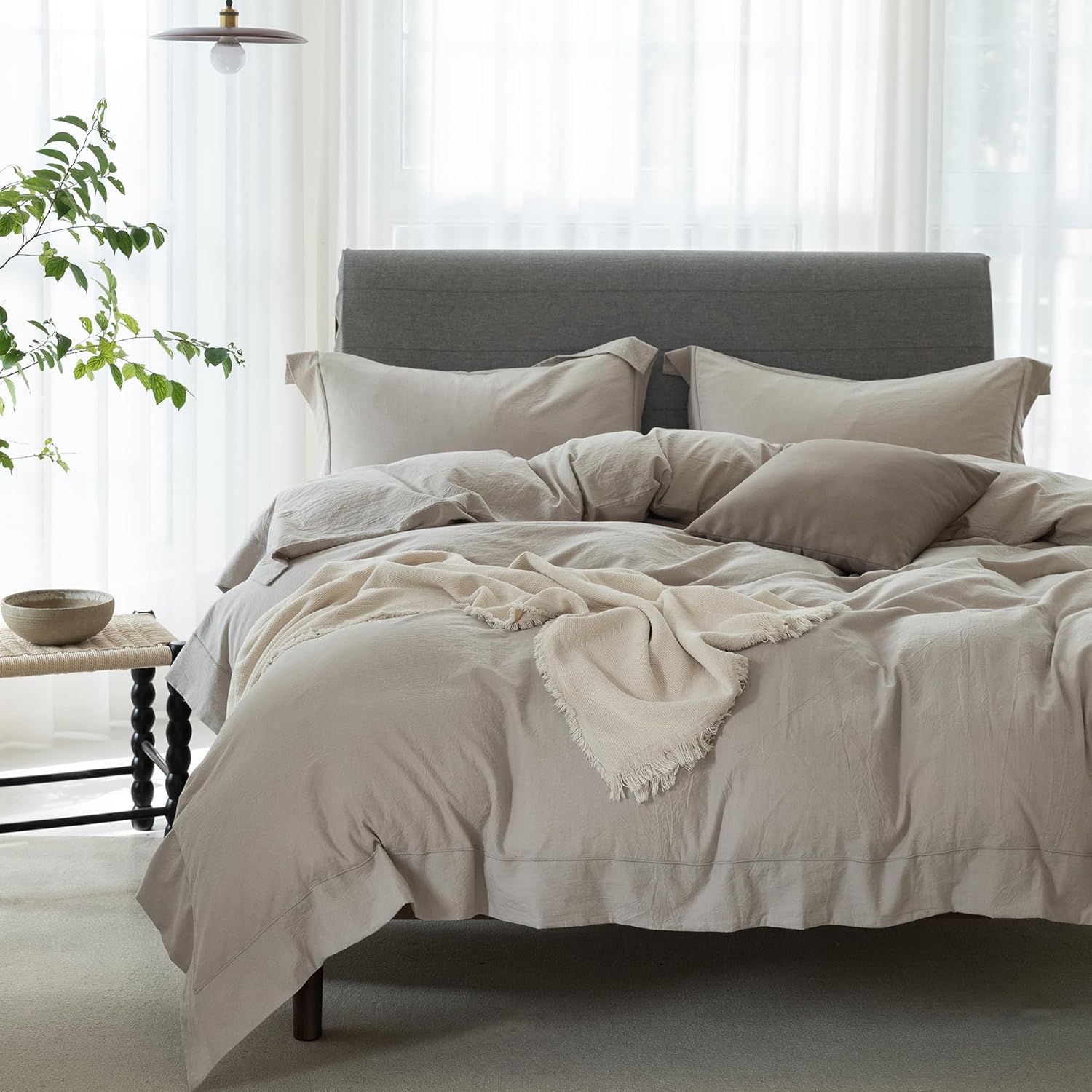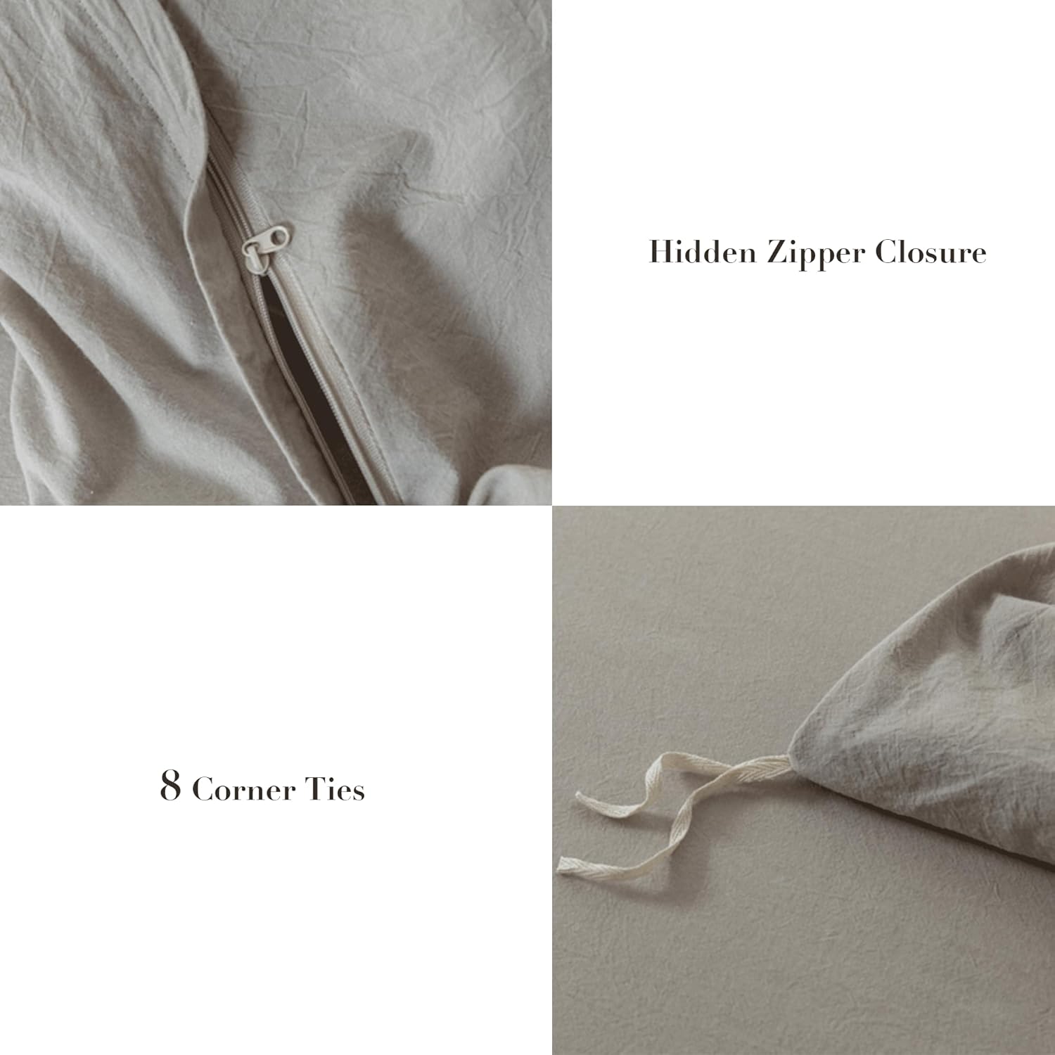 Transform your bedroom into a sanctuary of comfort and style with the ELIMMO Cooling King Duvet Cover Set. Made from 100% washed cotton, it delivers a soft and durable feel that grows softer with each use. The linen-like texture adds a touch of sophistication, while the wide trim design brings a modern, elegant look to your bedding. Whether it's a warm summer night or a cool winter evening, this cooling set provides the perfect balance of warmth and breathability. The zipper closure makes it easy to remove and reattach, keeping your duvet insert secure and aligned. Hemmed edges with a 2.8\" flange ensure increased durability and a refined finish. This set includes 1 duvet cover and 2 pillowcases, available in understated beige and grey tones that match any decor. Experience the perfect blend of comfort and design with the ELIMMO Cooling King Duvet Cover Set. Its premium cotton construction ensures a smooth and breathable sleep surface, ideal for those who prioritize quality and a restful night's sleep. The sleek wide trim and timeless color choices make it a versatile addition to any bedroom, helping you create a personalized and stylish space.ELIMMO Cooling King Duvet Cover Set