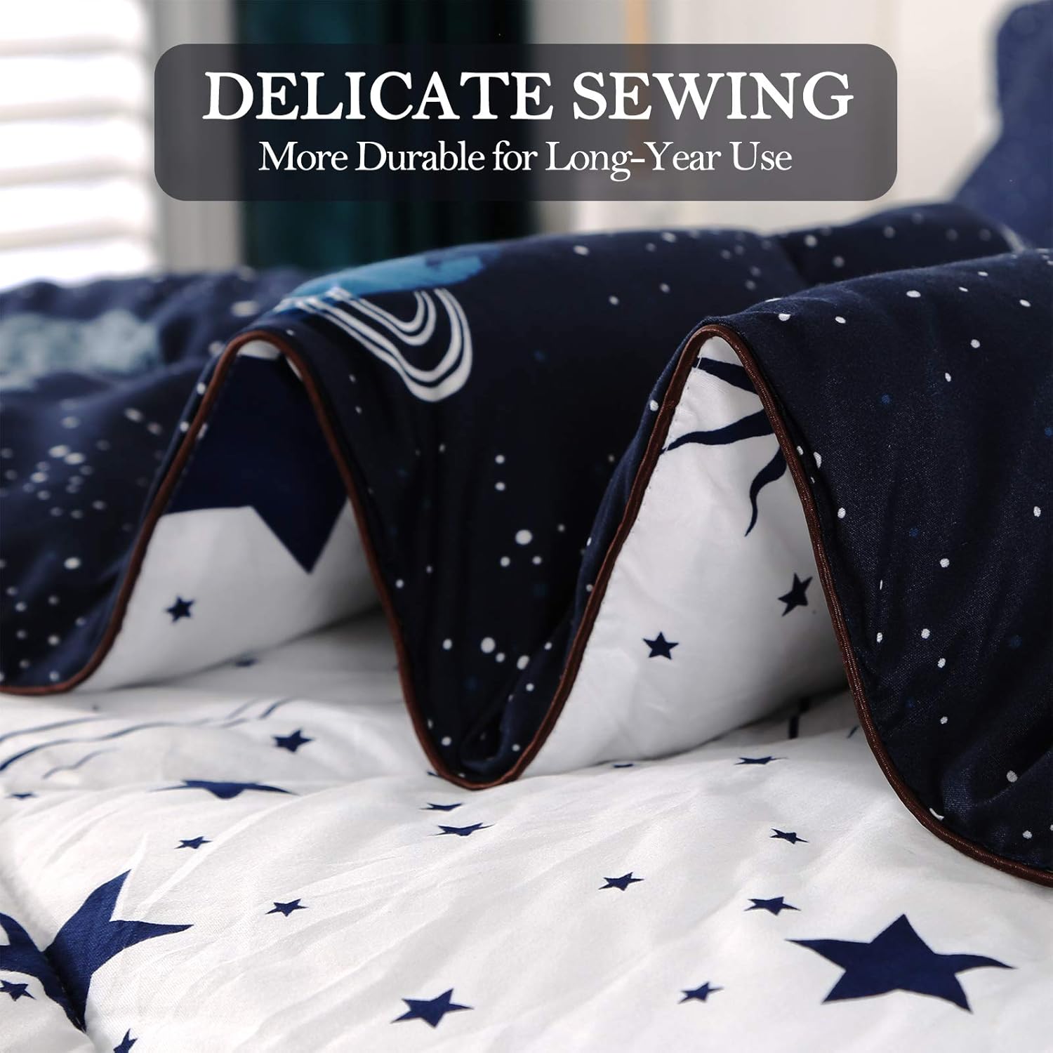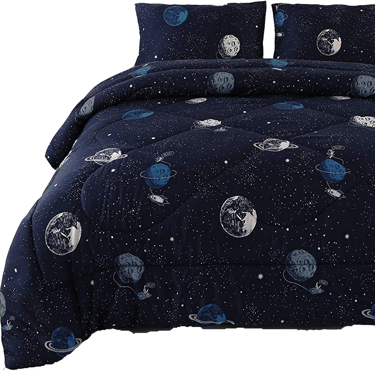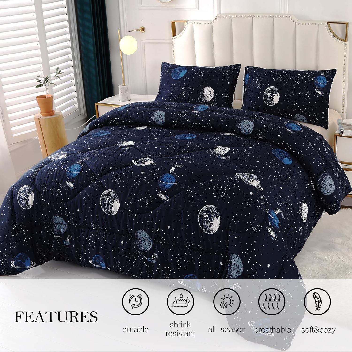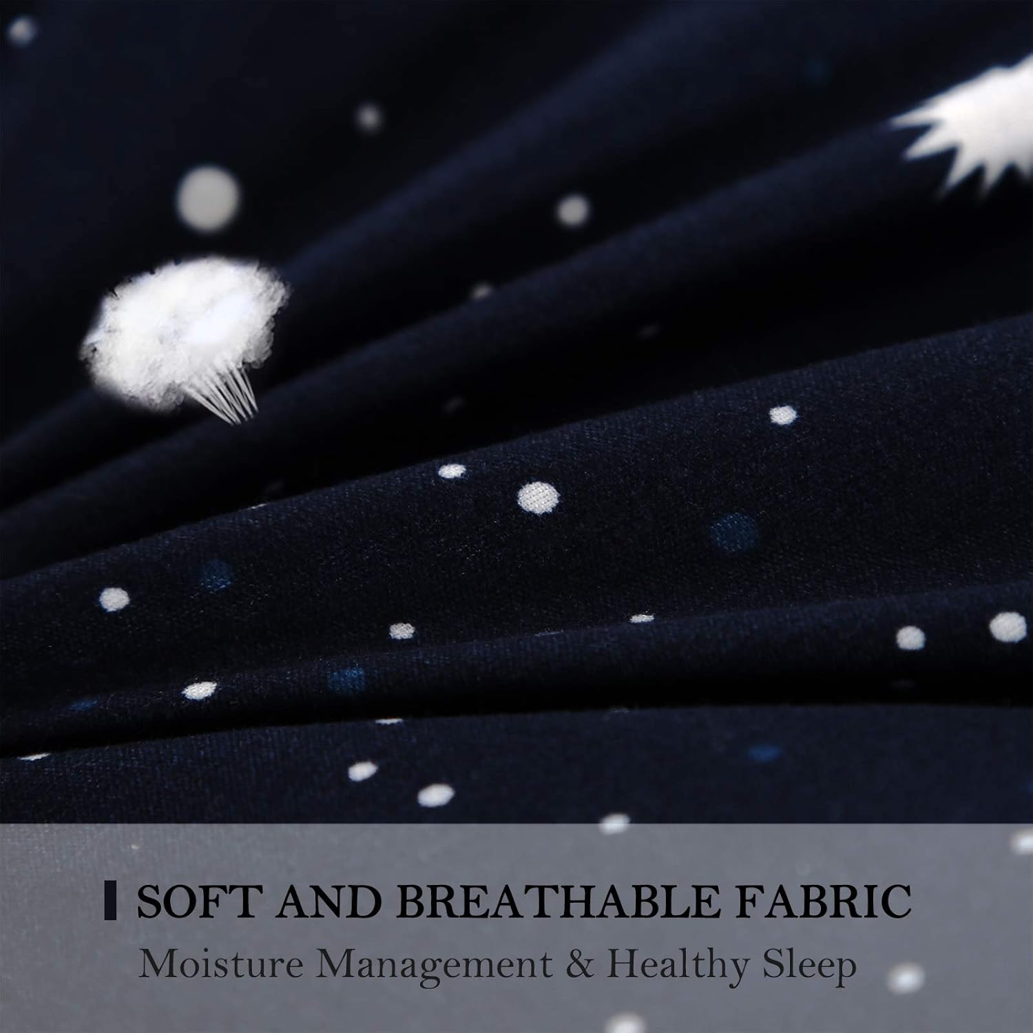 This comforter set is crafted with 100% brushed microfiber fabric, offering a super soft and cozy feel thatâs ideal for bedtime. The breathable spiral bonded filling ensures the comforter remains lightweight and retains its softness even after repeated washes. With a box-stitched quilted design, it stays in place without shifting, making it perfect for a restful nightâs sleep. The vibrant space galaxy pattern adds a touch of fantasy and style to your childâs room, creating a dreamy and comfortable environment for all seasons.