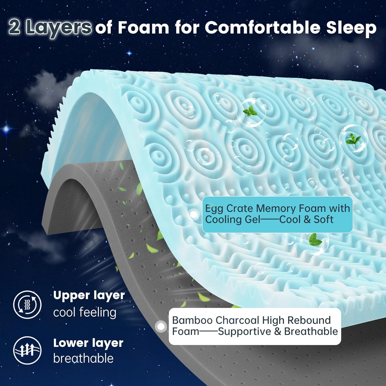 With a unique dual-layer construction, this mattress topper combines cooling gel foam and bamboo charcoal foam to maintain a balanced temperature. Itâs perfect for people who tend to overheat during sleep or experience discomfort from pressure buildup. The breathable materials allow for improved airflow, keeping you cool and comfortable all through the night.