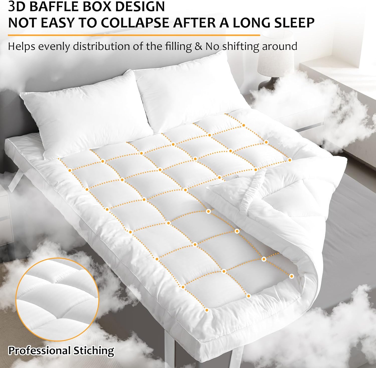 Designed to transform your sleep experience, this thick mattress topper combines plush comfort with advanced support. It's an ideal solution for anyone looking to elevate their sleep quality and enjoy a more restful night. The 2-inch height is filled with 3D snow design material that adapts to your body, offering pressure relief for all sleeping positionsâwhether you lie on your back, side, or stomach. Say goodbye to restless nights and hello to a cozy, supportive sleeping surface.