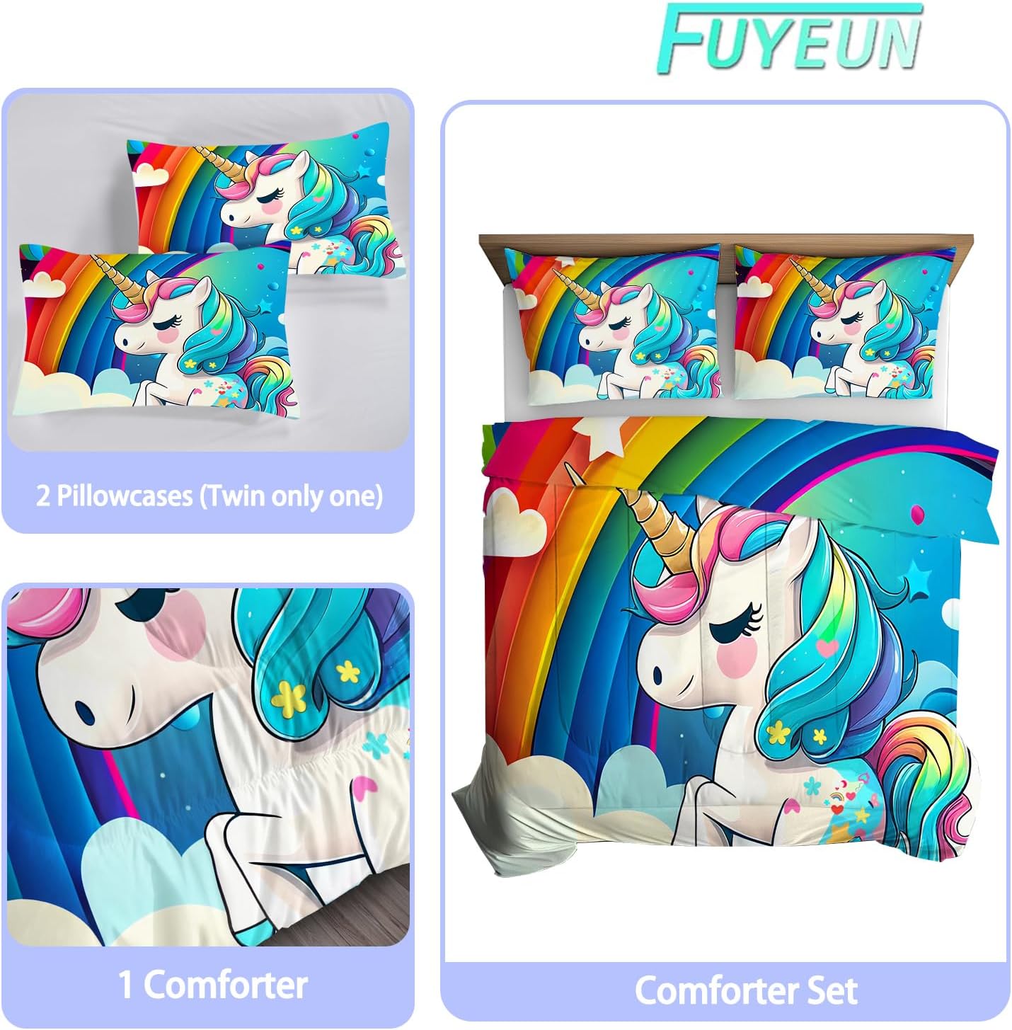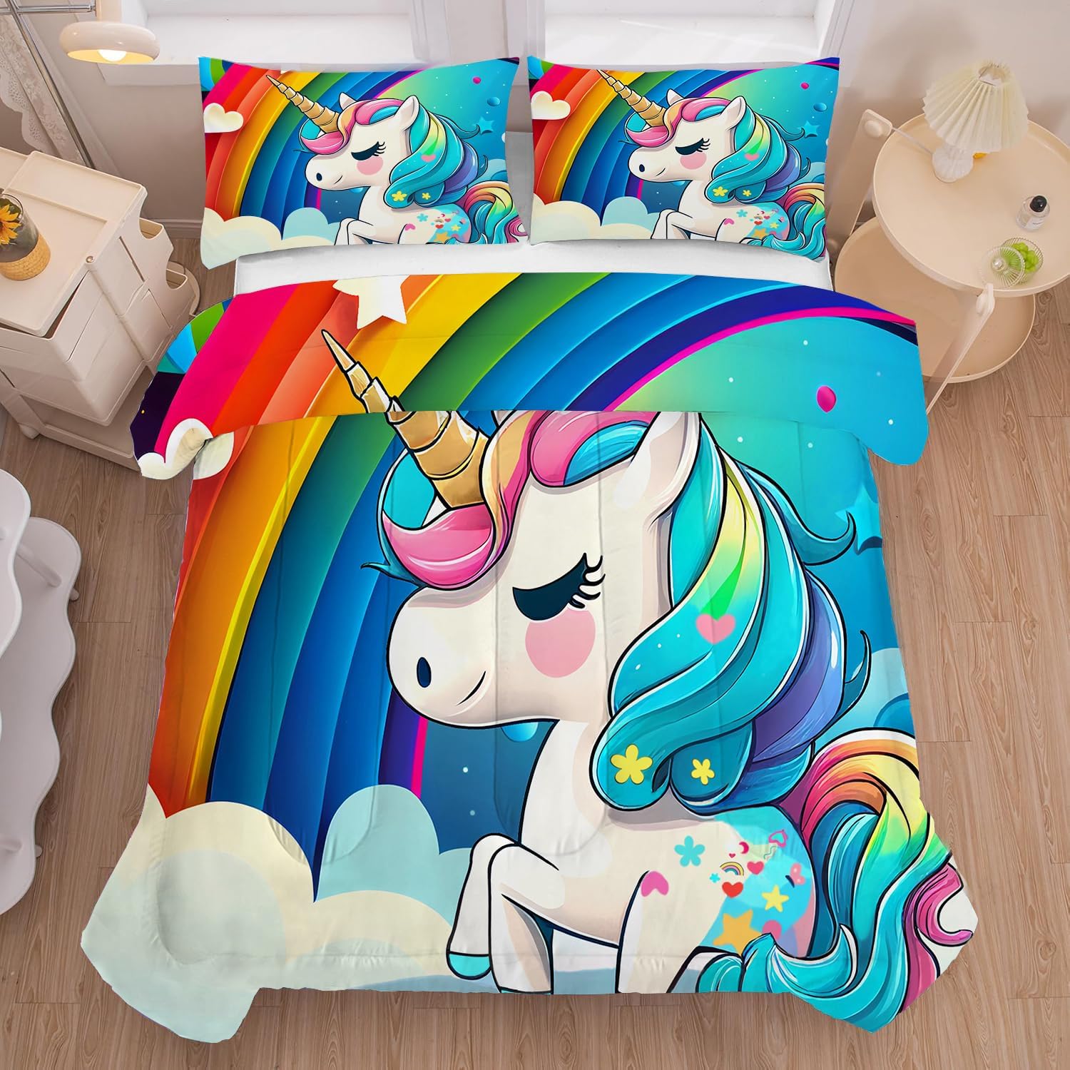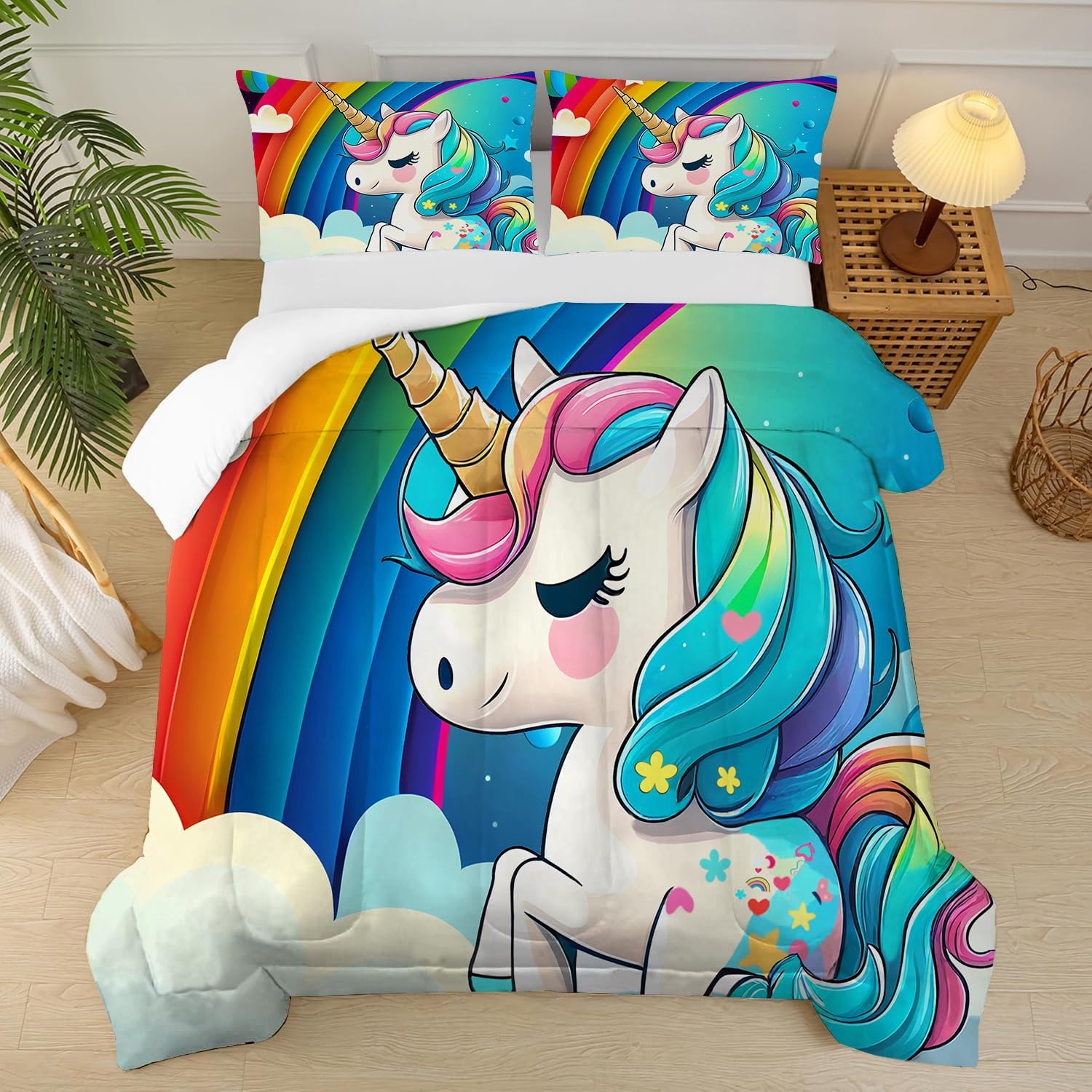This queen size comforter set is more than just beddingâit's a statement! The rainbow unicorn design adds a fun and colorful vibe to any room, making it a favorite for kids and unicorn lovers alike. The soft microfiber fabric ensures you'll stay cozy and comfortable, while the quilted construction provides just the right amount of warmth without adding bulk. It's a great way to bring some magic into your daily routine and create a cozy sleeping environment that's both practical and beautiful.
