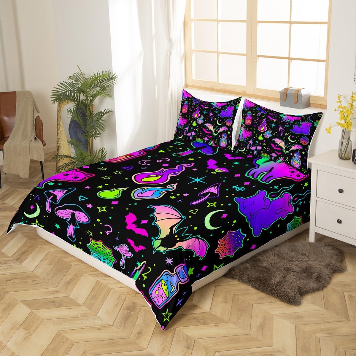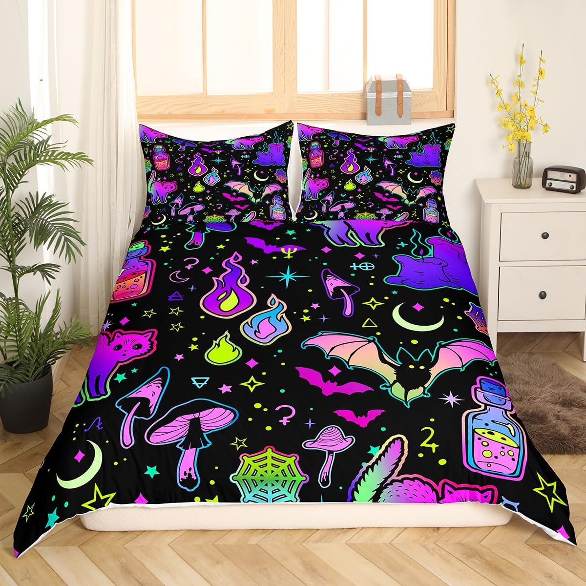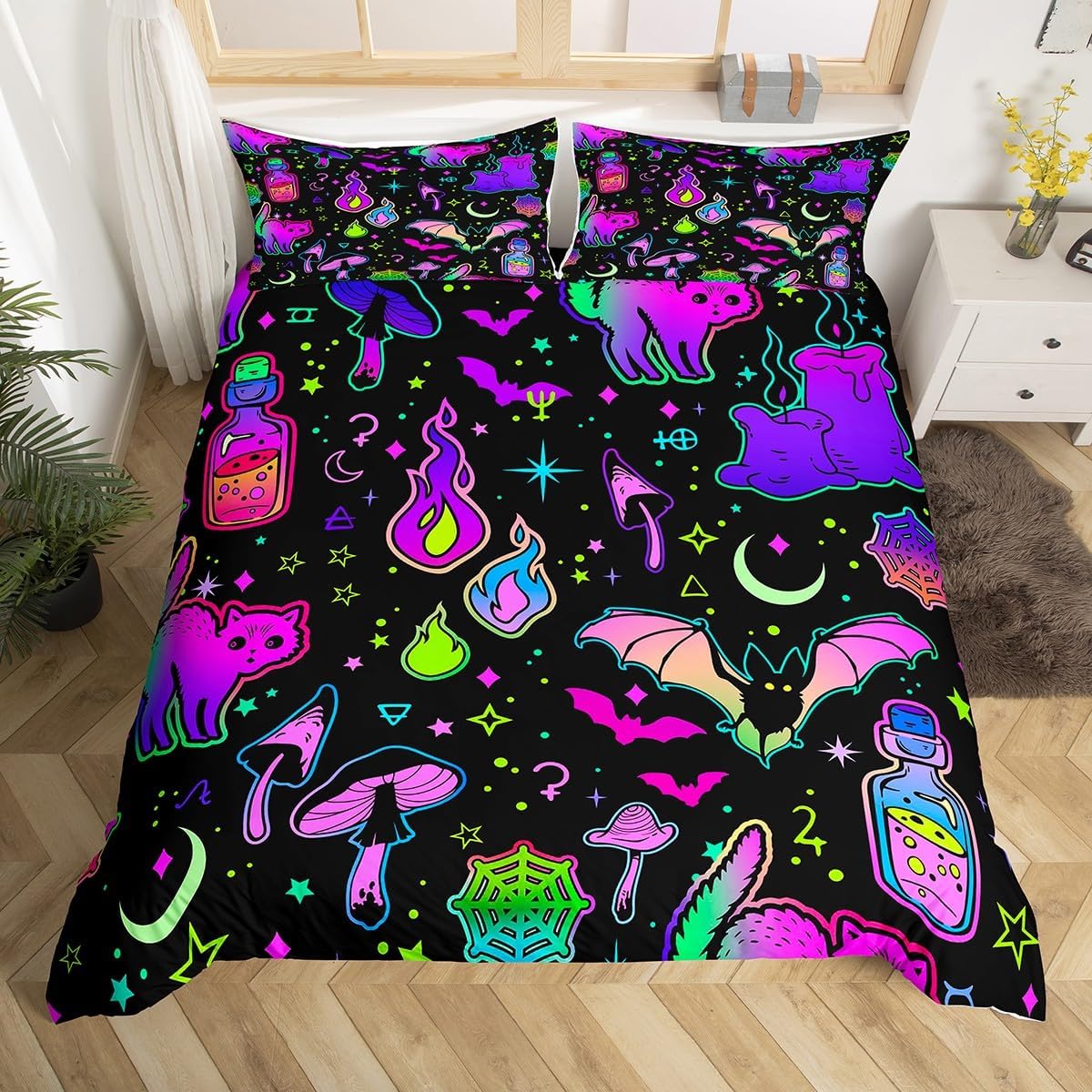Get ready to turn your bedroom into a Halloween wonderland with this eye-catching duvet cover set. Featuring a vivid neon cartoon cat design, it's the perfect way to add spooky flair and cheerful color to your decor. Whether you're a kid or an adult, this playful set is designed for everyone who loves the magic of Halloween.