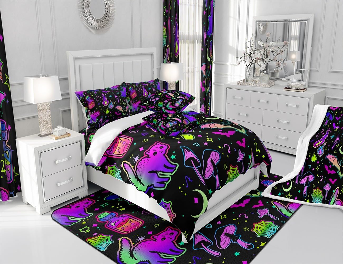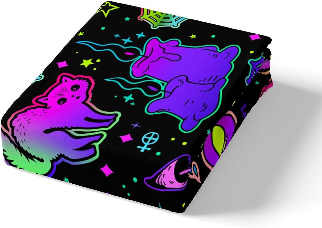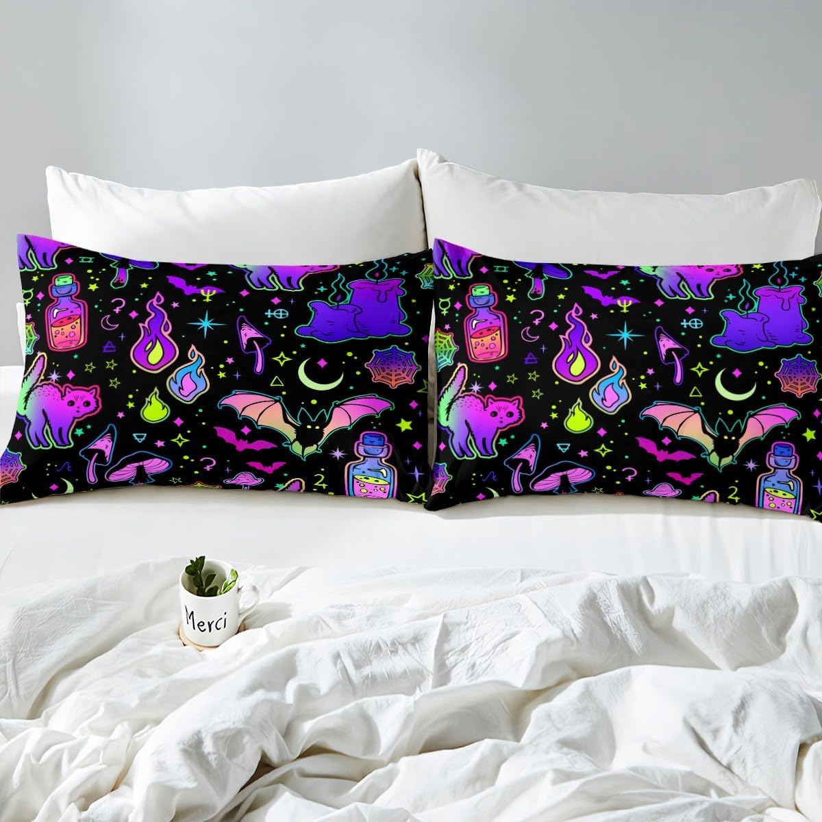 Get ready to turn your bedroom into a Halloween wonderland with this eye-catching duvet cover set. Featuring a vivid neon cartoon cat design, it's the perfect way to add spooky flair and cheerful color to your decor. Whether you're a kid or an adult, this playful set is designed for everyone who loves the magic of Halloween.