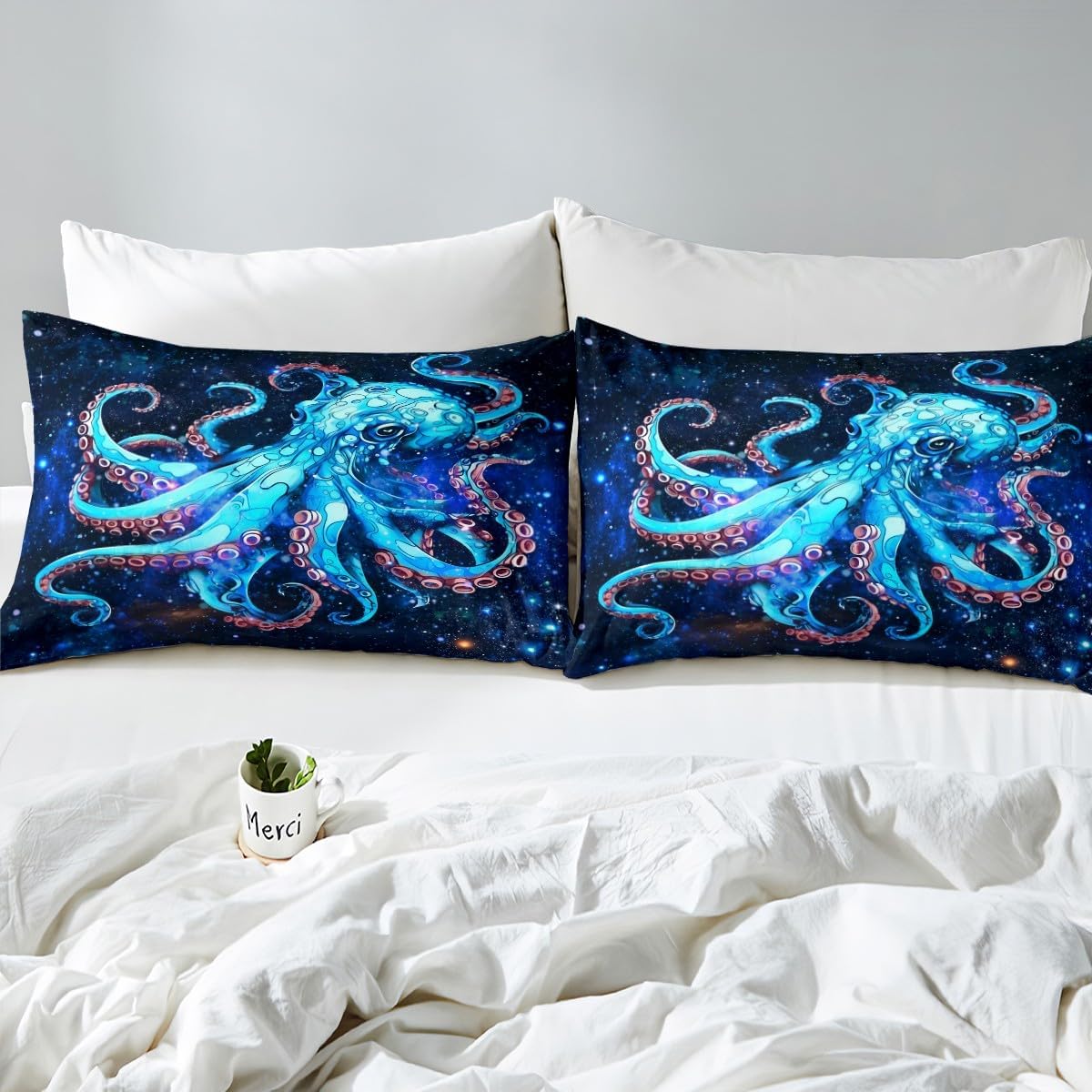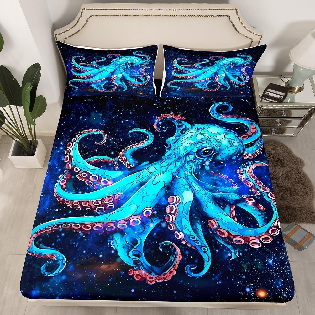 Transform your bedroom into a serene underwater paradise with the Feelyou Octopus Bed Sheet Set. Featuring stunning 3D printed designs of ocean kraken and galaxy stars, this set brings a whimsical, eye-catching aesthetic to your space. The ultra-soft microfiber fabric is not only comfortable but also breathable, making it perfect for a cozy night's sleep. The deep pocket fitted sheet comes with elastic all around for a secure, snug fit on your mattress, while the pillowcases complement the design beautifully.