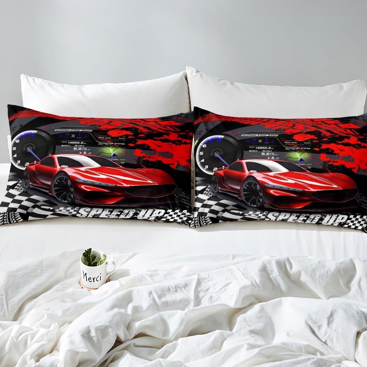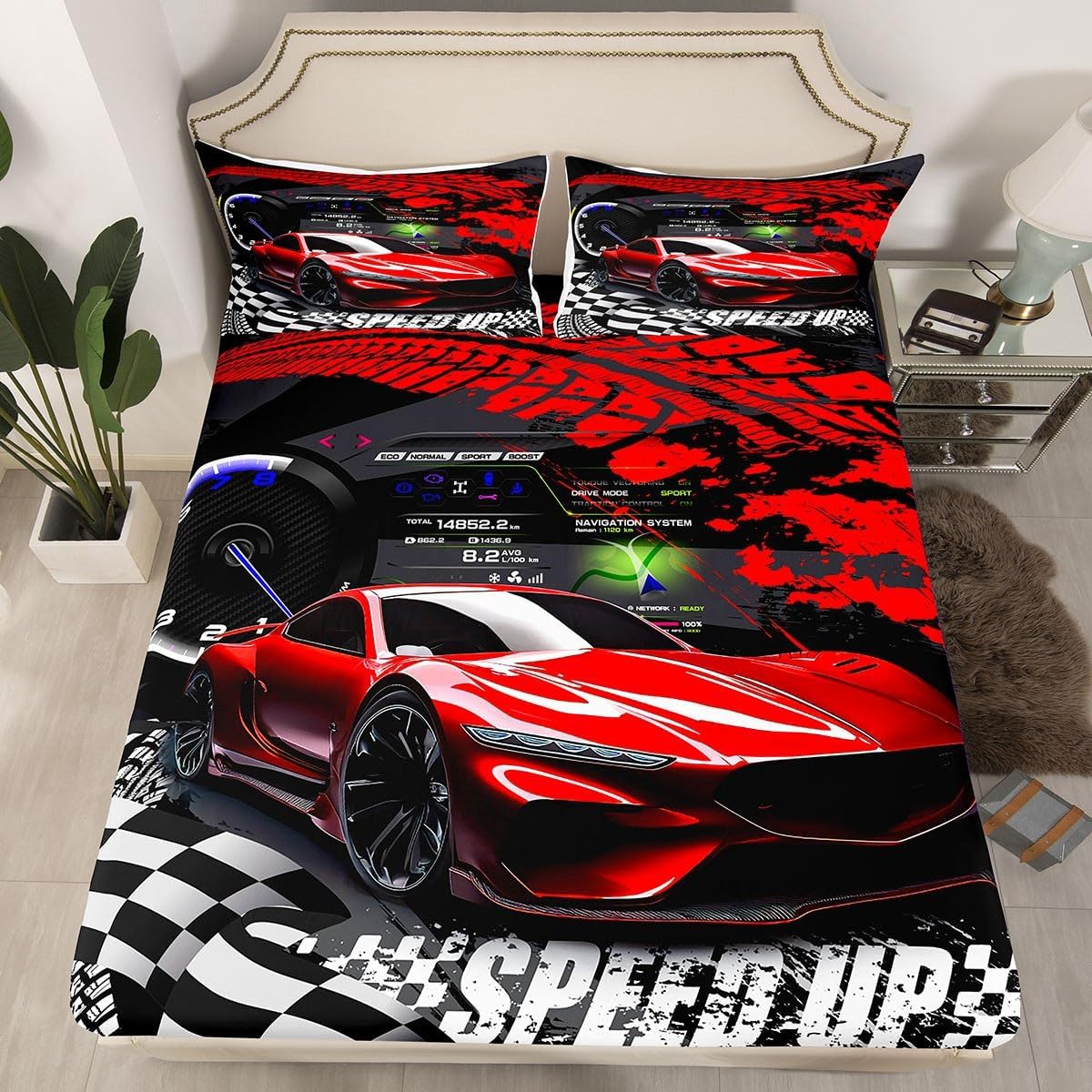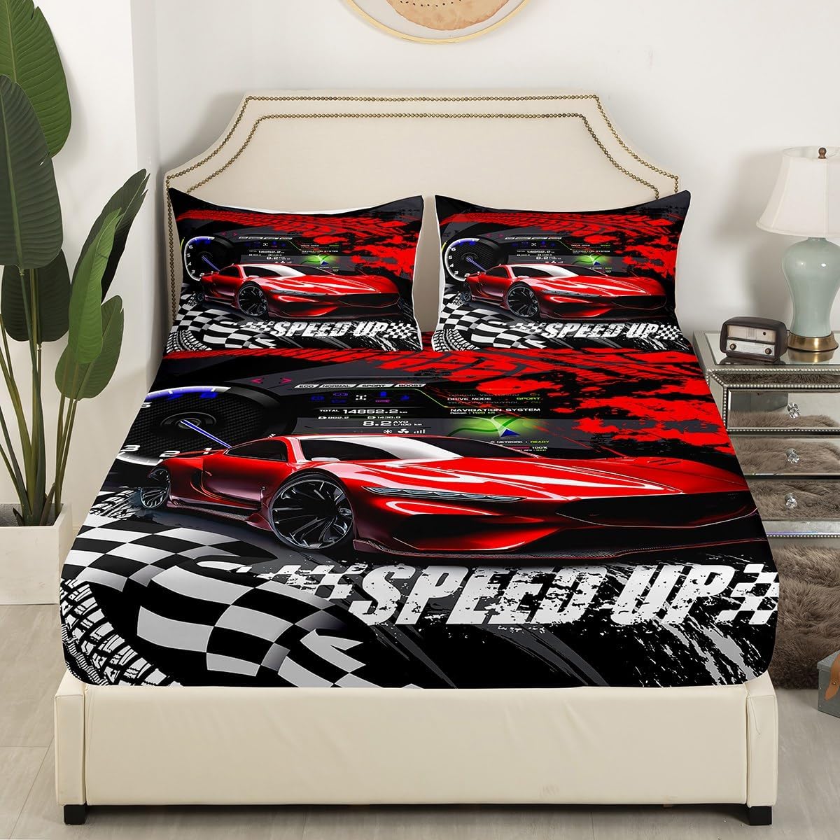 This vibrant race car bed sheet set is designed to bring excitement and comfort to your bedroom. Crafted from 100% microfiber fabric, it offers a soft, smooth feel that keeps you cozy all night long. The deep pocket fitted sheet, complete with elastic all around, ensures a secure fit on your mattress, while the matching pillowcases add a cohesive and stylish look to your bedding setup.
