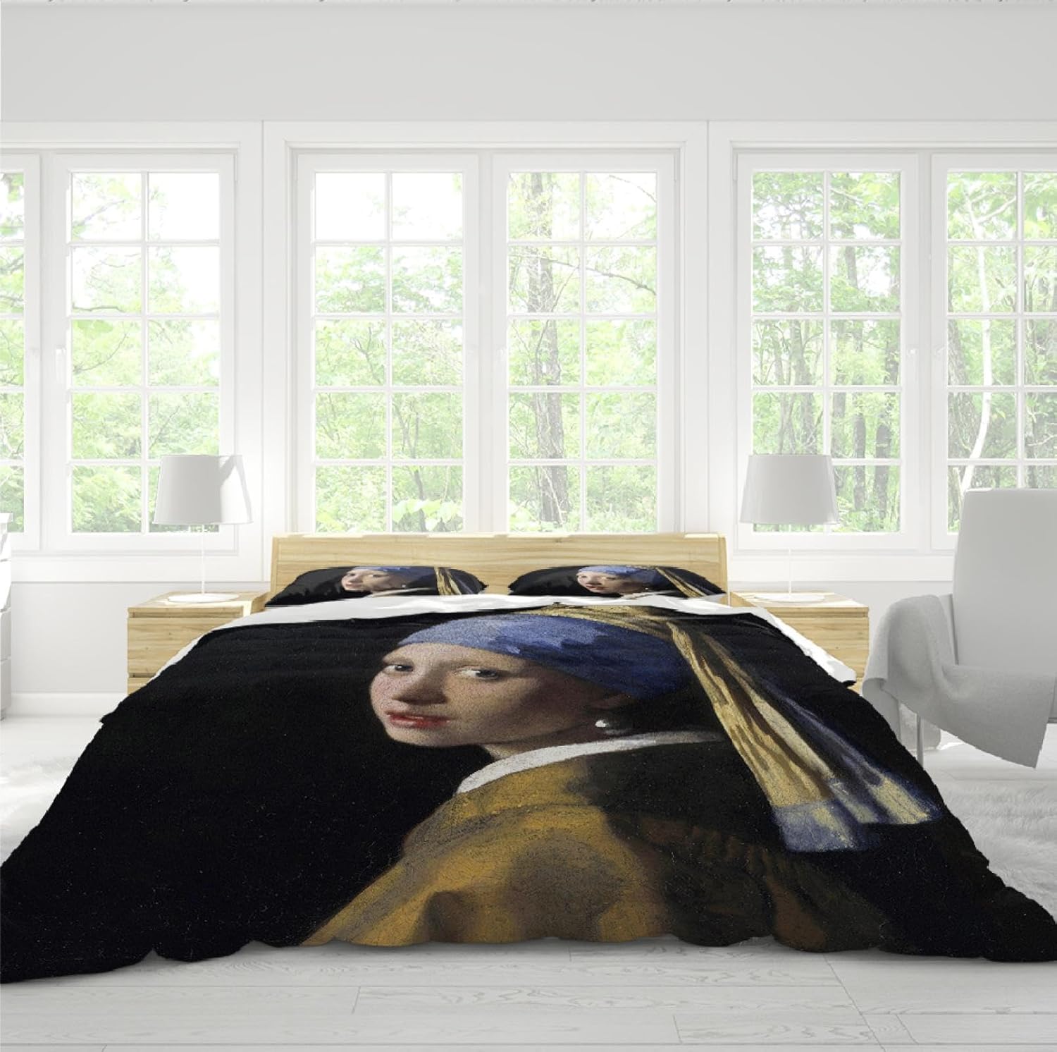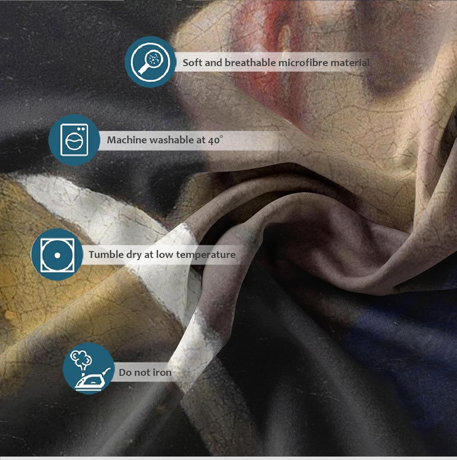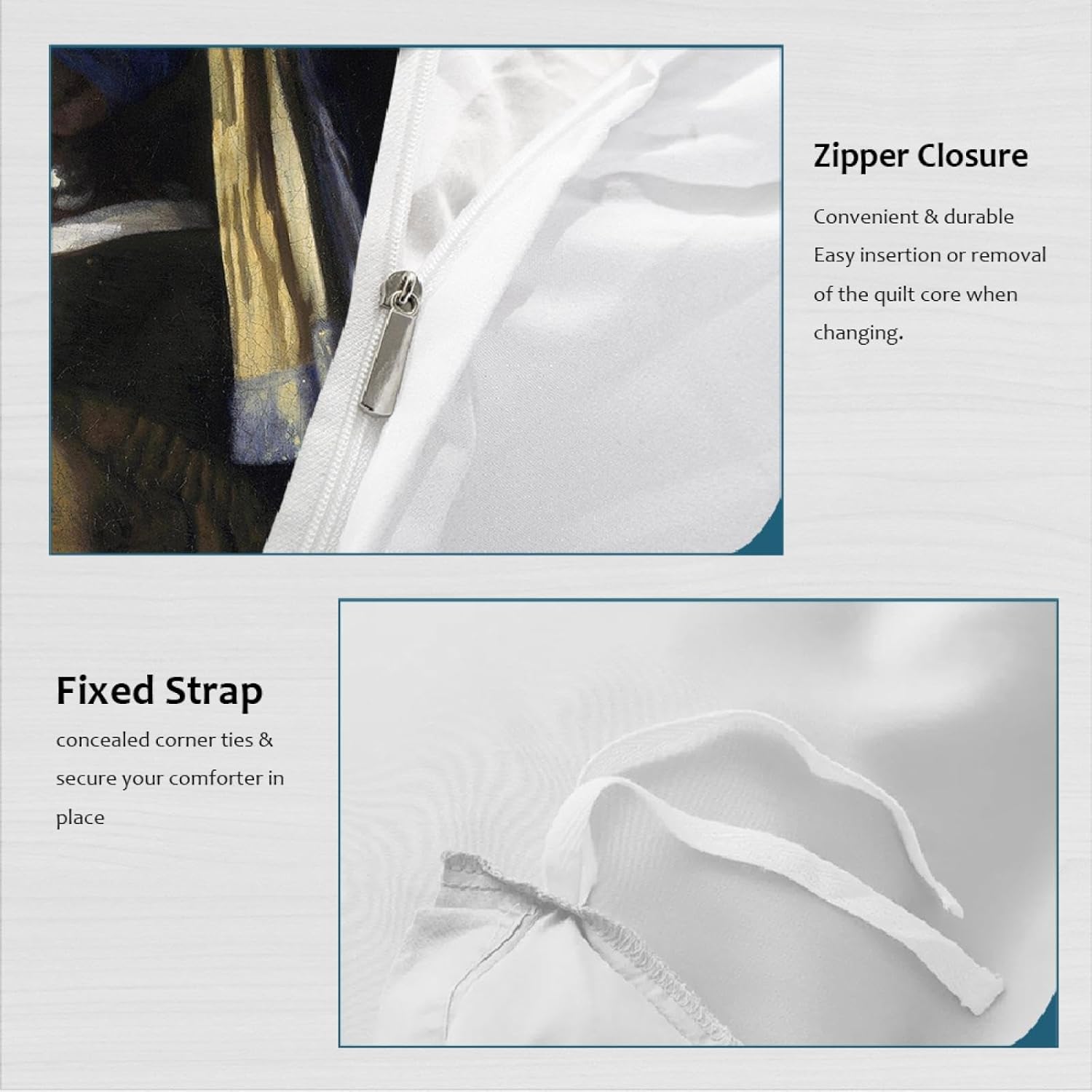 This luxury duvet cover set features soft microfiber fabric that feels like a second skin. The hidden zipper design ensures a seamless and secure closure, while the 4 corner ties keep your comforter in place without shifting. Perfect for all seasons, this set brings a timeless elegance to your bedroom with a design inspired by Vermeerâs iconic artwork.