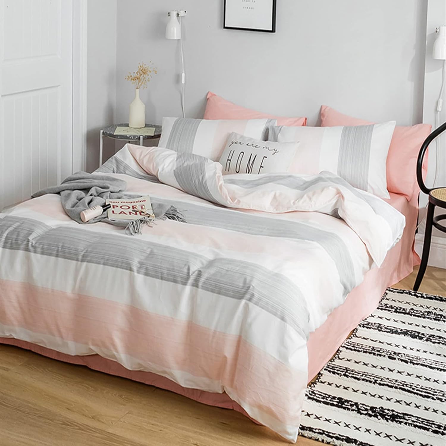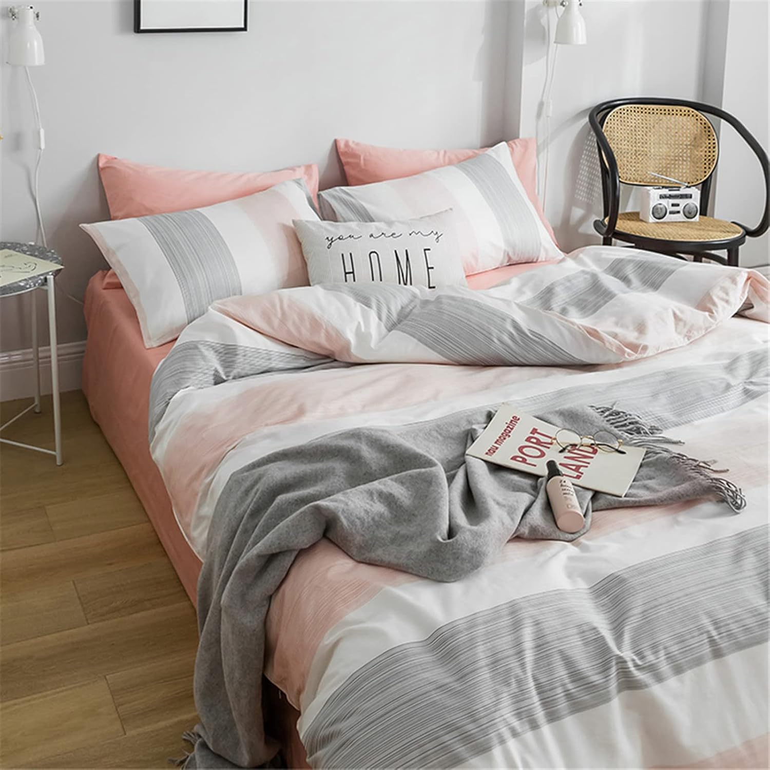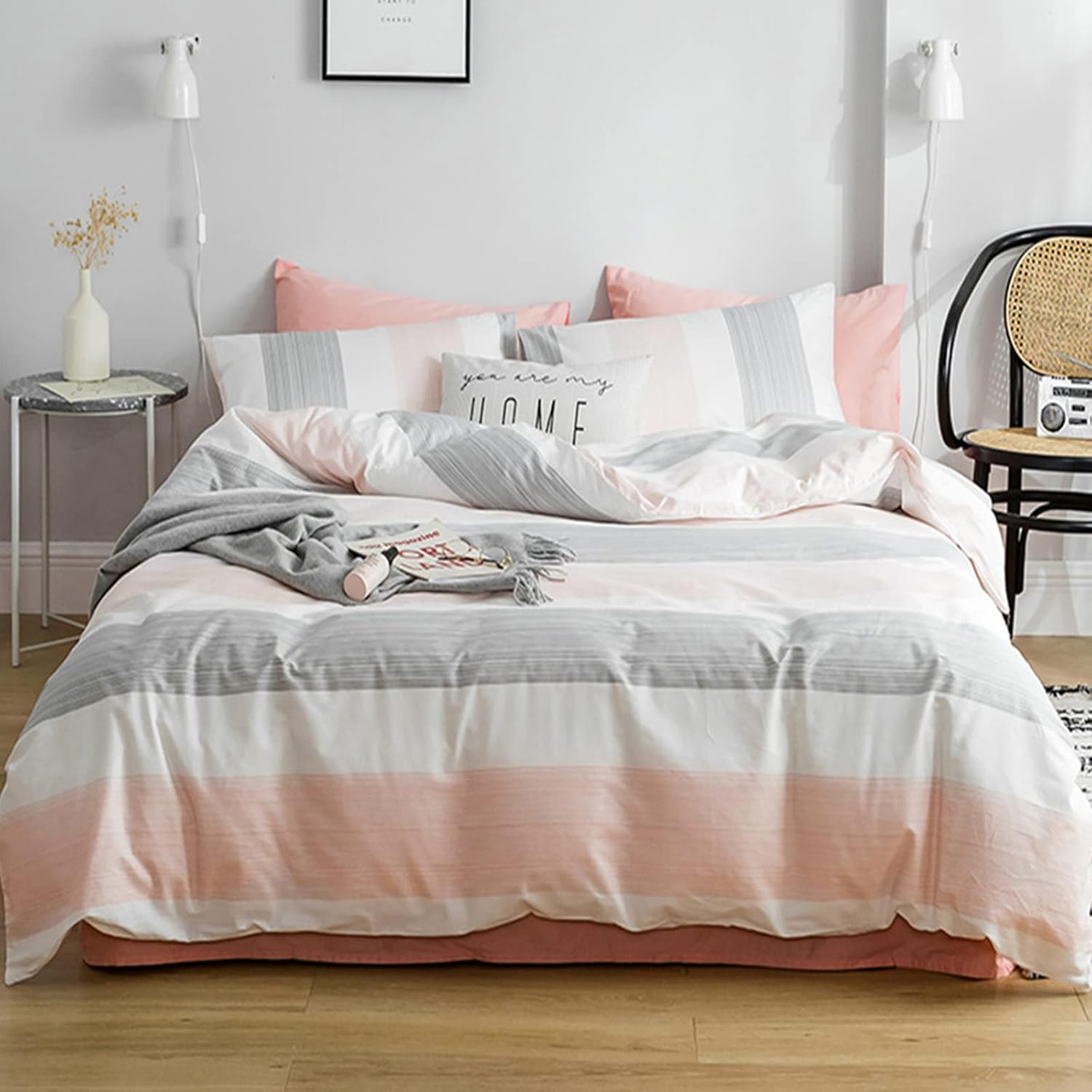 Bring a fresh and stylish touch to your bedroom with this 3-piece set that includes a duvet cover and two coordinating pillow shams. The reversible design lets you switch between bold geometric white and pastel pink patterns, giving your space a versatile and modern look. Made from ultra-soft premium cotton, this duvet cover is breathable, hypoallergenic, and perfect for all seasons.