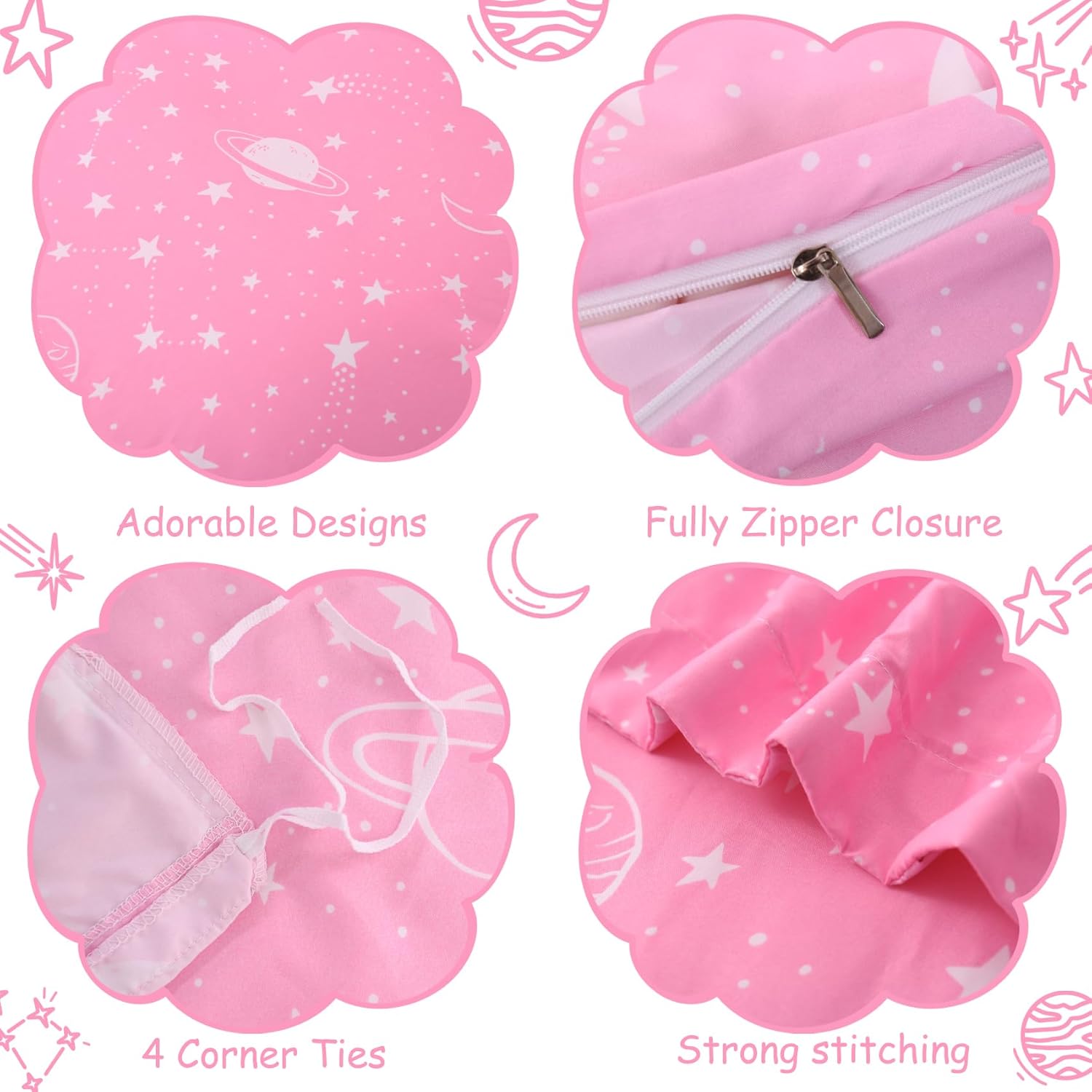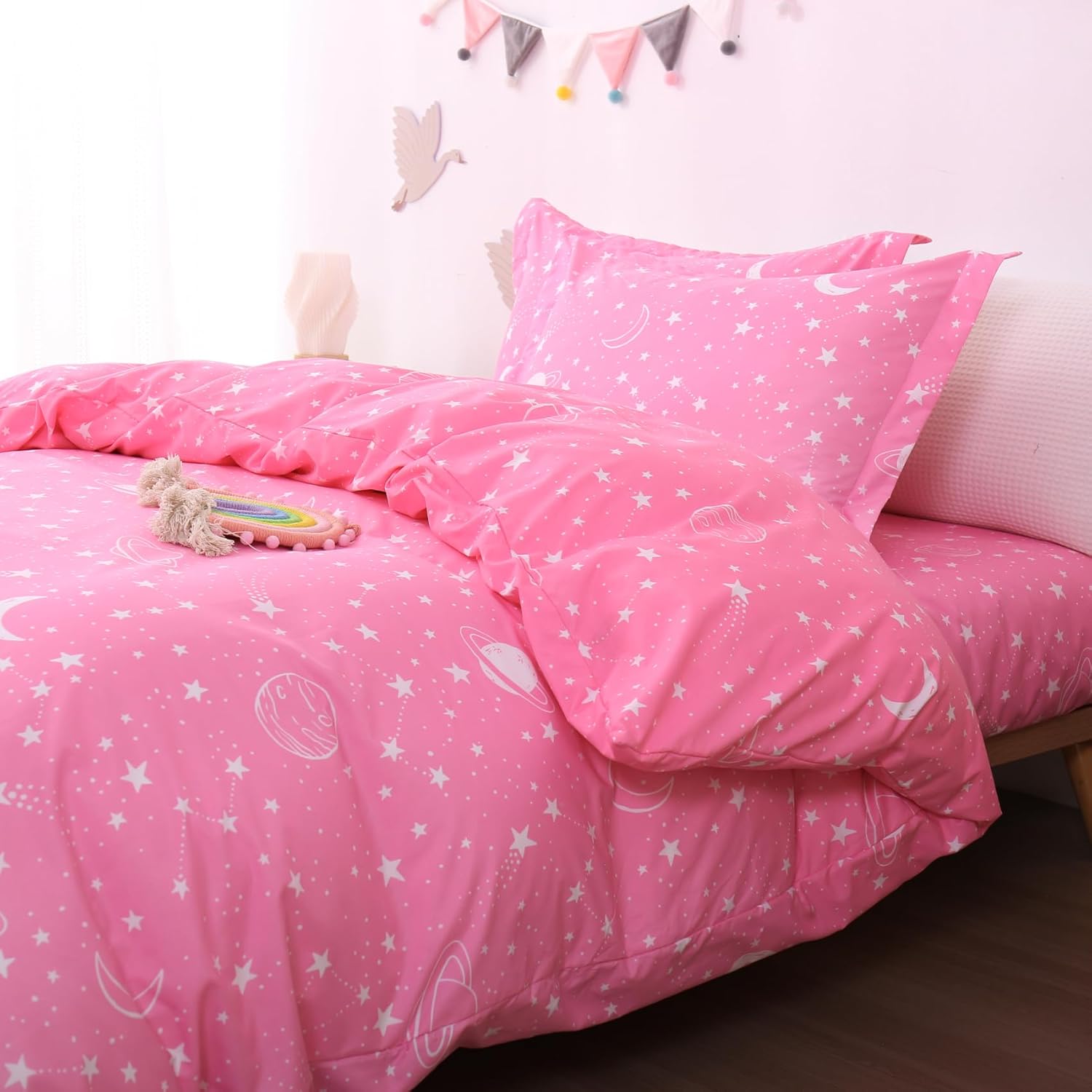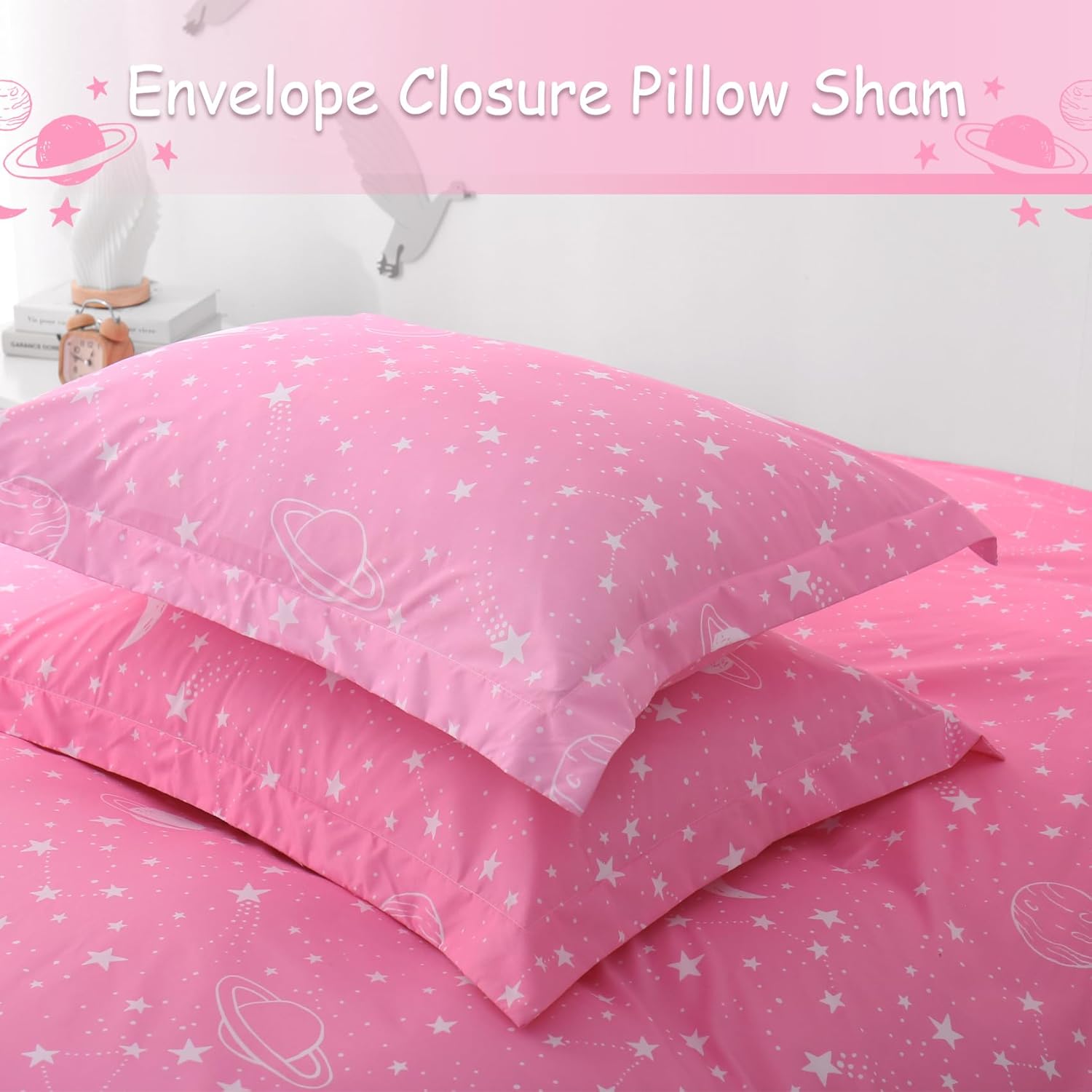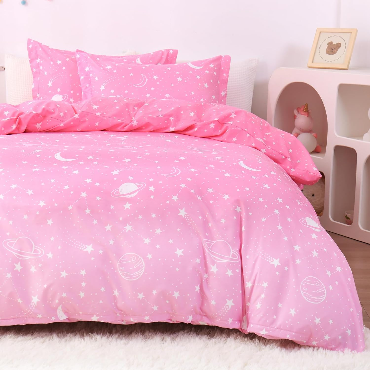Keywords: Kids Duvet Cover Set, Twin Size Duvet Cover, Pink Stars Bedding, Space Theme Comforter Cover, Microfiber Duvet Set