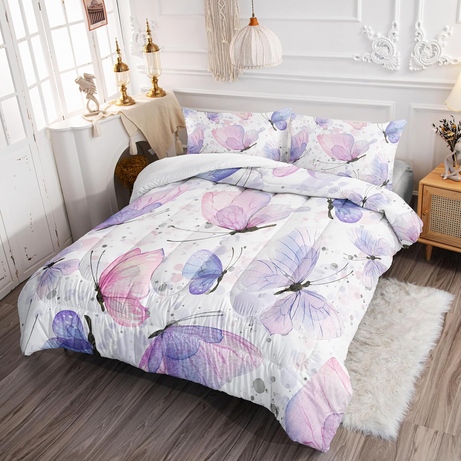 This 3-piece kids comforter set from Smell Sunshine is designed to bring both comfort and charm to your child's room. With a delightful butterflies printed pattern, it adds a whimsical and stylish touch to any bedroom decor. The set includes 1 full comforter (80x90 inches) and 2 pillowcases (20x30 inches), offering a complete and cozy sleeping solution. Crafted from premium microfiber, it's soft to the touch and built to last, ensuring a comfortable and resilient sleep experience through all seasons. The fabric is specially treated to resist fading and pilling, making it a long-term investment for your child's bedroom. It's also easy to machine wash, so you can keep the vibrant colors looking fresh with every use.