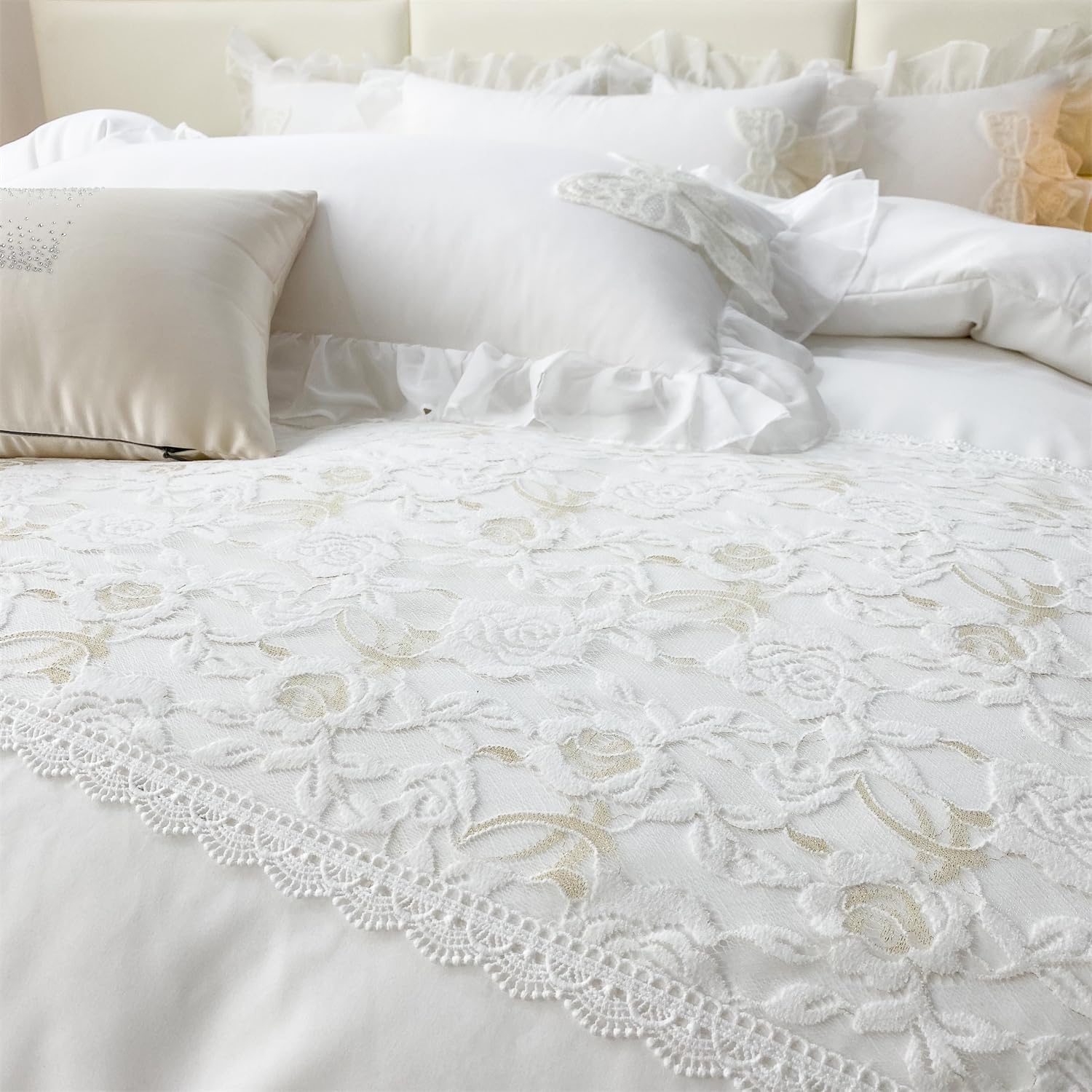 The bow and ruffle lace design adds a whimsical, regal feel to your bedding, making it the perfect centerpiece for your French princess-inspired room. This twin-sized set includes a duvet cover and matching pillow shams, ensuring a cohesive and stylish look for your bed.