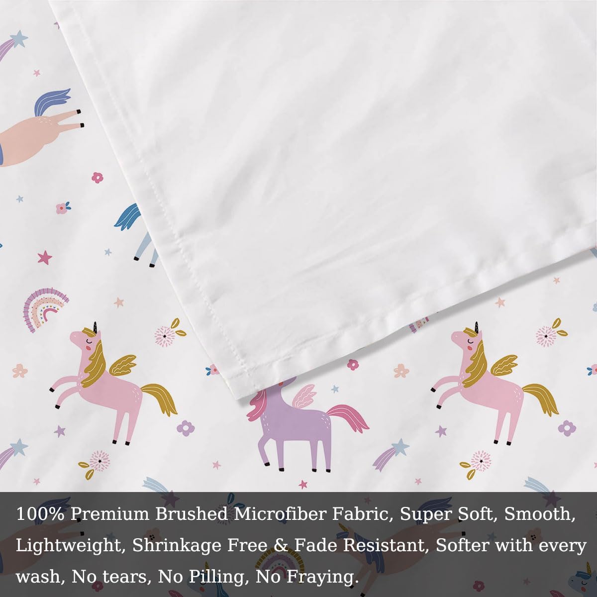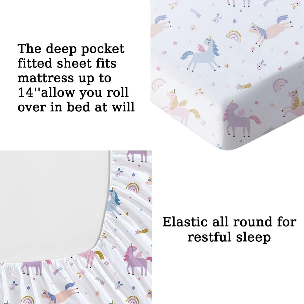 Keywords: unicorn bedding set, kids unicorn sheet set, vibrant unicorn fitted sheet, rainbow unicorn bedding, fun unicorn sheets