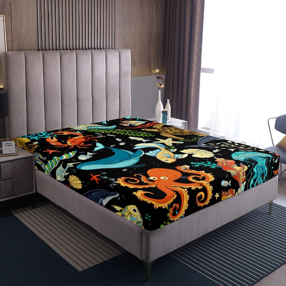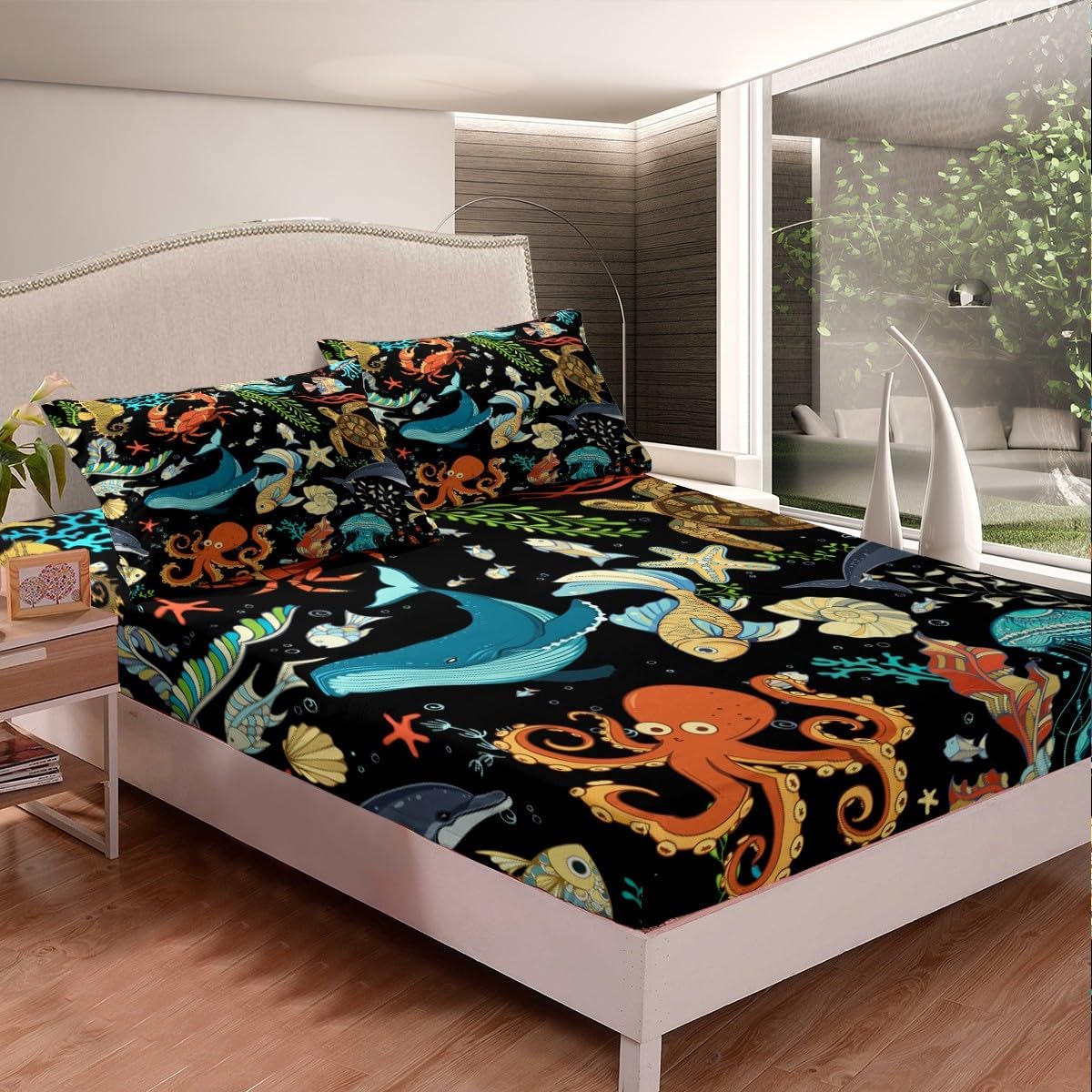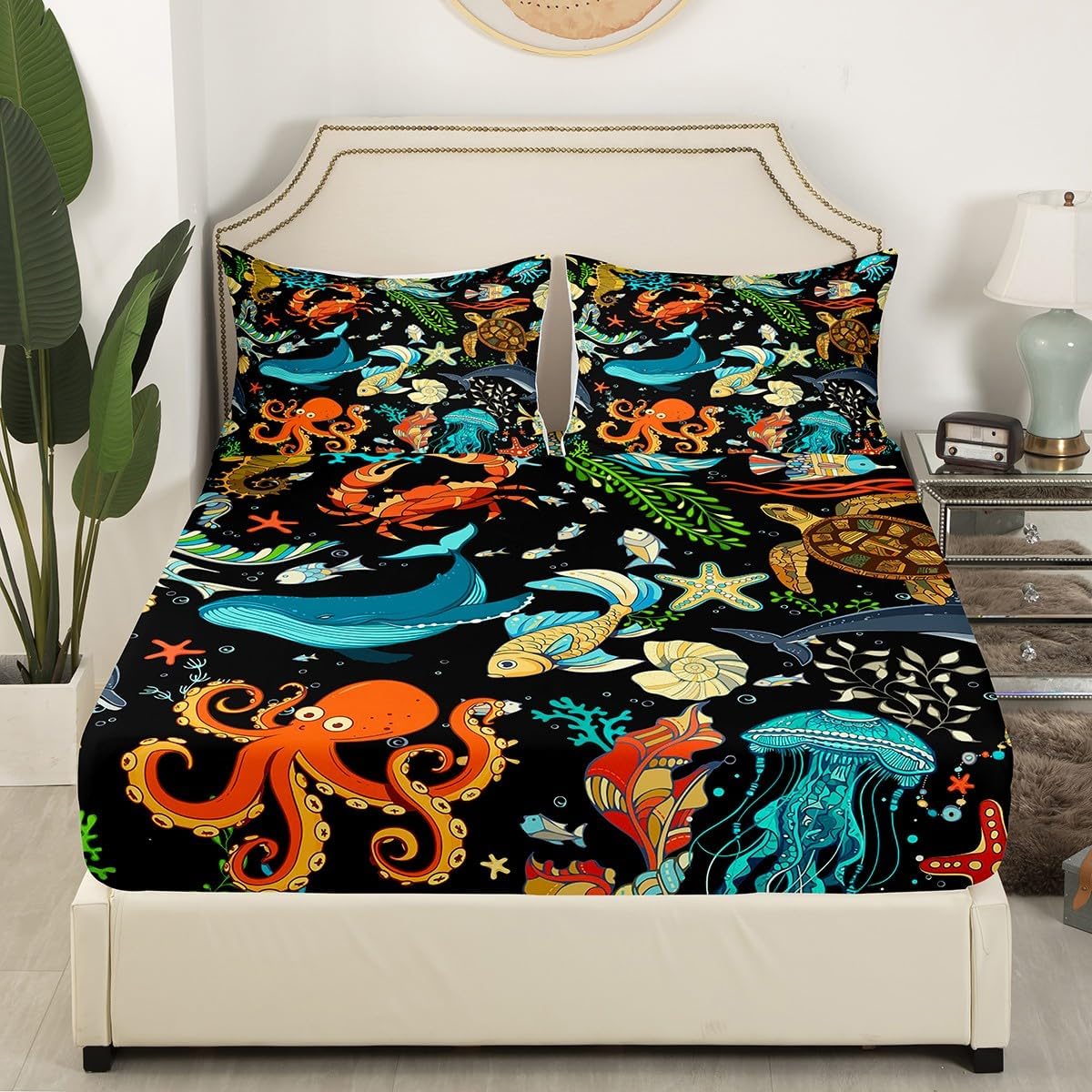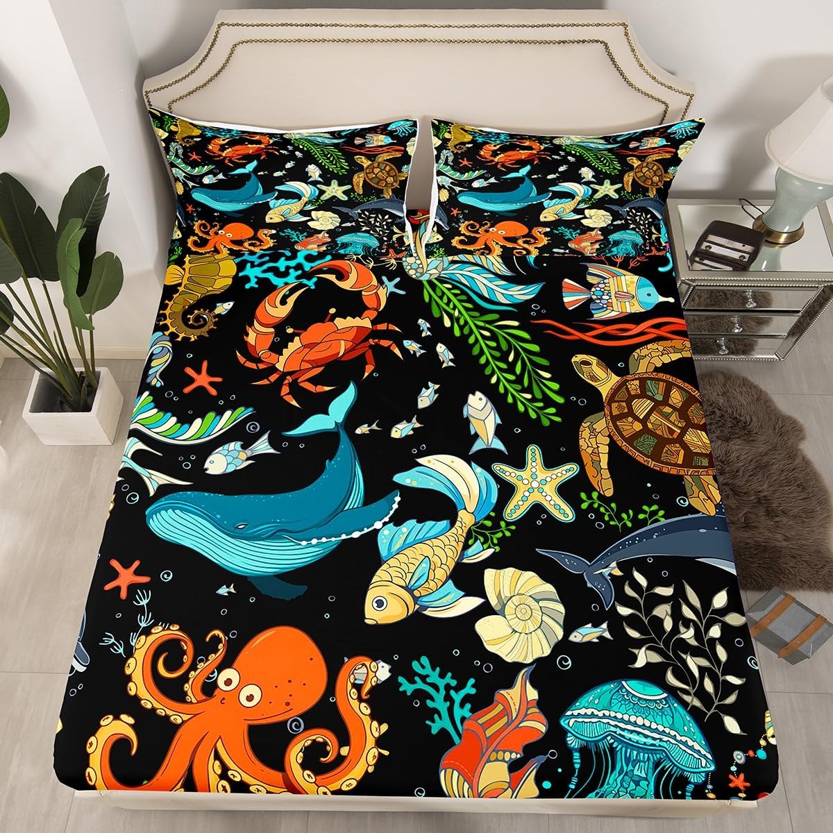 Keywords: marine life fitted sheet set, kids room bedding, watercolor bed sheets, octopus crab whale bed cover, eco-friendly pillowcase set