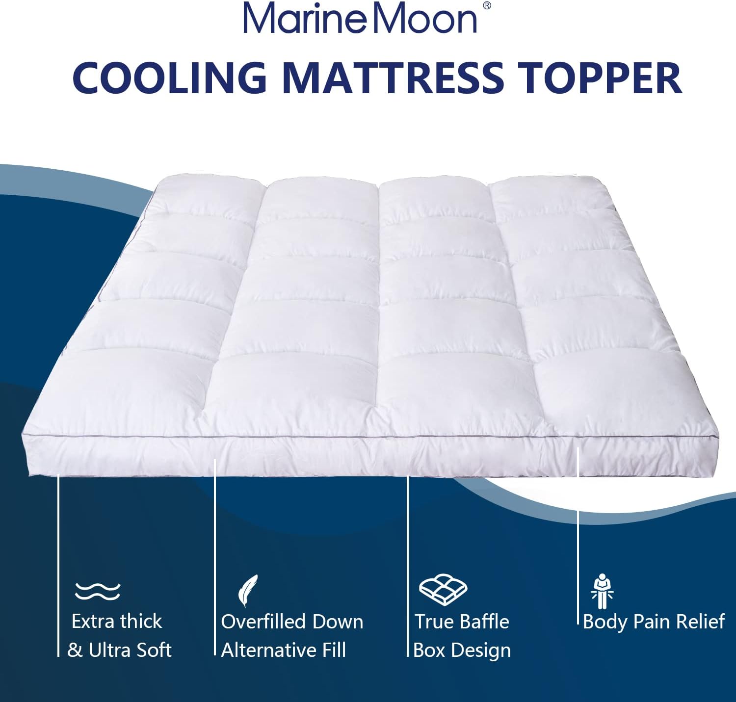 Elevate your rest without the hassle of buying a new mattress. The Marine Moon Queen Mattress Topper delivers a cloud-like feel with its ultra-plush cooling design, offering the perfect blend of softness and support. It's an ideal solution for anyone looking to improve their sleep comfort, whether you're a side, back, or stomach sleeper.