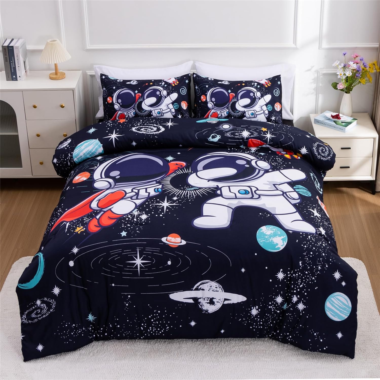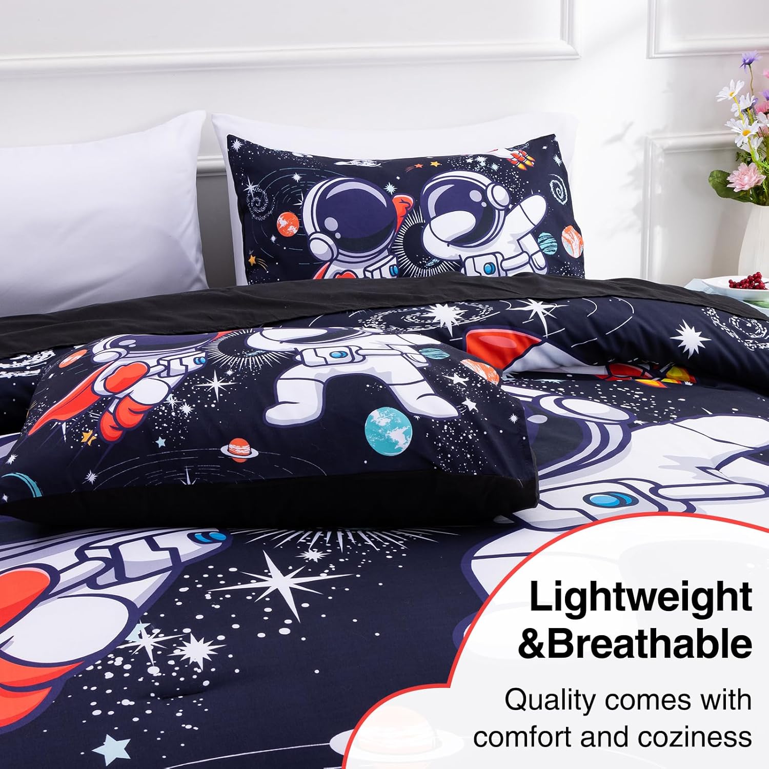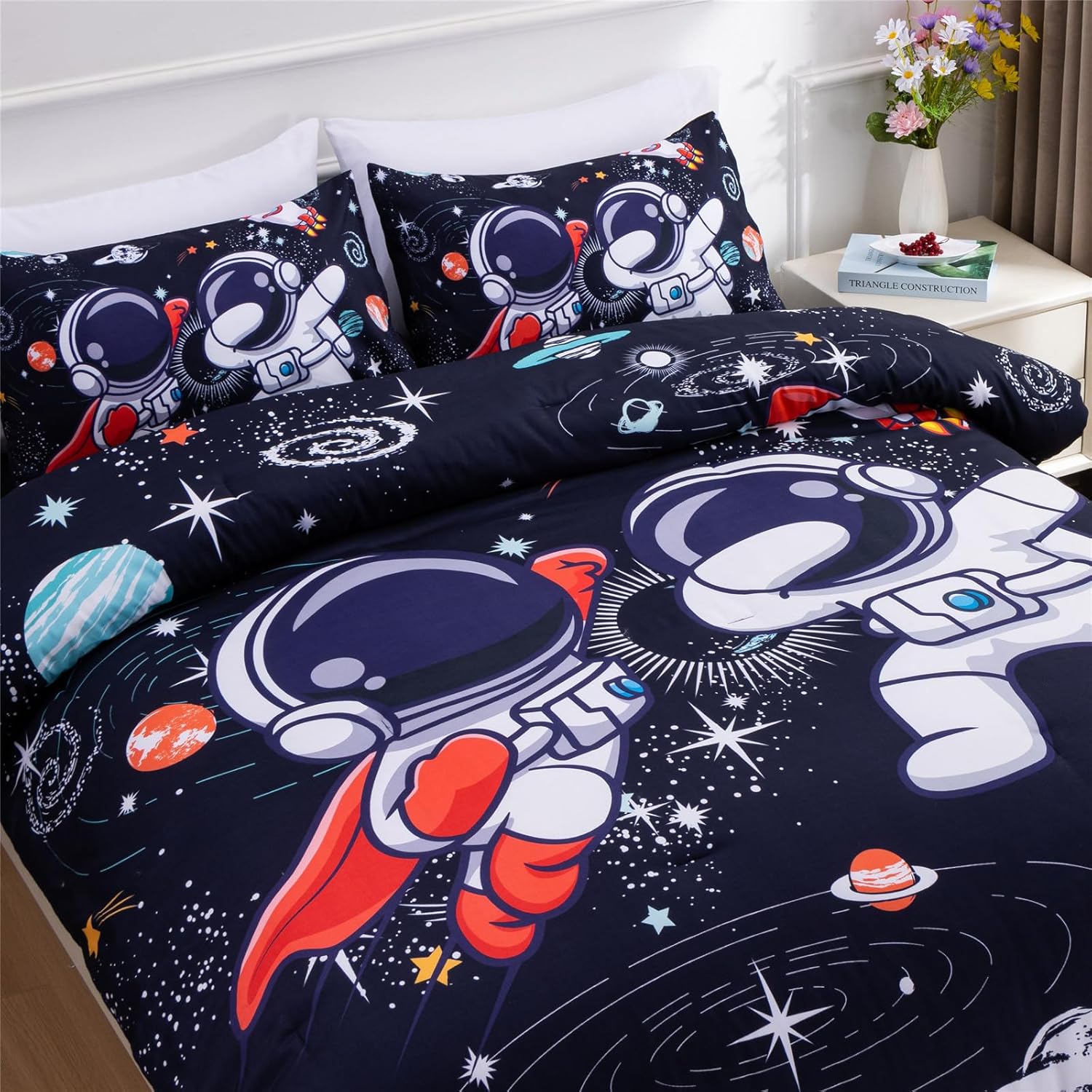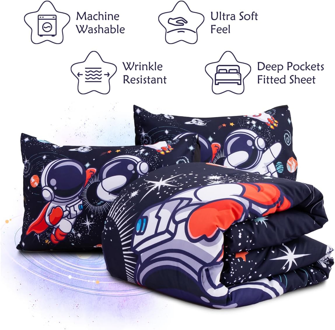 Transform your childâs bedroom into a celestial haven with our 3-piece space-themed comforter set. Designed to spark imagination and curiosity, the set features bold images of astronauts, rockets, and planets that bring the wonder of the universe to life.