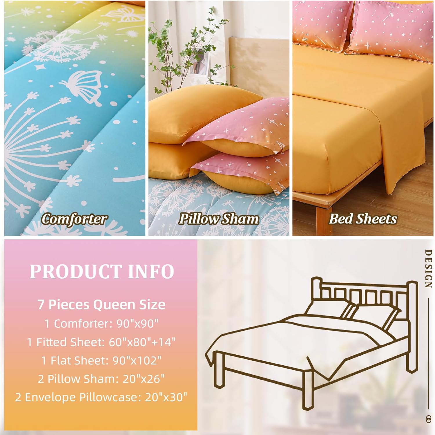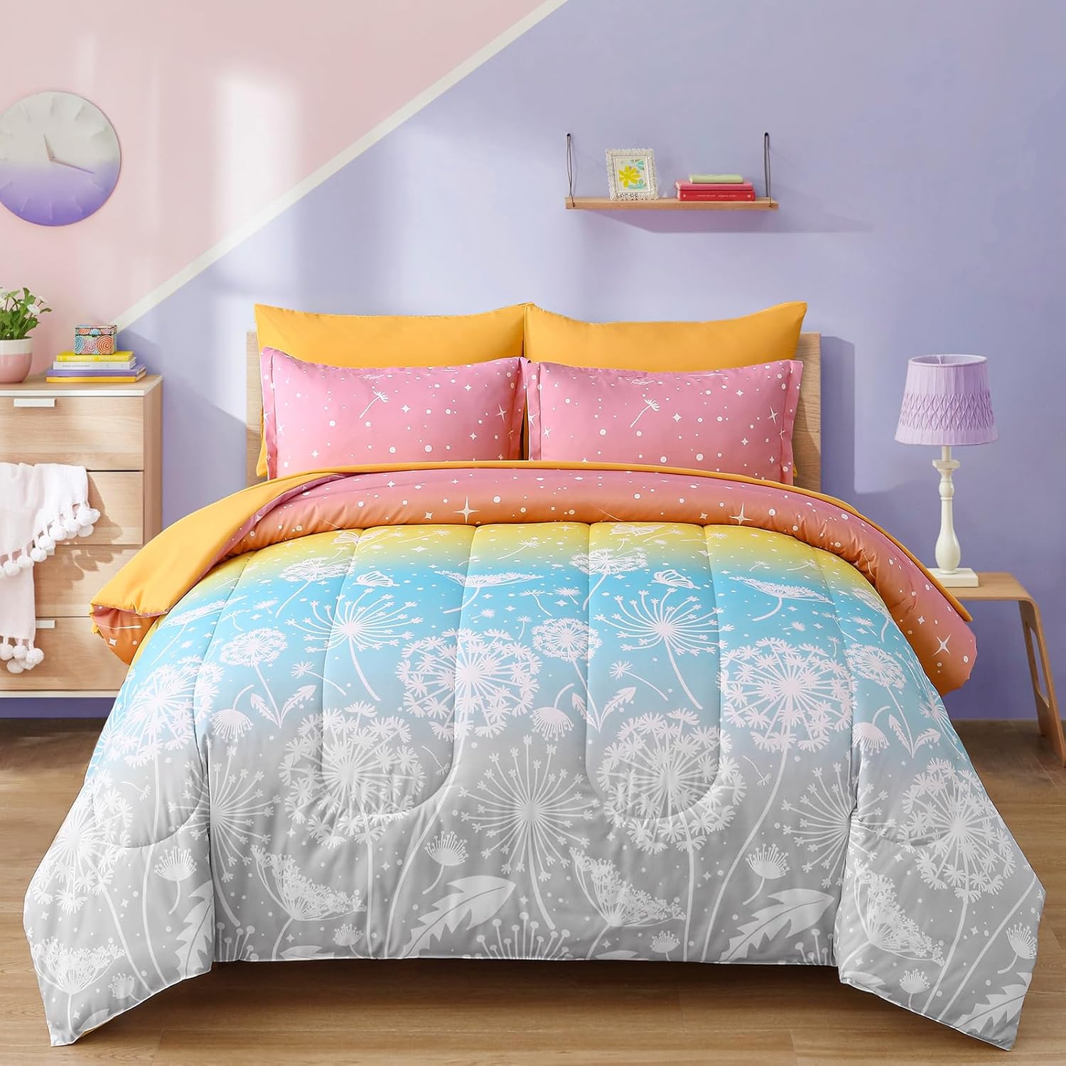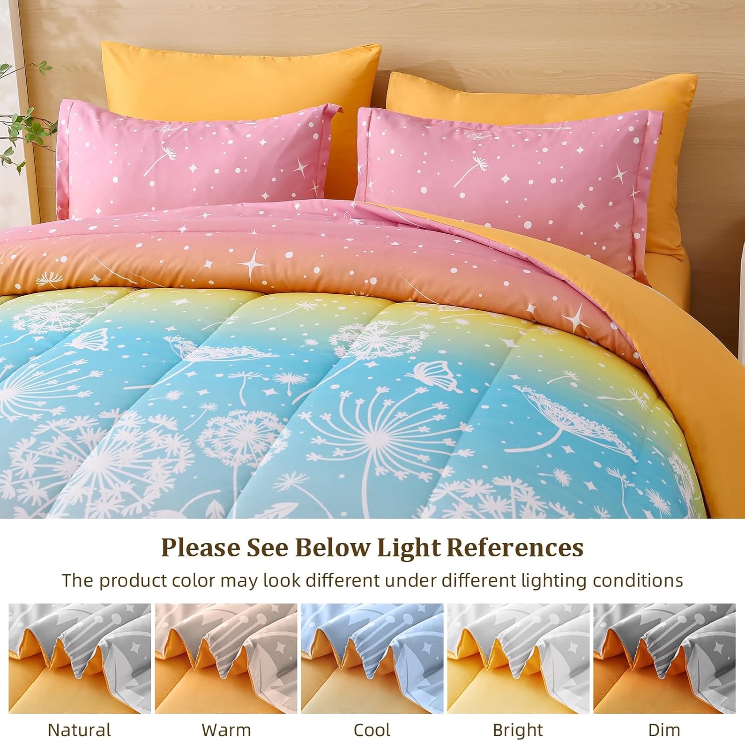 This 7-piece comforter set adds a playful and soothing vibe to any young girlâs room. With its vibrant dandelion and butterfly print, it brings a sweet and magical feel to bedtime. The ombre rainbow gradient adds a touch of wonder, making it a stunning centerpiece for your bedroom decor. Designed with soft microfiber fabric, this set offers a comfortable and breathable sleep experience, perfect for all-nighters and restful naps. The tight stitching ensures that every piece remains intact and durable over time. Whether you're looking for a new bedtime setup or an adorable gift for a special occasion like a birthday or Christmas, this comforter set is a wonderful choice.