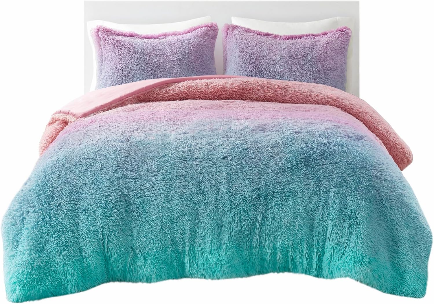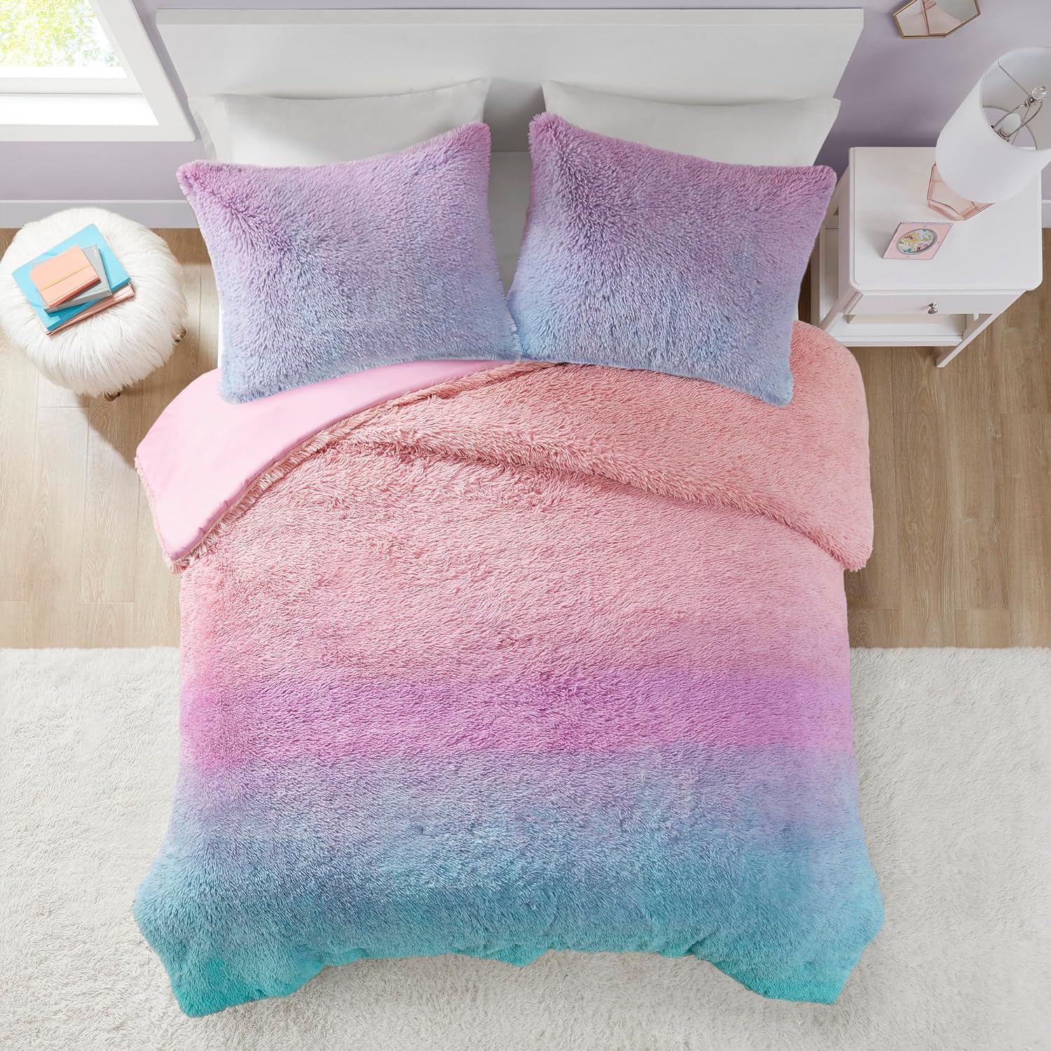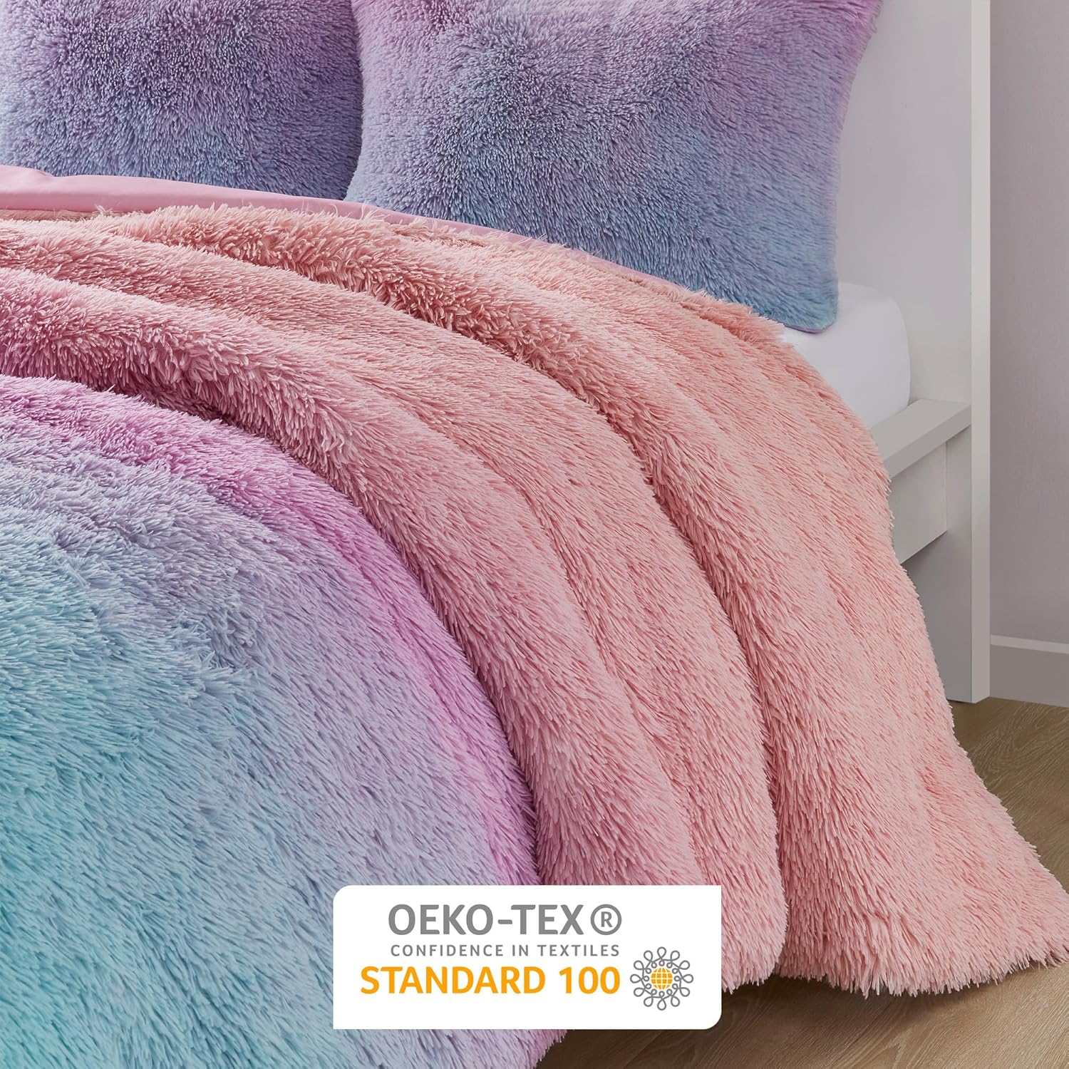 This kids comforter set brings a touch of luxury to your child's bedroom with its ultra soft faux fur material. The fluffy texture and vibrant ombre design featuring pink, purple, and aqua hues create a calming, cheerful atmosphere thatâs perfect for any little one. Whether itâs a crisp winter night or a cool spring evening, the down alternative filling ensures consistent warmth and comfort without the mess, making it ideal for year-round use. Designed with sensitive skin in mind, it's OEKO-TEX certified for safe and hypoallergenic sleep. This set includes 1 comforter and 2 matching shams to complete your bedding arrangement. Machine washable for easy care, this bed set is not only functional but also a stylish addition to your childâs room.
