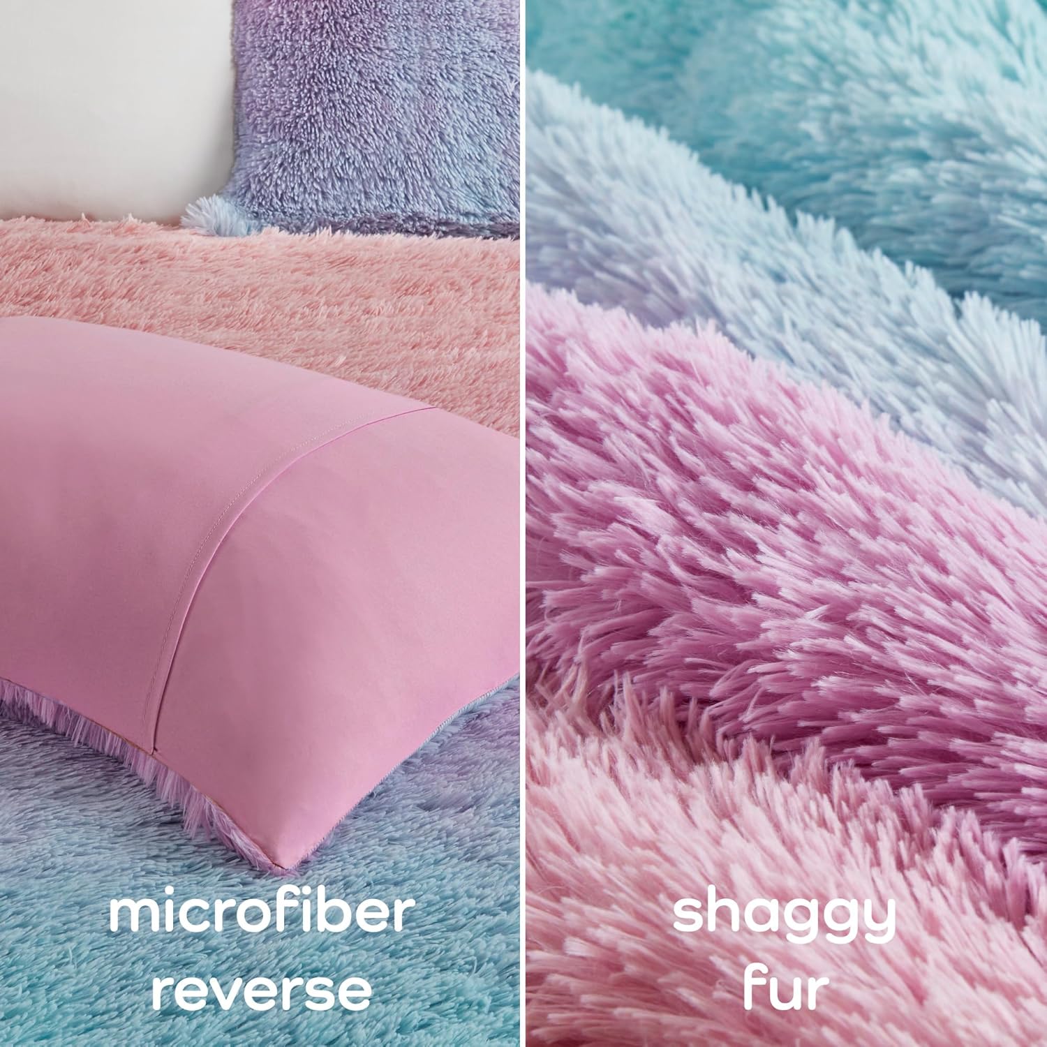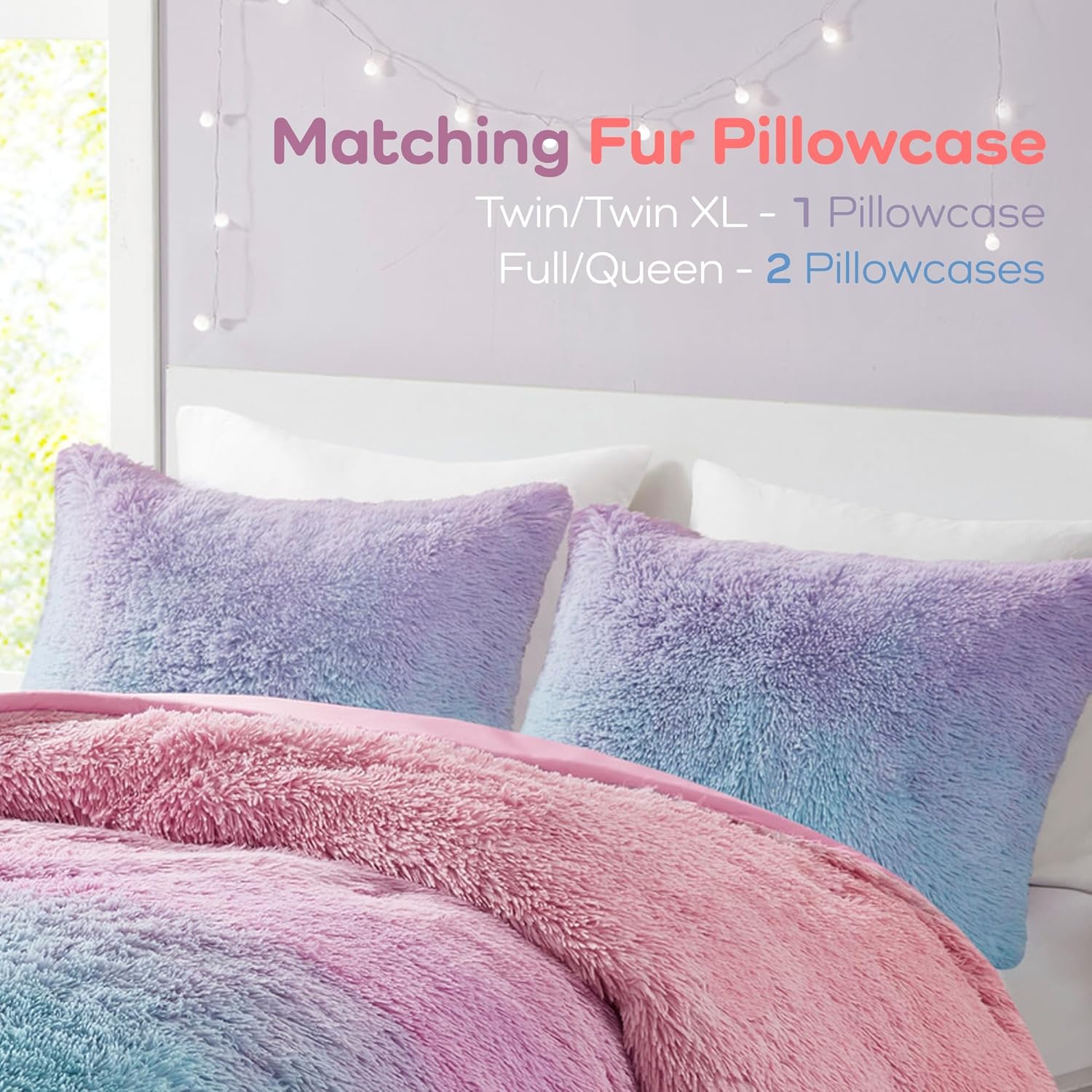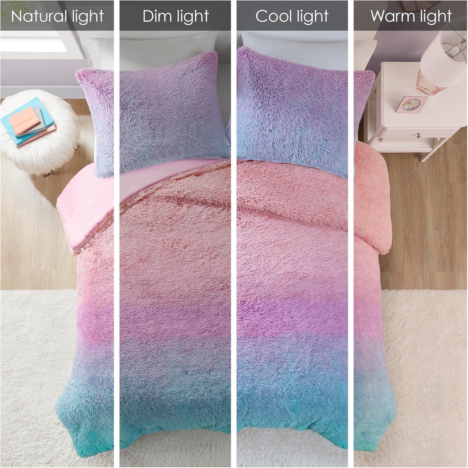 This kids comforter set brings a touch of luxury to your child's bedroom with its ultra soft faux fur material. The fluffy texture and vibrant ombre design featuring pink, purple, and aqua hues create a calming, cheerful atmosphere thatâs perfect for any little one. Whether itâs a crisp winter night or a cool spring evening, the down alternative filling ensures consistent warmth and comfort without the mess, making it ideal for year-round use. Designed with sensitive skin in mind, it's OEKO-TEX certified for safe and hypoallergenic sleep. This set includes 1 comforter and 2 matching shams to complete your bedding arrangement. Machine washable for easy care, this bed set is not only functional but also a stylish addition to your childâs room.