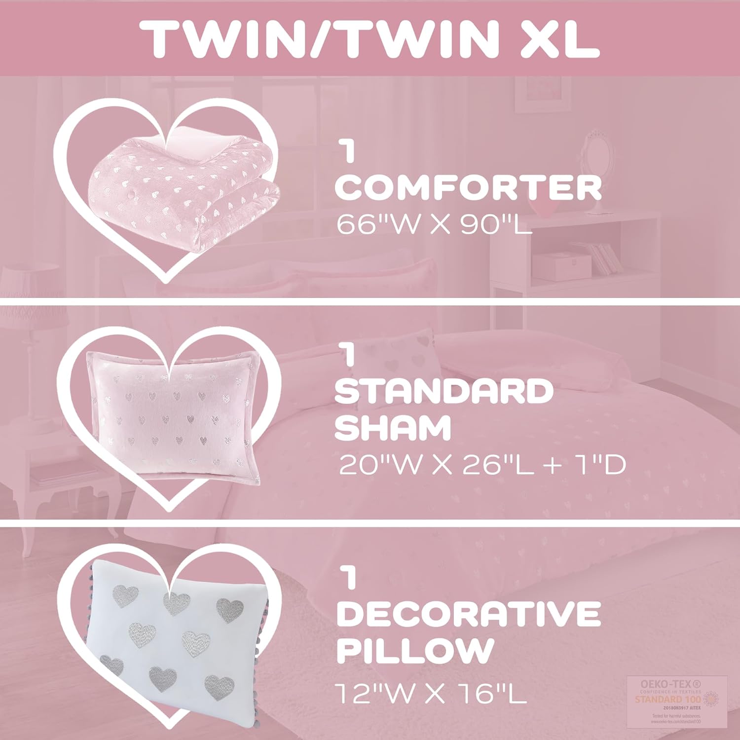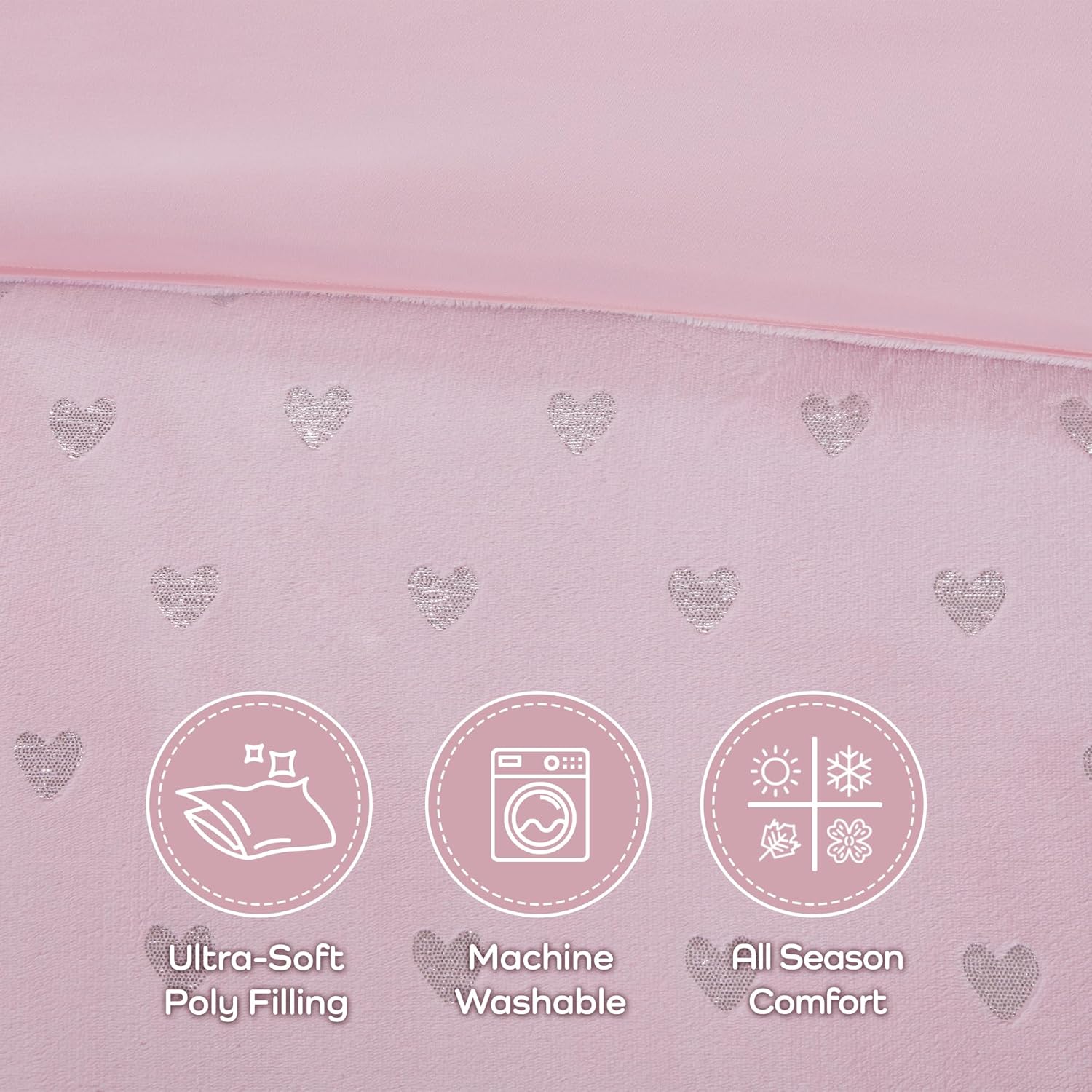 Transform your child's bedroom into a cozy and stylish retreat with our ultra-soft Mi Zone Rosalie Comforter Set. Designed for comfort and charm, this set combines a metallic printed hearts pattern on one side with a soft, brushed solid color on the reverse, creating a versatile and elegant look that complements any nursery or room decor.