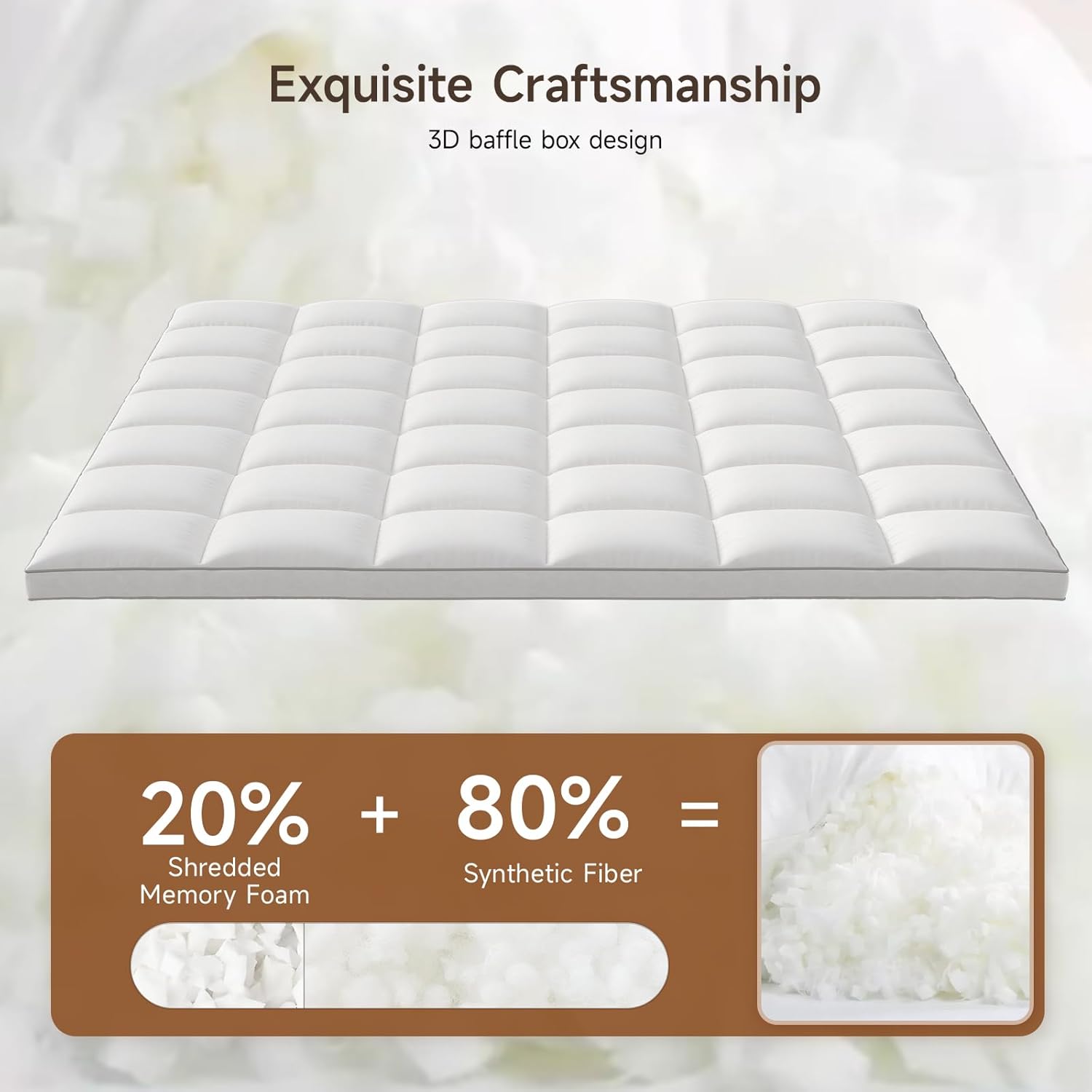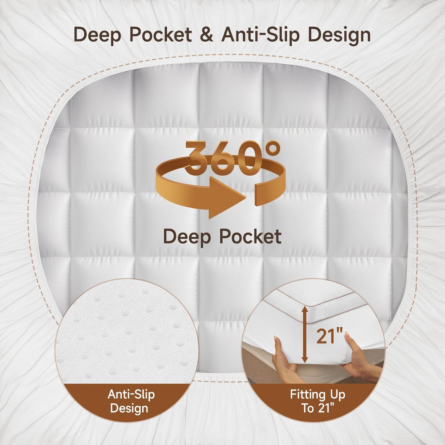 With deep elastic edges, this topper ensures a snug and secure fit on queen-sized mattresses ranging from 8 inches to 21 inches. Its 360° anti-slip technology keeps it firmly in place, preventing any shifting or slippage during the night for uninterrupted sleep.