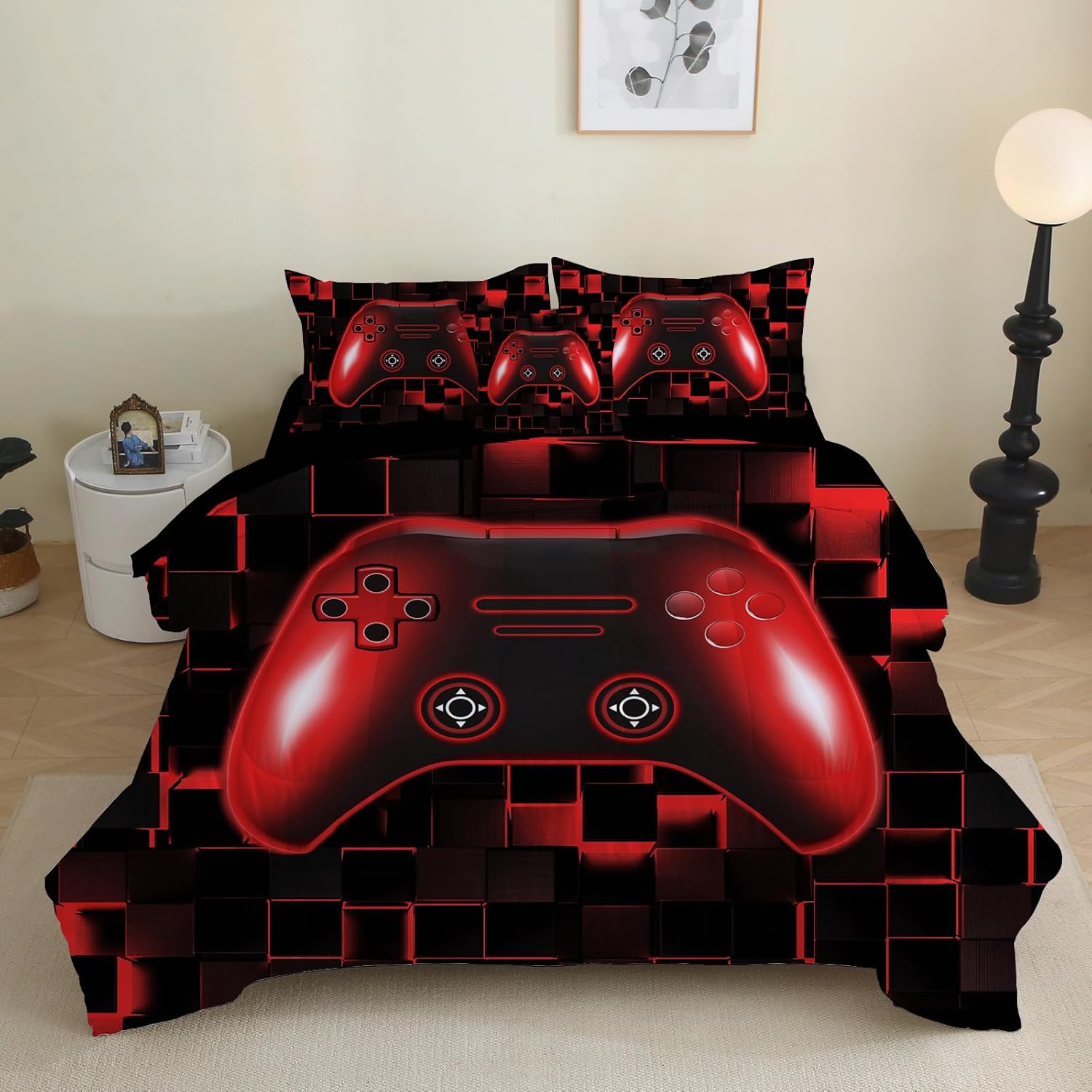 Transform your little gamer's bedroom into a cozy, game-themed haven with this 6-piece gamer comforter set. Designed for twin size beds, it features soft microfiber filling that keeps your child comfortable and warm throughout the night and day. The vibrant red color adds a bold, stylish touch while the reversible design lets you switch up the look effortlesslyâperfect for gaming sessions and restful sleep.