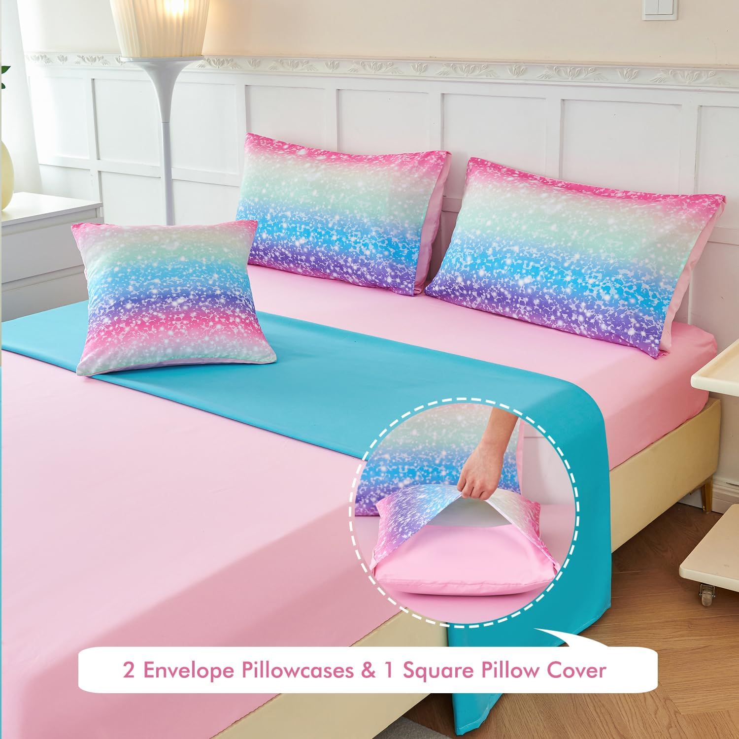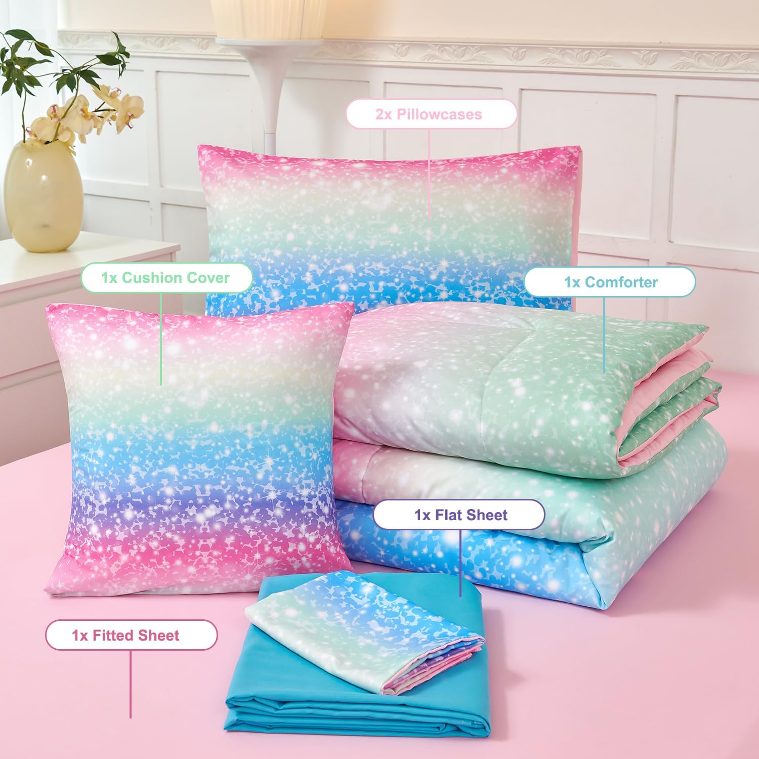 Whether you're decorating a child's bedroom, adding a cozy touch to a guest room, or searching for a thoughtful gift for a young girl, this set delivers both elegance and functionality. It's not only eye-catching with its gradient glitter design but also easy to maintain with machine washable and tumble dry options.