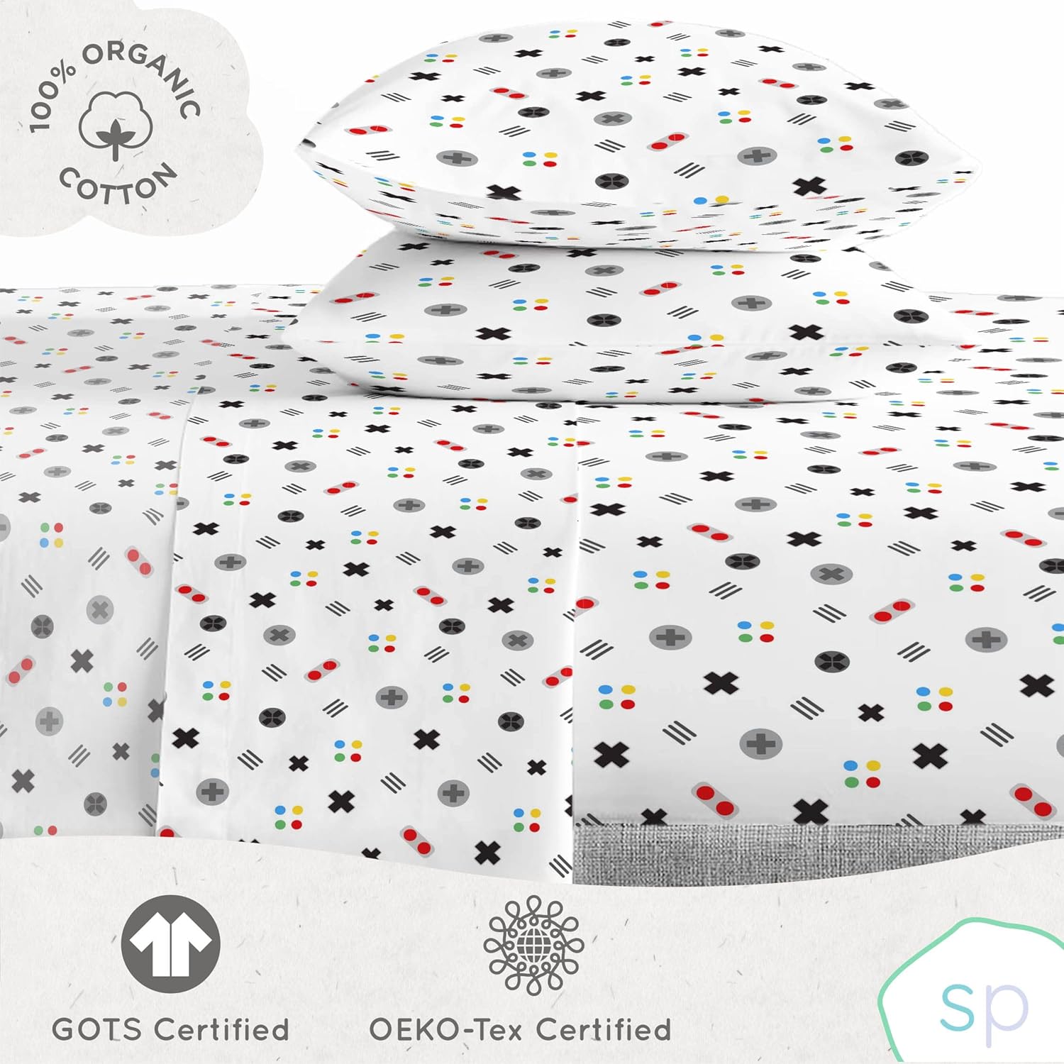 Elevate your childâs room with a playful and functional gaming-themed bedding solution. This 7-piece set is crafted from 100% organic cotton, ensuring softness and safety for sensitive skin. The fabric is both eco-friendly and hypoallergenic, designed to last through frequent use and maintain its vibrant color year after year.