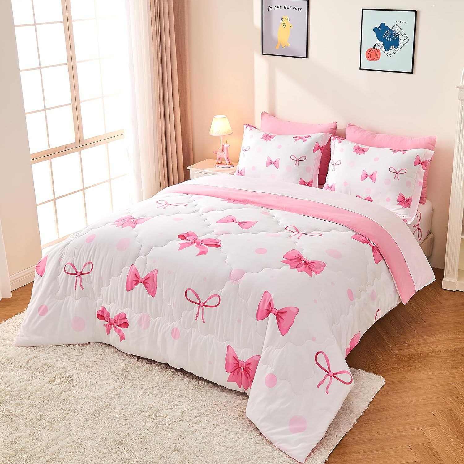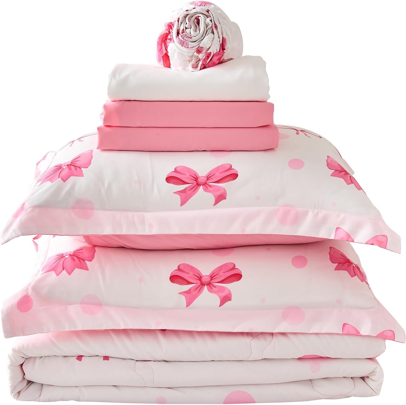 Create a dreamy, personalized sleeping space for your little girl with this 7-piece pink bow bedding set. Designed for a queen-sized bed, it includes a beautiful comforter with playful pink bow prints, paired with matching fitted and flat sheets, two pillow shams, and two pillowcases. This set brings a charming, whimsical vibe to any bedroom while offering unmatched comfort and style.