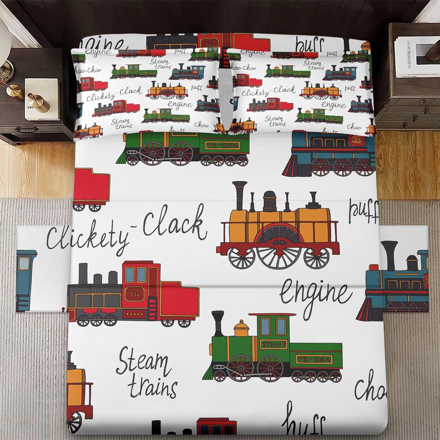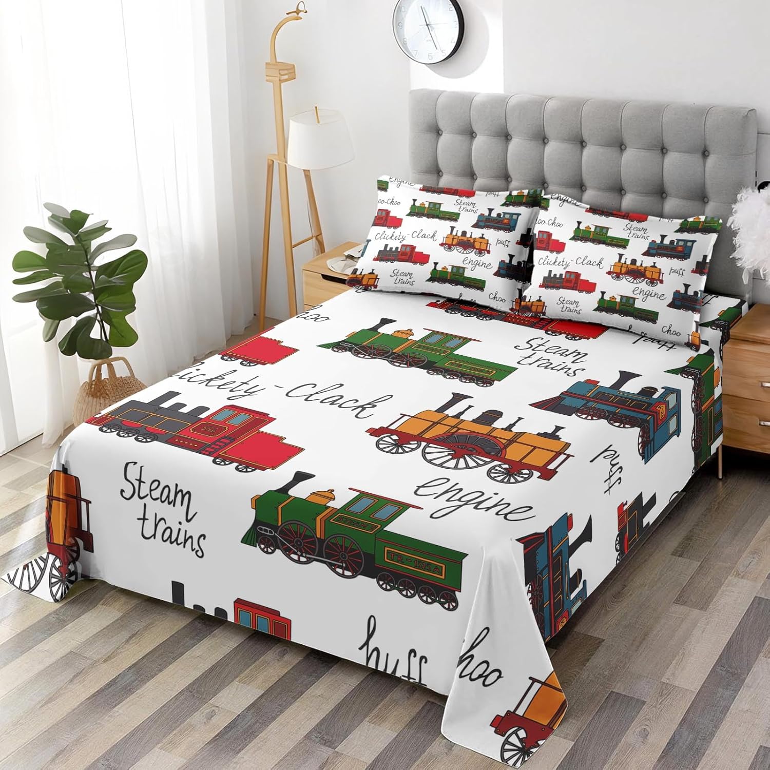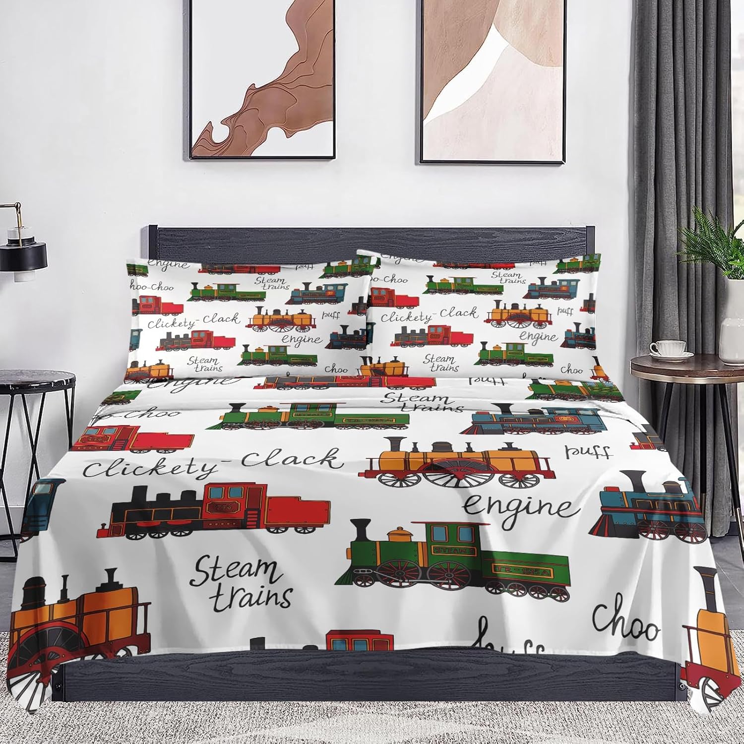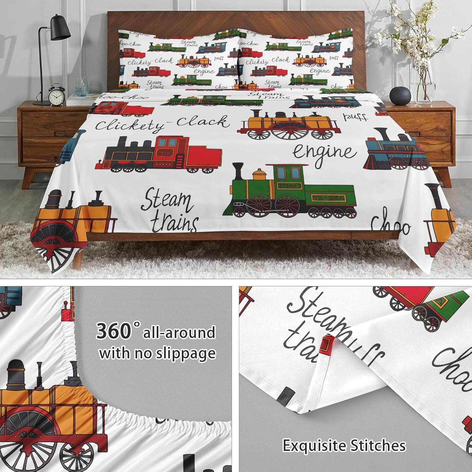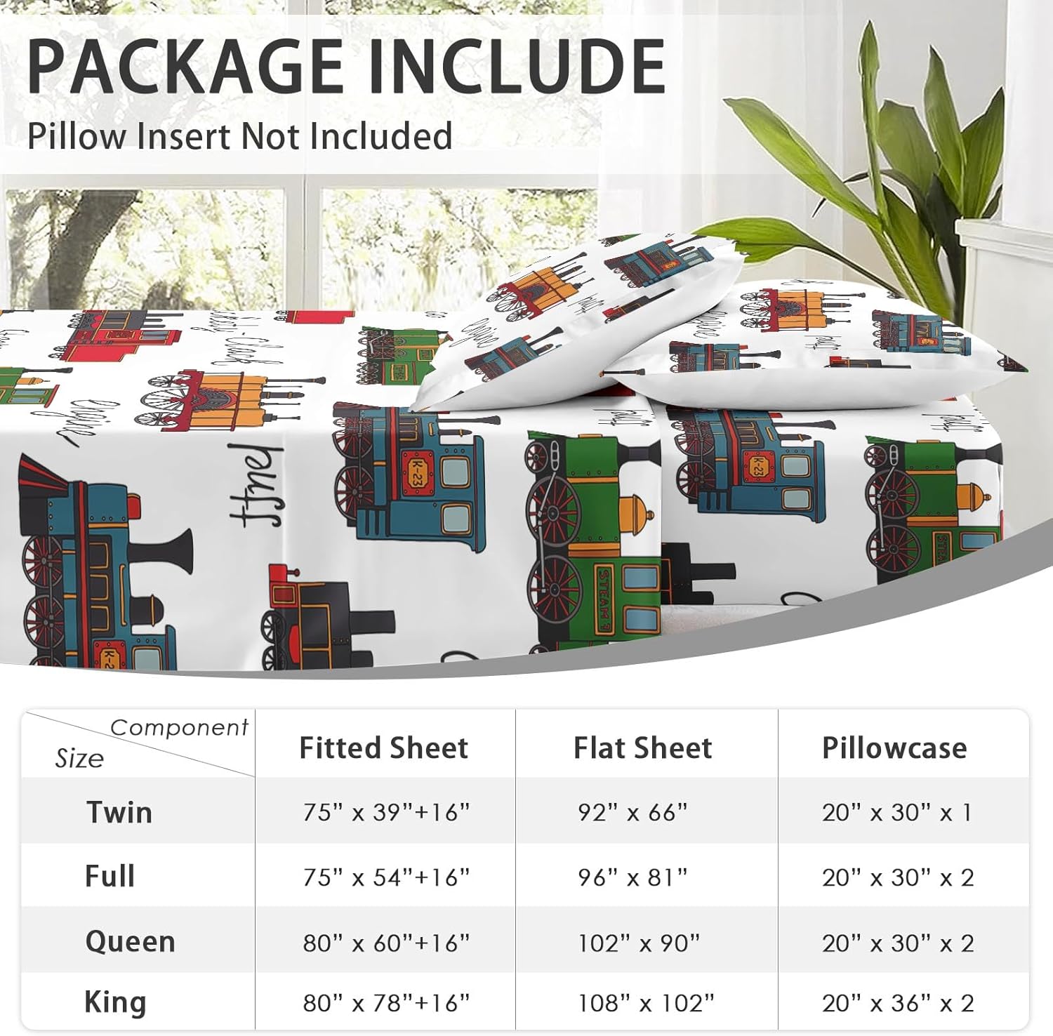 Elevate your sleep experience with WeCozy's Queen Size 4 Pcs Fitted Sheet Set. Combining soft microfiber, vibrant retro train design, and easy care, it's the ideal bedding solution for a cozy and inviting atmosphere.