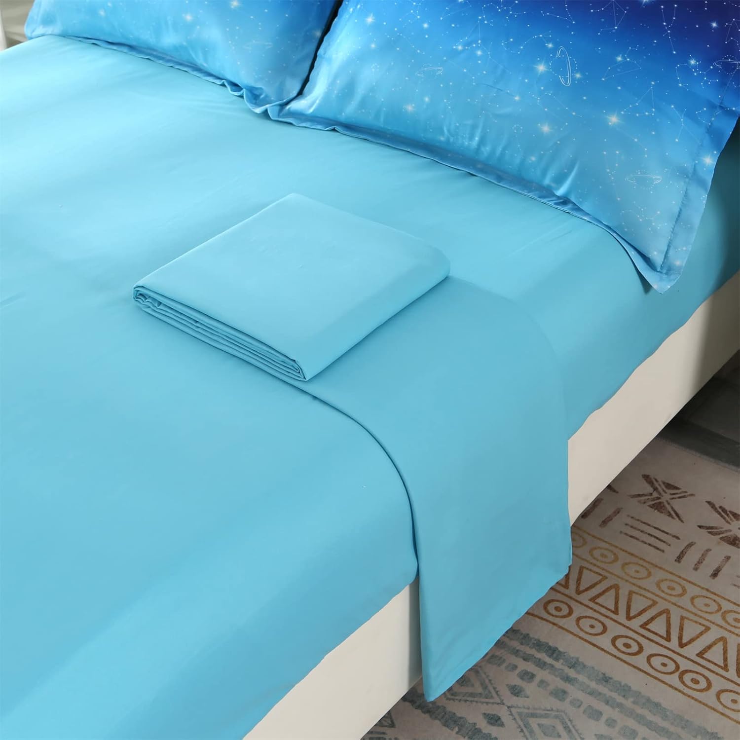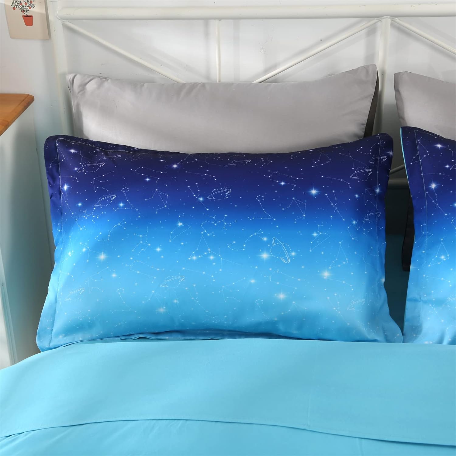 The standout 3D galaxy design features vibrant blue glitter stars that create a magical atmosphere. Whether your child is a fan of space, stars, or just something bright and cheerful, this glitter comforter set adds a fun and creative touch to their room. The intricate detailing gives it a unique look that's both modern and enchanting.