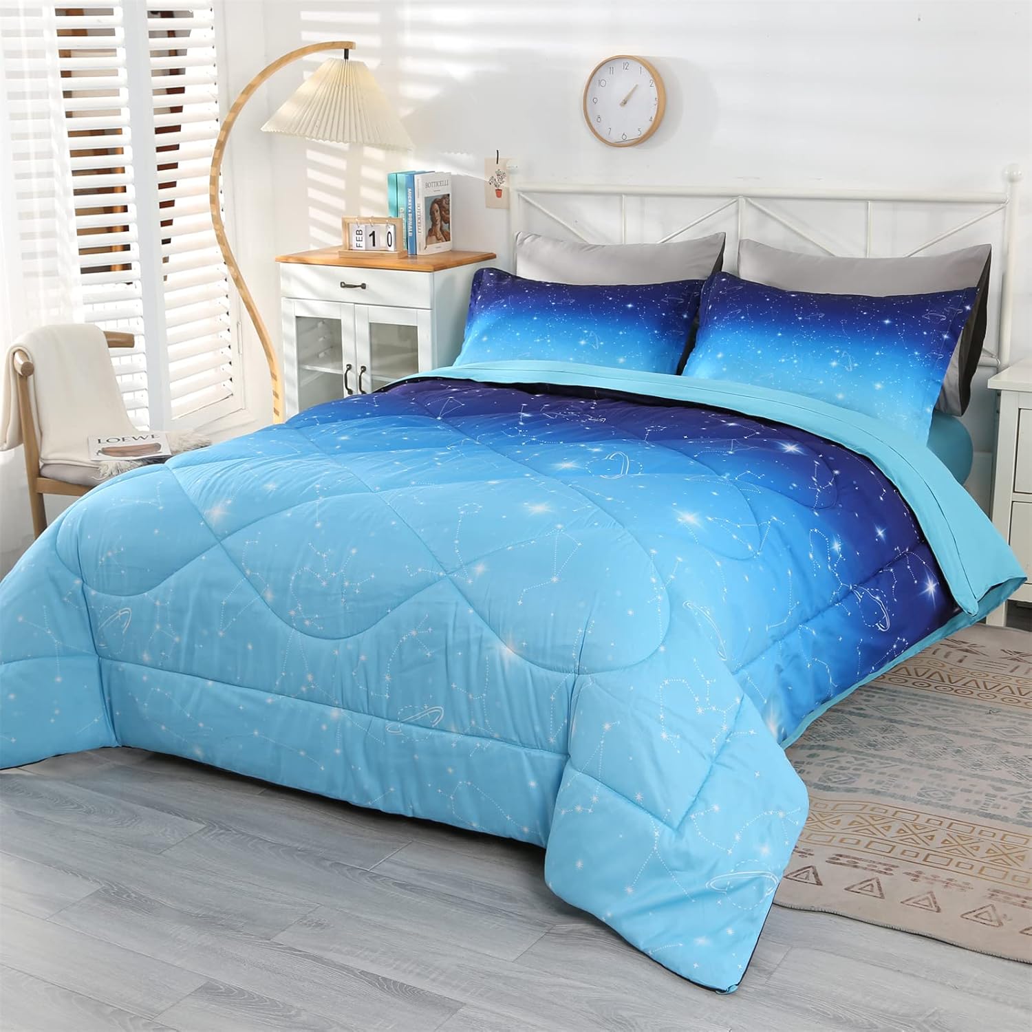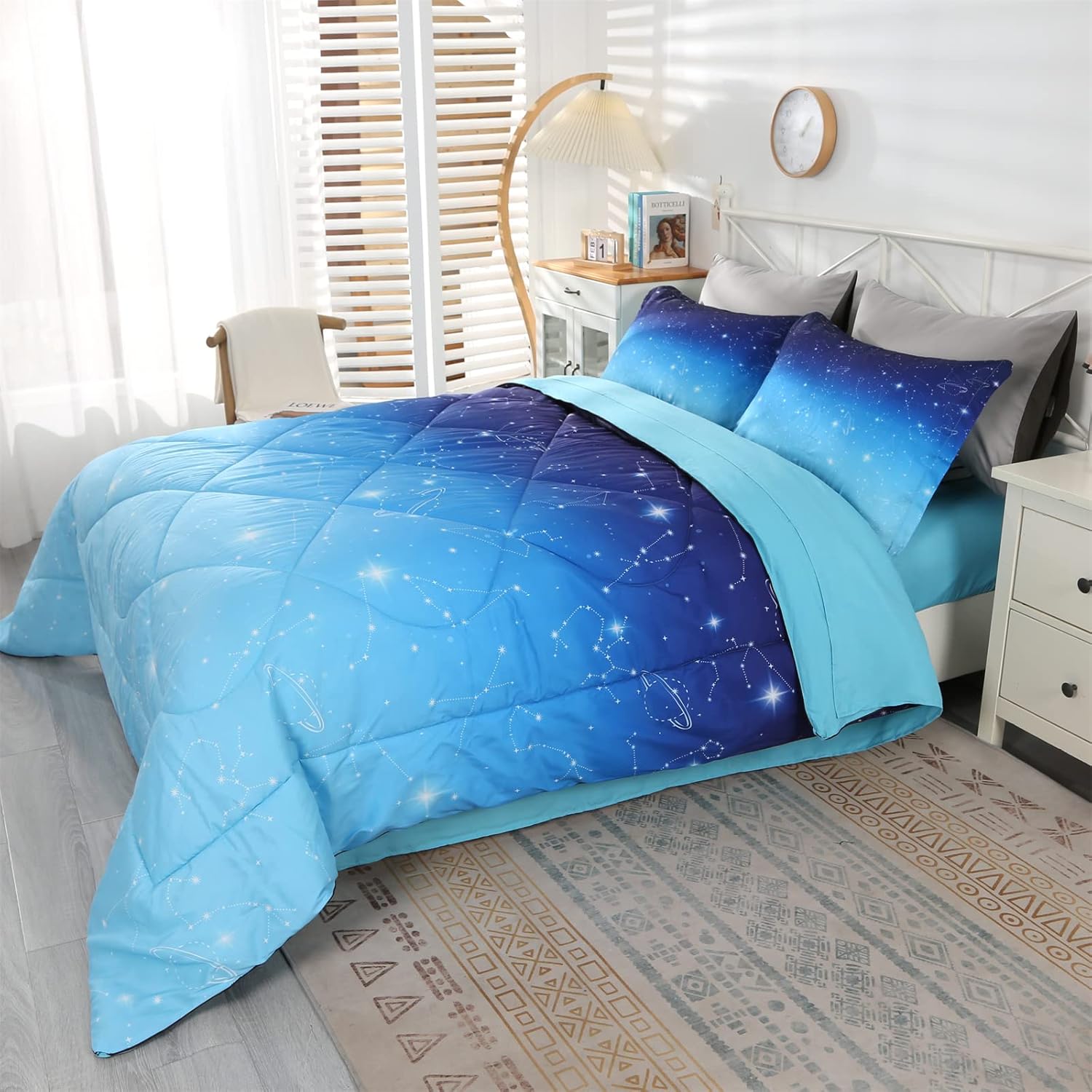 Transform your child's bedroom into a starry wonderland with the Wowelife Glitter Galaxy Comforter Set. This 5-piece bed in a bag set is designed to bring a touch of magic, comfort, and style to every bedtime. It's the perfect gift for any special occasion, offering a whimsical and eye-catching look that your little one will love.