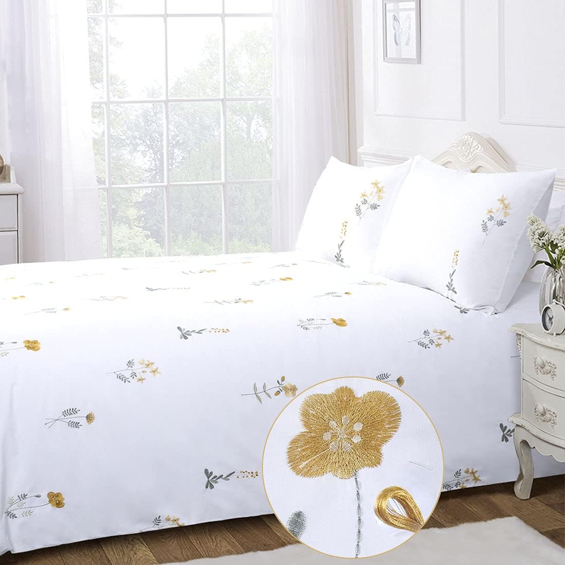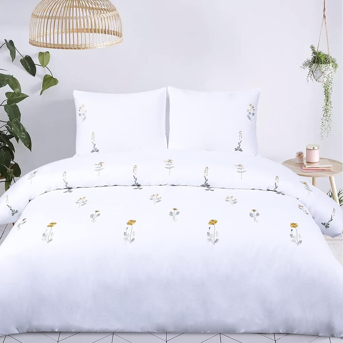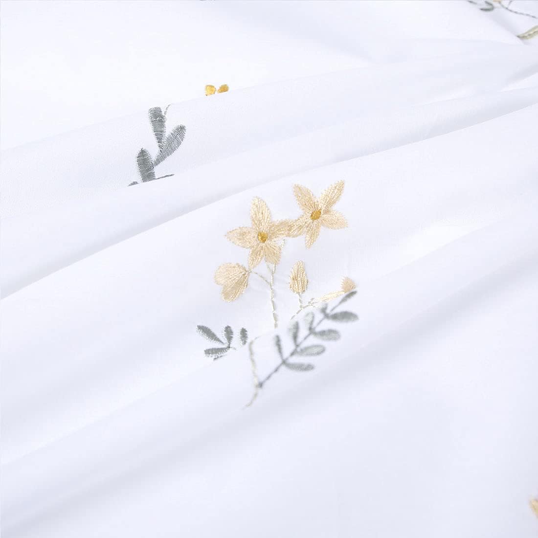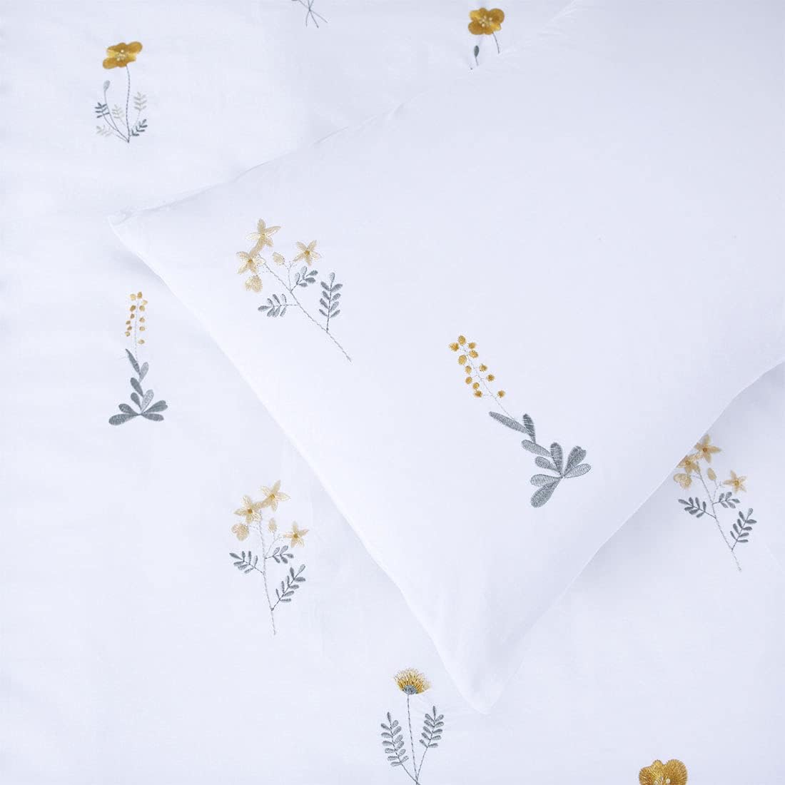 Crafted from 100% cotton, it offers a breathable and cozy experience every night. The vibrant yellow spring floral pattern is delicately embroidered on a crisp white base, making it a standout piece that infuses your room with warmth and elegance. Whether youâre opting for a modern or rustic décor, this set seamlessly fits into any style, creating a serene and inviting atmosphere.